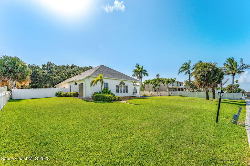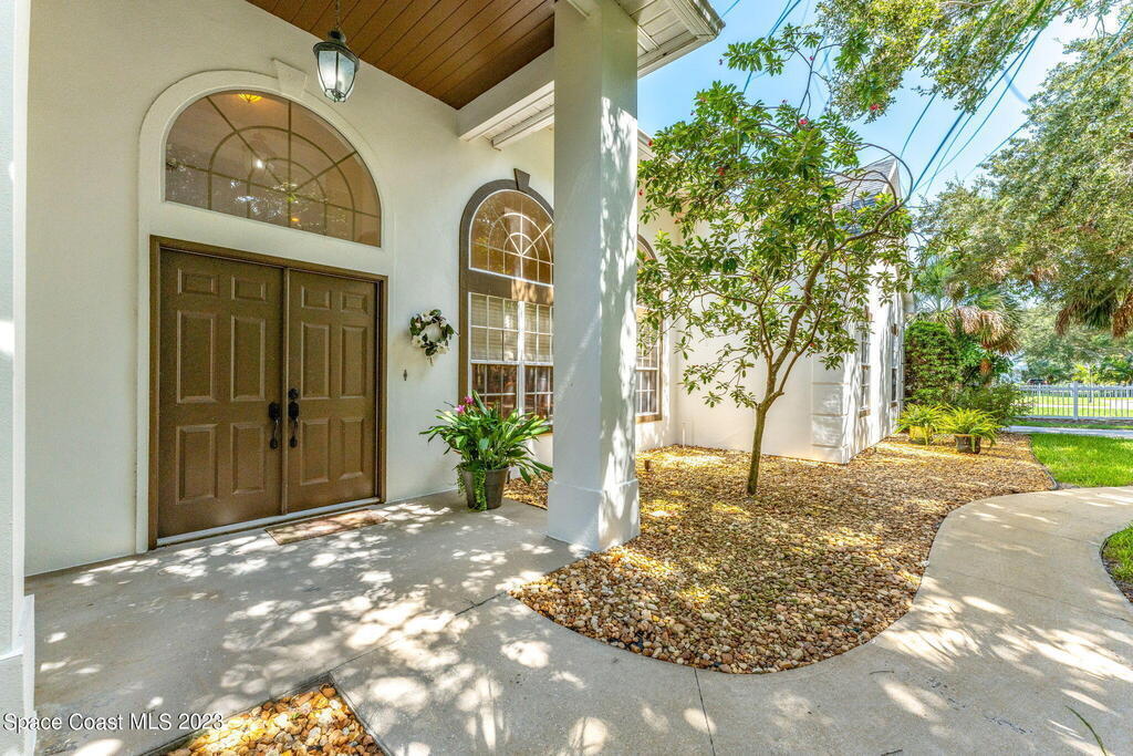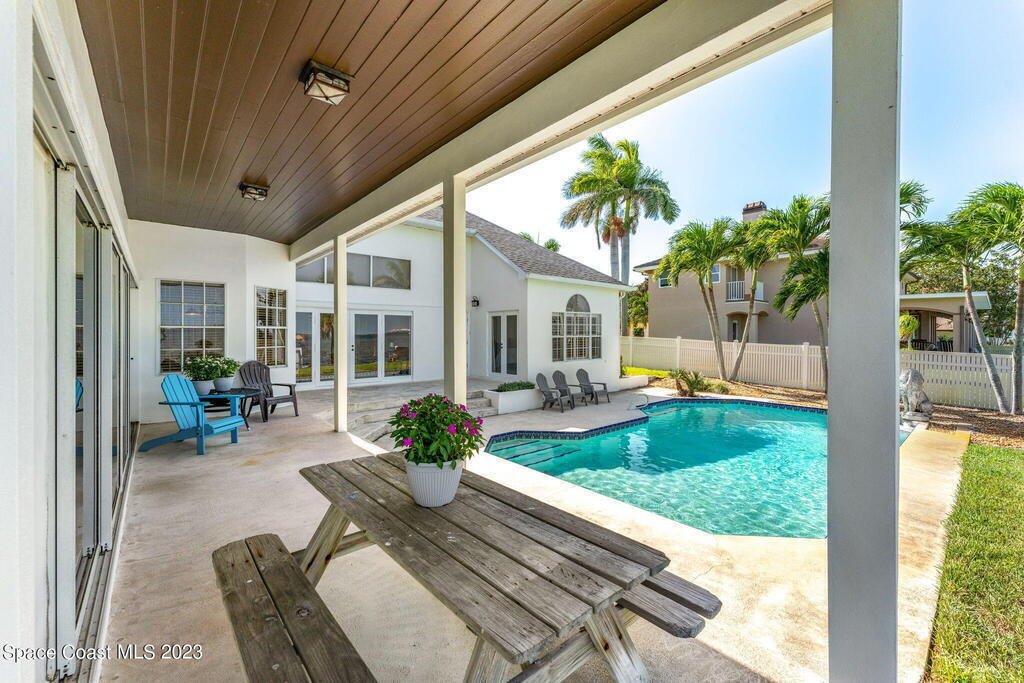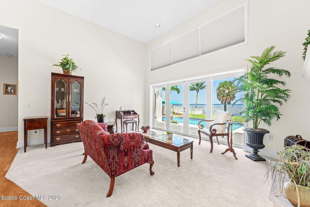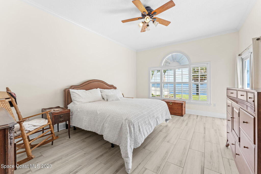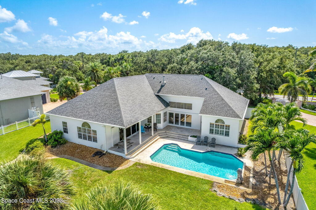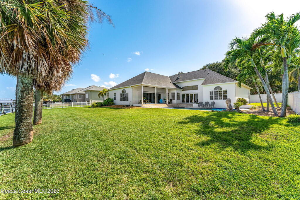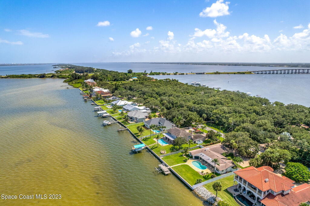 OVERLOOKING ONE OF THE WIDEST SPOTS ON THE BANANA RIVER & topped w/a 2019 roof! This half-acre beauty showcases a fountain pool, a big backyard, modern features & a coral stone fireplace. High ceilings crown hardwood & wood-look tile coursing through sunny living & dining, as walls of windows & glass doors open to an elevated patio & wondrous waterscapes. Granite, SS appliances & light wood cabinetry accent a bright b-fast bar kitchen. Charming bay-windowed casual dining offers lovely views. The owner's retreat flaunts gorgeous river vistas, patio access, a custom walk-in closet & a chic ensuite w/marbled stone sinks, a clawfoot tub & tiled shower w/pebbled flooring. The raised patio perches over a crystal-blue pool, the expansive backyard & broad Banana River scenes!