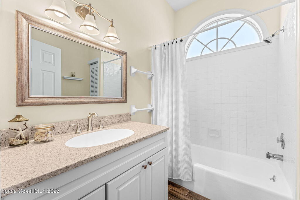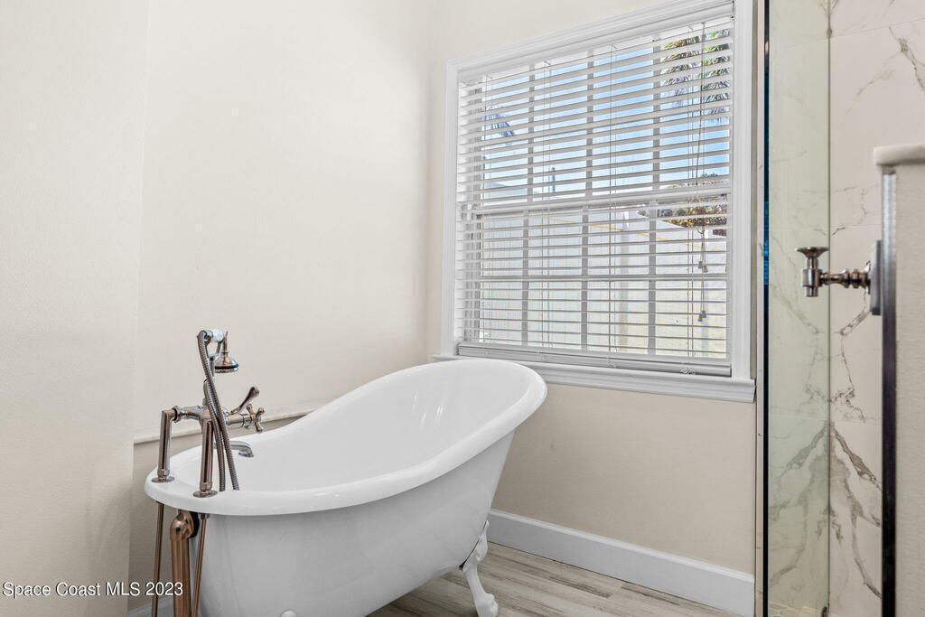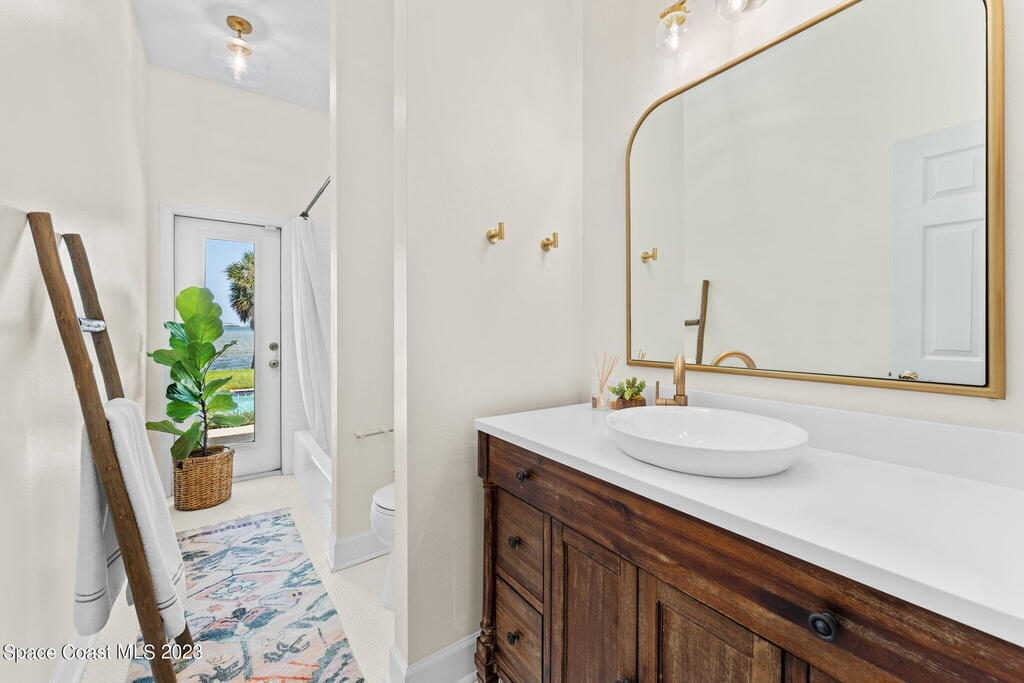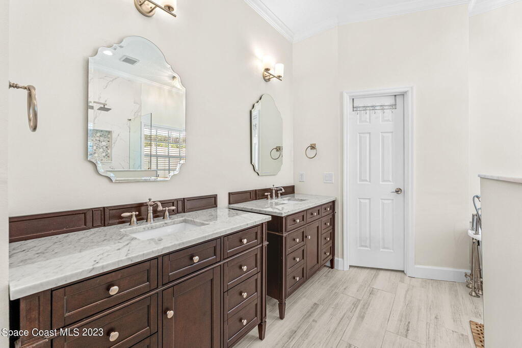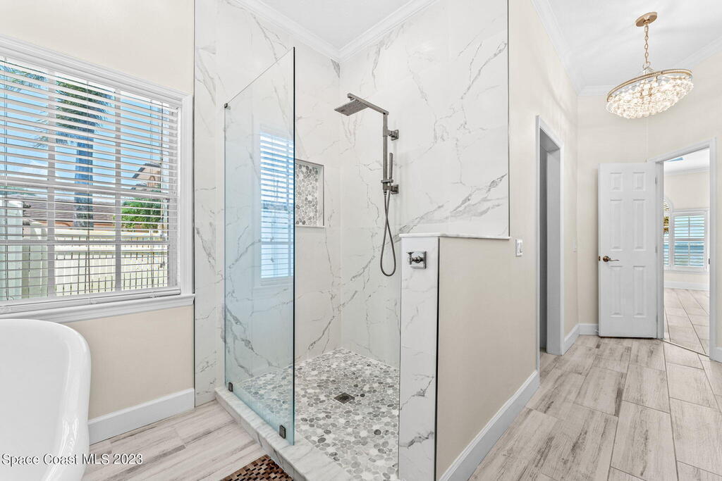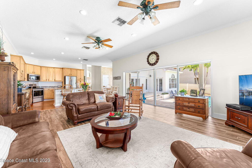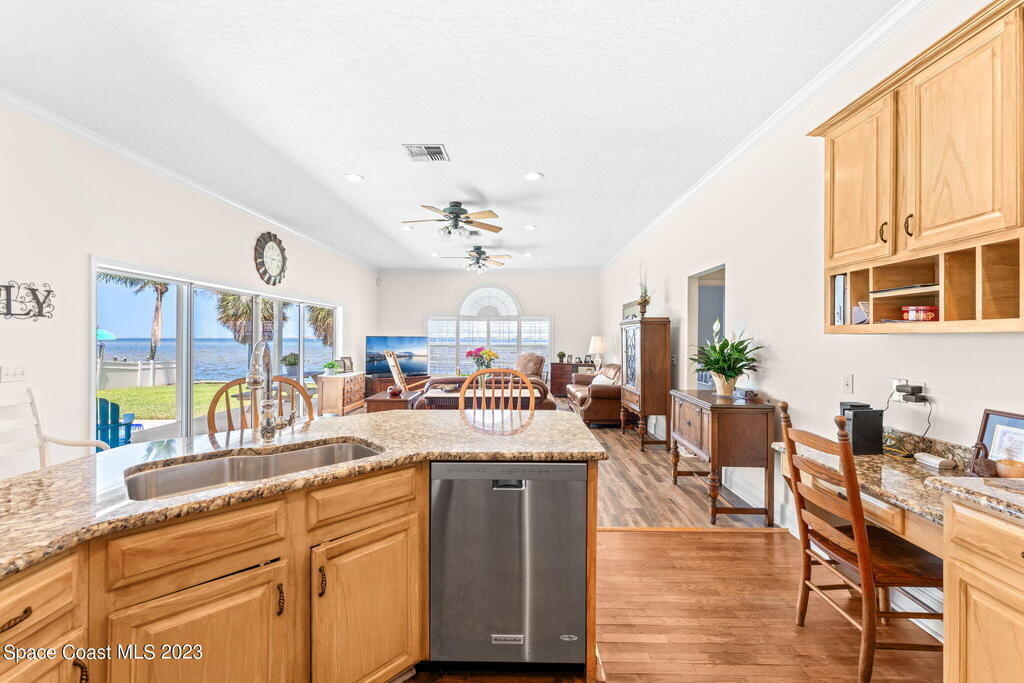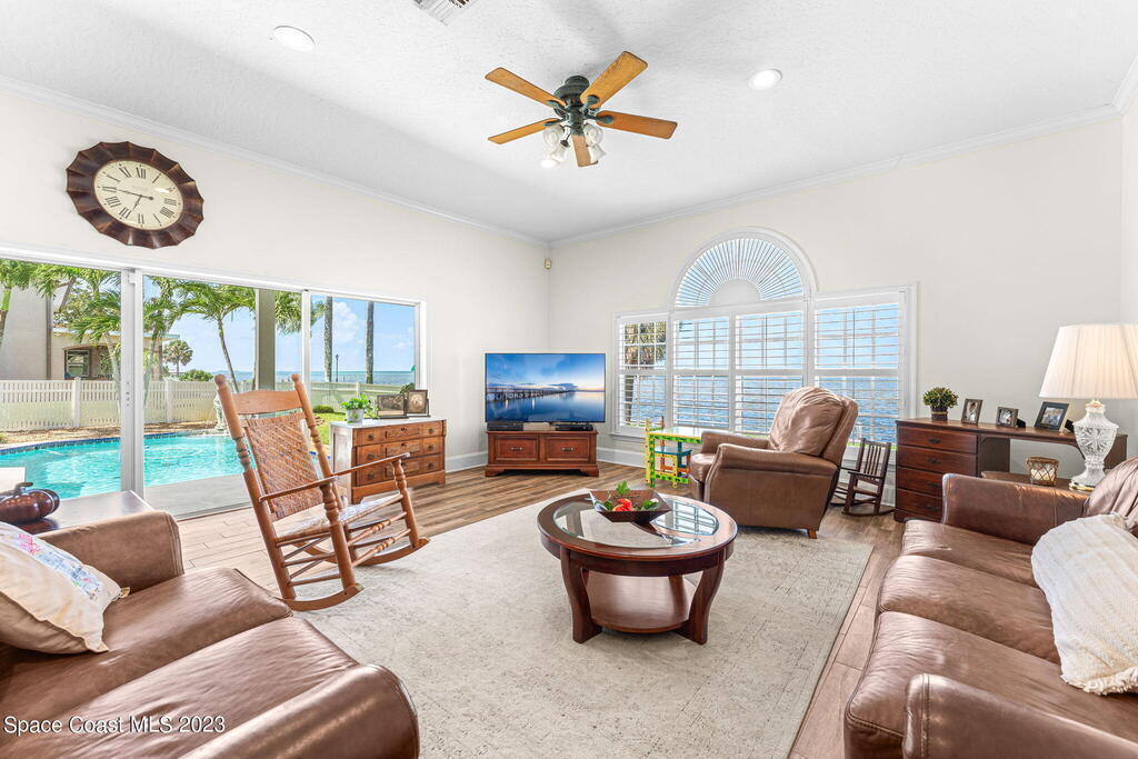 OVERLOOKING ONE OF THE WIDEST SPOTS ON THE BANANA RIVER & topped w/a 2019 roof! This half-acre beauty showcases a fountain pool, a big backyard, modern features & a coral stone fireplace. High ceilings crown hardwood & wood-look tile coursing through sunny living & dining, as walls of windows & glass doors open to an elevated patio & wondrous waterscapes. Granite, SS appliances & light wood cabinetry accent a bright b-fast bar kitchen. Charming bay-windowed casual dining offers lovely views. The owner's retreat flaunts gorgeous river vistas, patio access, a custom walk-in closet & a chic ensuite w/marbled stone sinks, a clawfoot tub & tiled shower w/pebbled flooring. The raised patio perches over a crystal-blue pool, the expansive backyard & broad Banana River scenes!