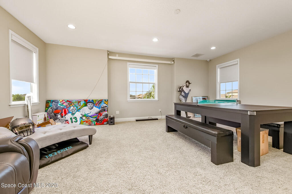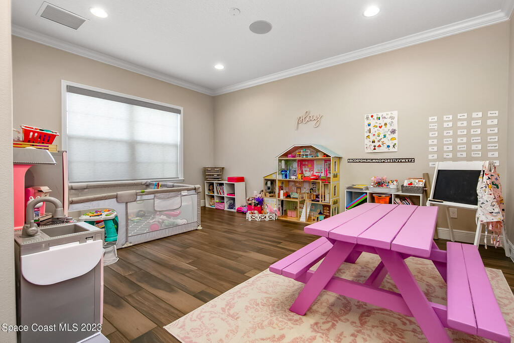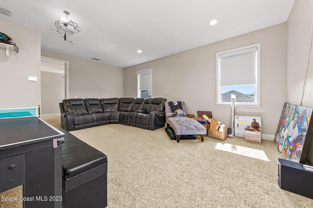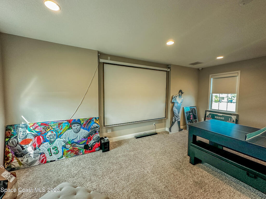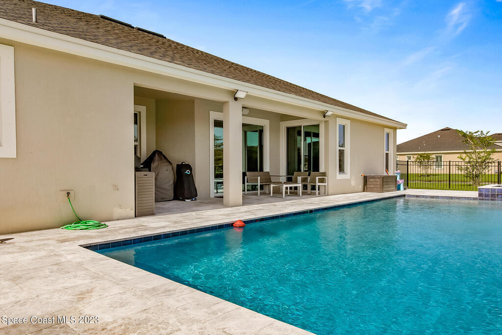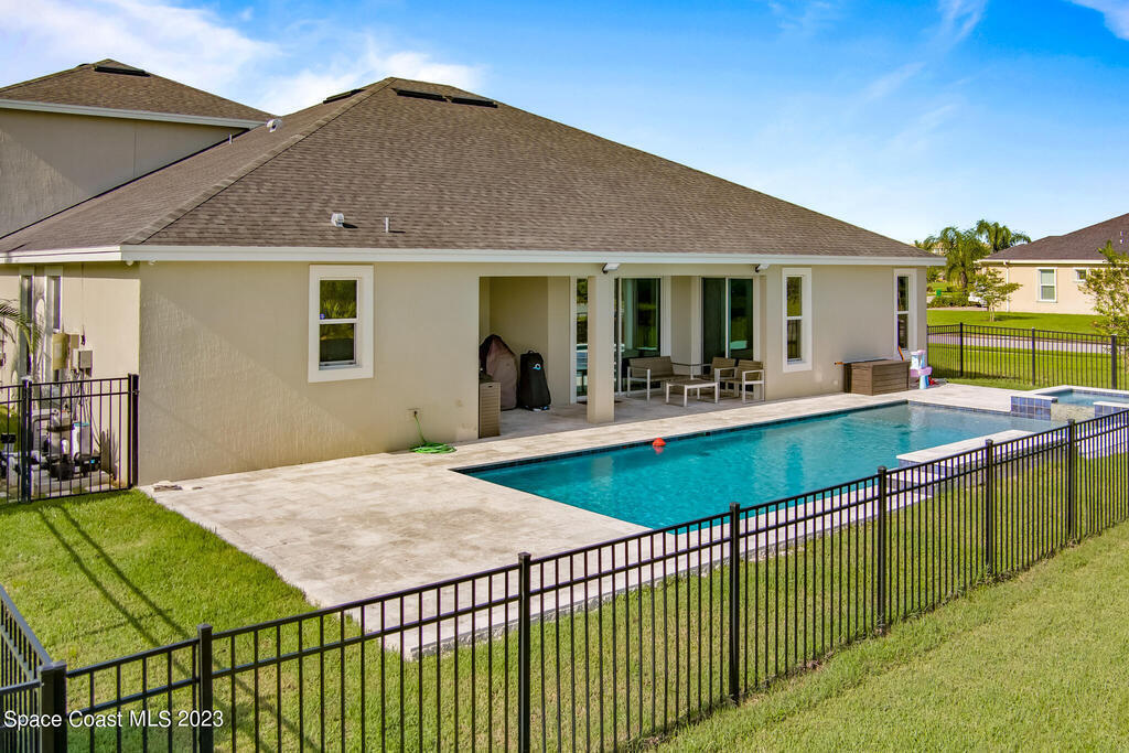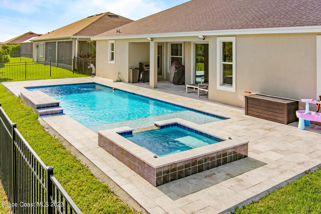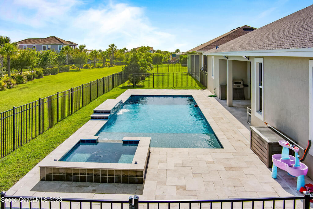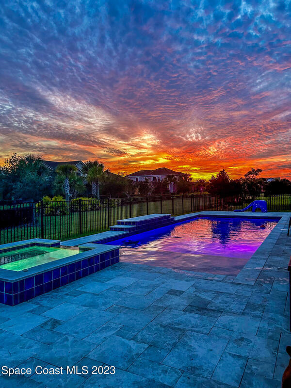 Welcome to your dream home! This 5-bedroom beauty, with the option to use the Den as a 6th bedroom, boasts a new custom heated pool on a spacious corner lot. Enjoy movie nights in the media room with a projector & screen, & relax in the living room with a custom fireplace and surround sound throughout the house and backyard.The home features a royally sized master bedroom & walk-in closets for all bedrooms. Park your cars comfortably w/ a 4+ car driveway, & entertain guests on the fenced-in sun deck and Travertine patio.The kitchen is a chef's delight w/ 42' designer cabinets, quartz countertops, & gas stove. Feel secure w/ a high-end security system, & enjoy the epoxy-floored garage equipped w/ a car EV charger & 2 AC units. new gas tankless water heater, storm surge protection, & surround sound inside & out.