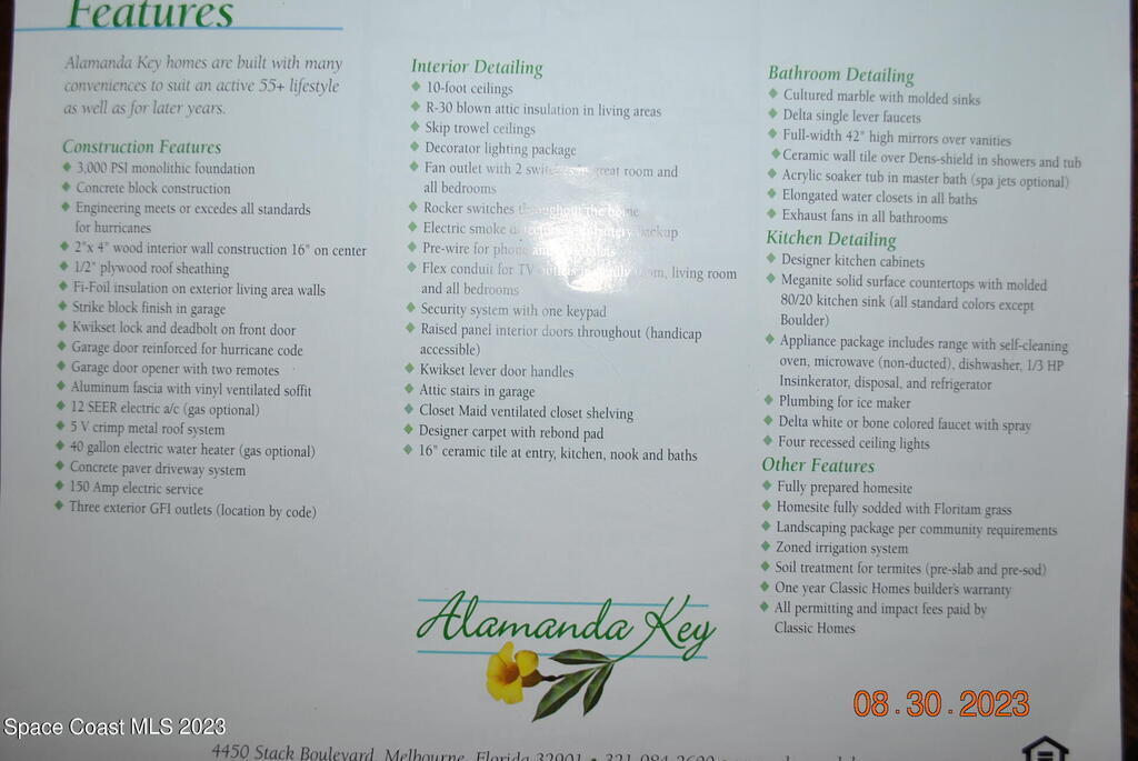 KEY WEST INSPIRED COMMUNITY OF ALAMANDA KEY...EVERY DAY IS RESORT STYLE LIVING IN THIS GATED 55+ ACTIVE COMMUNITY!- Coastal Living At Its Best! HOA...Includes Community Club House, Exercise / Fitness Area, Pool, Hot Tub, Tennis Court, 2 Community Lakes with Walking Paths...Monthly HOA fee also includes full lawn & irrigation maintenance. START LIVING THE CAREFREE FLORIDA LIFESTYLE in the most popular KEY serene community that is conveniently located near local dining & shopping and just minutes to local beaches and I-95. Features 5 V Crimp Metal roof, 6'' seamless gutters, 3000 PSI monolithic foundation, steel reinforced concrete block walls, reinforced garage door, R-30 blown attic insulation, granite countertops in the kitchen