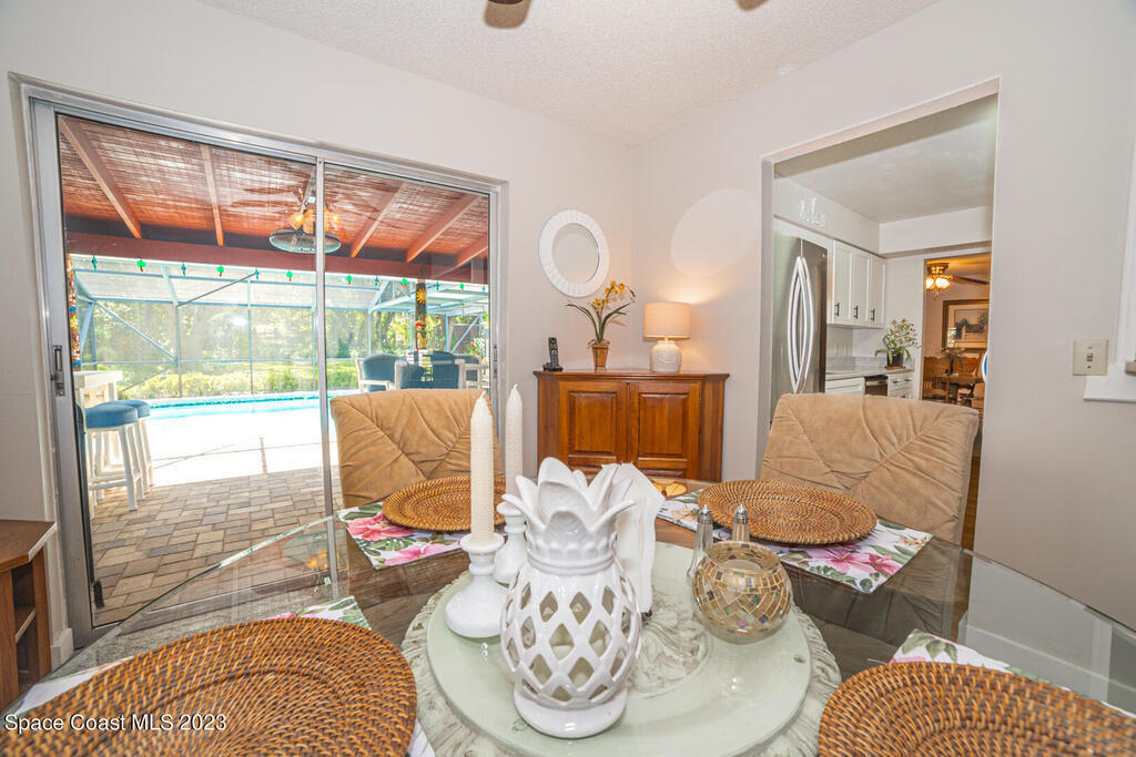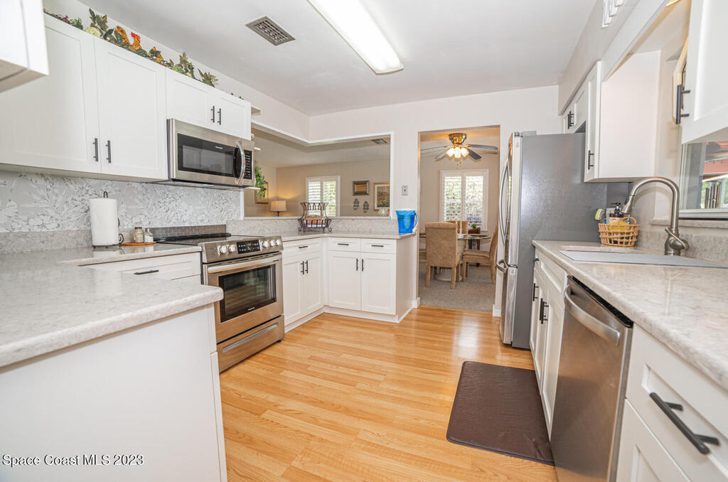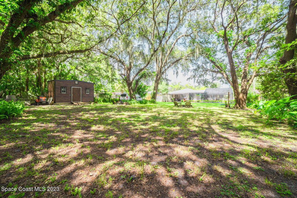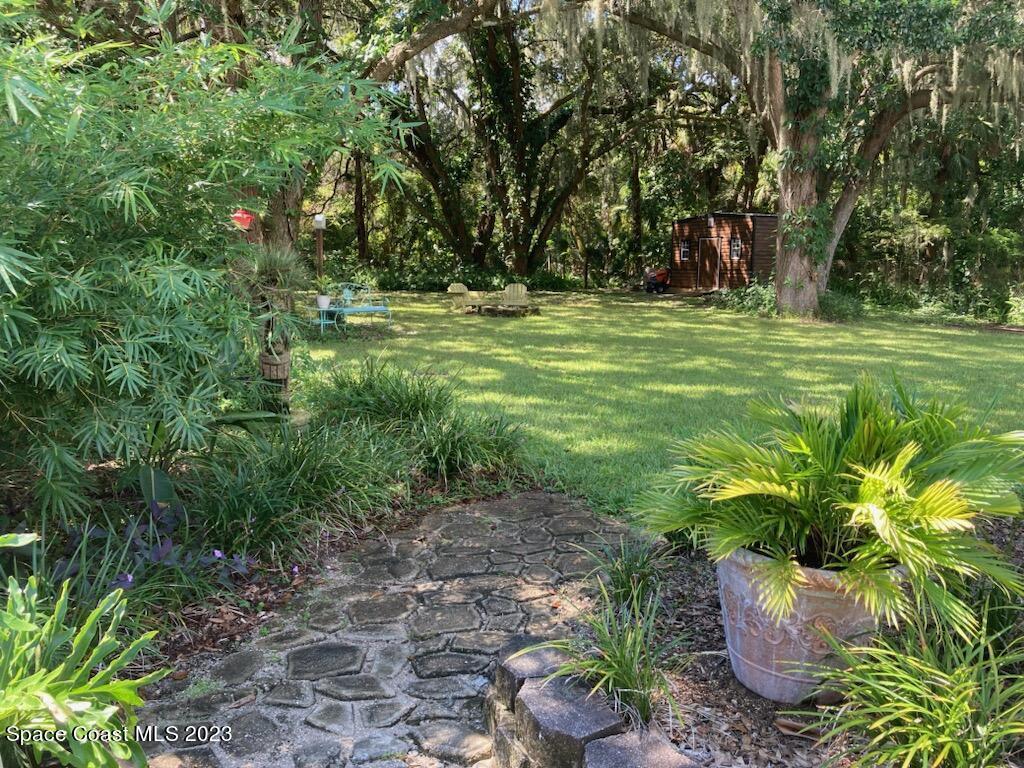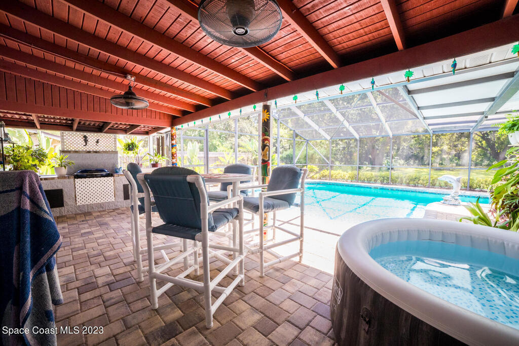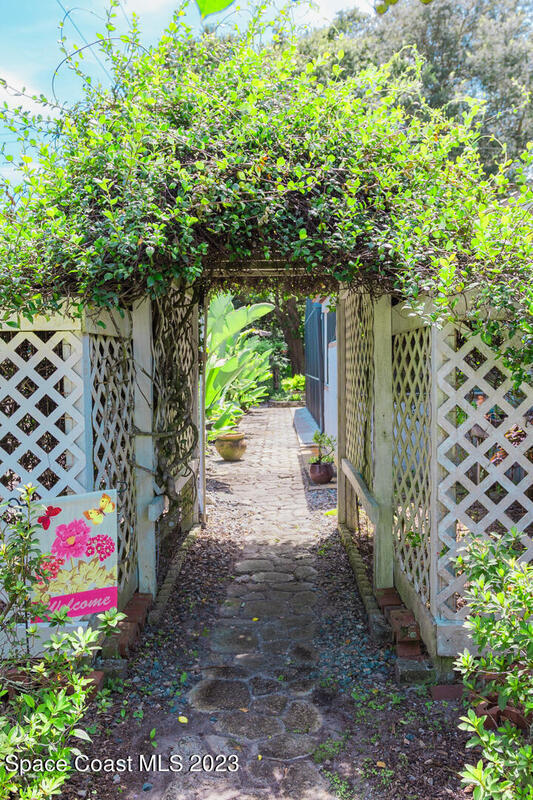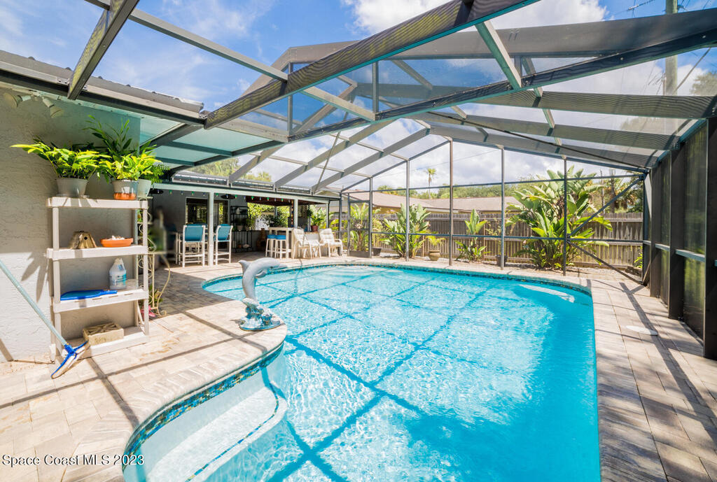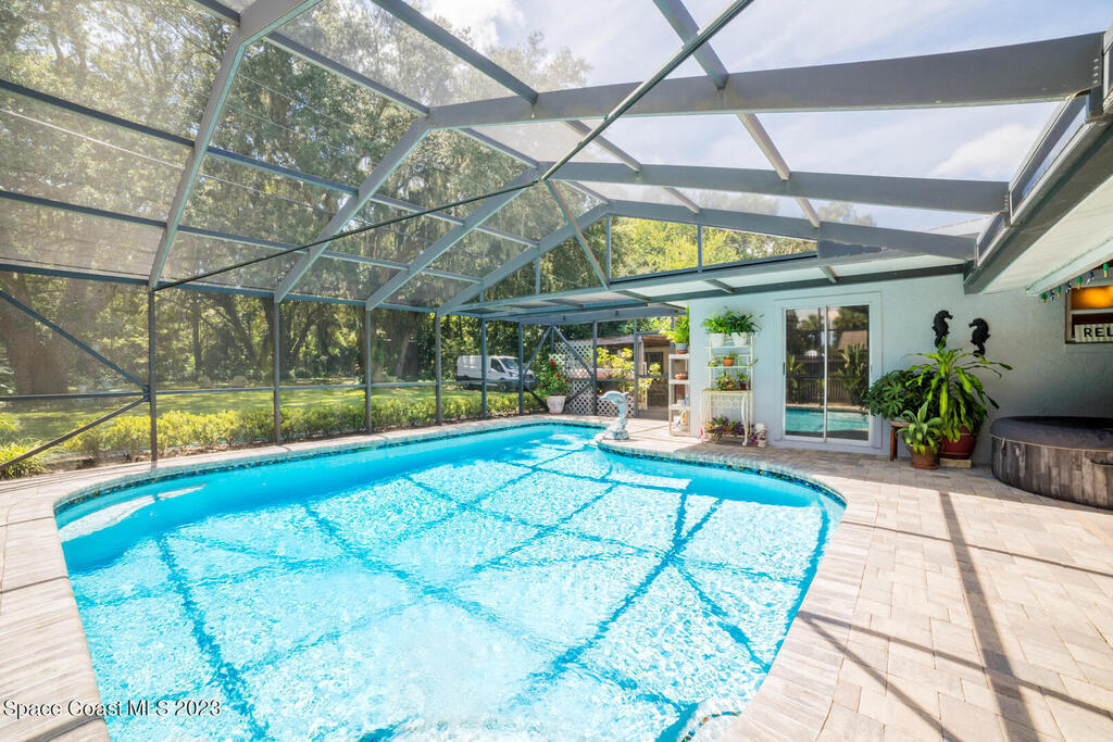 This enchanting 3-bedroom, 2-bath residence offers a unique blend of city living convenience and the tranquil charm of country life. Imagine stepping into your dream kitchen, with sleek stainless steel appliances seamlessly blend with the elegance of pristine quartz countertops. Elegant plantation shutters adorning the windows. Outside, a saltwater pool, spa and stylish paver deck create a private resort-style retreat, surrounded by meticulous landscaping on a generous double lot adorned with majestic oak trees and a cozy fire pit. Wander through the inviting jasmine arch to a world of privacy and serenity. Situated close to Playalinda Beach, Nasa and city amenities, this home is the epitome of peaceful and convenient living.