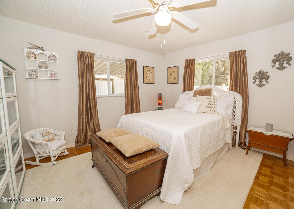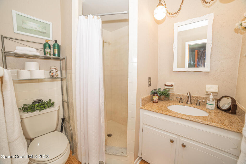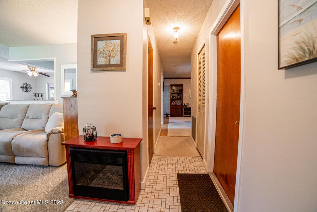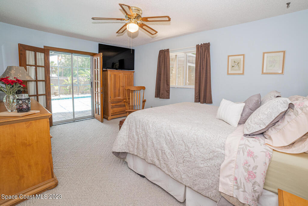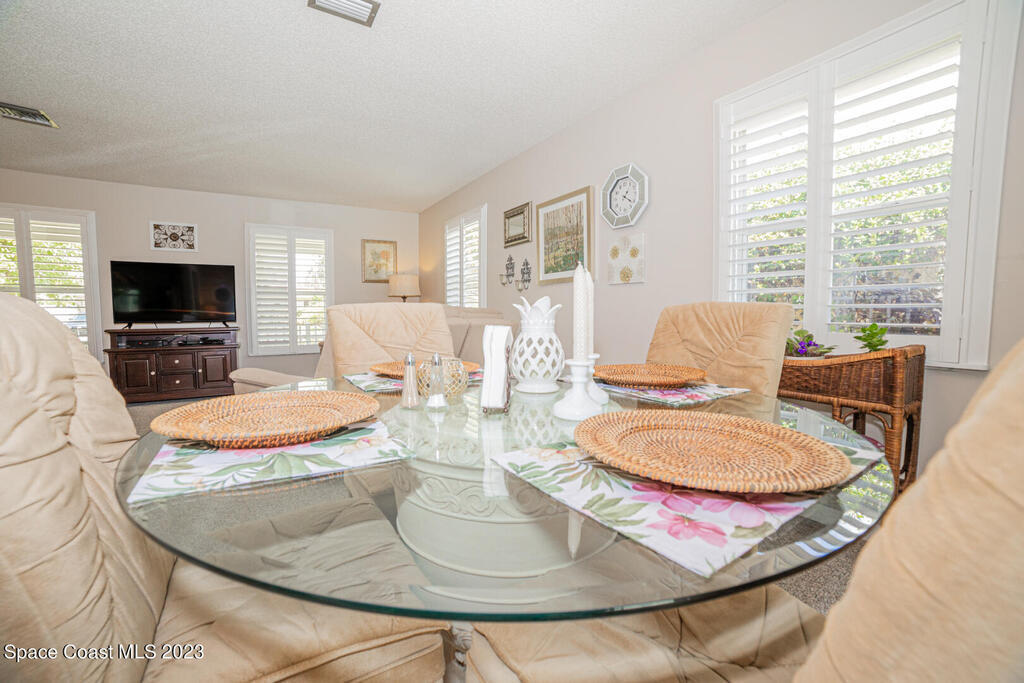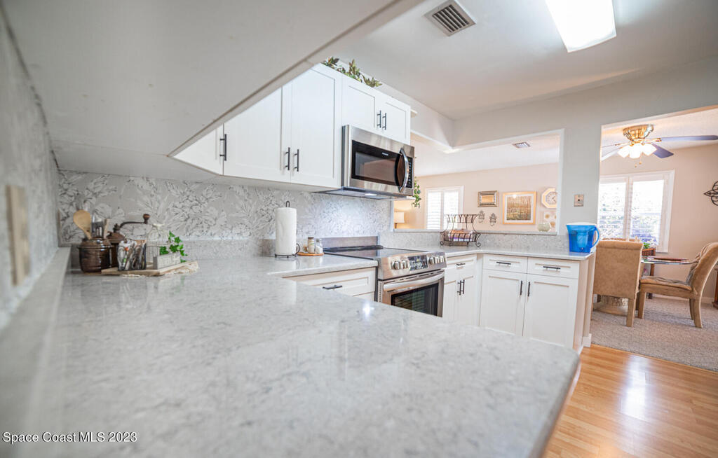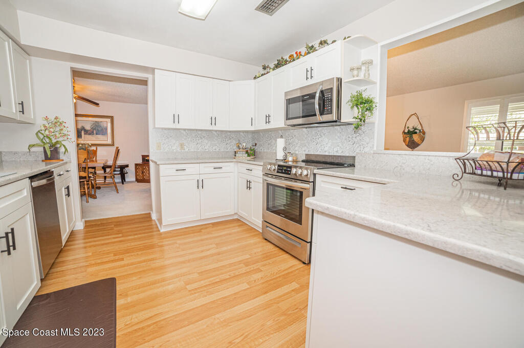 This enchanting 3-bedroom, 2-bath residence offers a unique blend of city living convenience and the tranquil charm of country life. Imagine stepping into your dream kitchen, with sleek stainless steel appliances seamlessly blend with the elegance of pristine quartz countertops. Elegant plantation shutters adorning the windows. Outside, a saltwater pool, spa and stylish paver deck create a private resort-style retreat, surrounded by meticulous landscaping on a generous double lot adorned with majestic oak trees and a cozy fire pit. Wander through the inviting jasmine arch to a world of privacy and serenity. Situated close to Playalinda Beach, Nasa and city amenities, this home is the epitome of peaceful and convenient living.