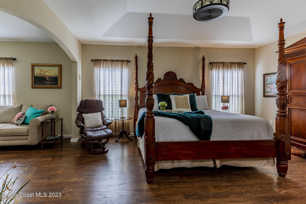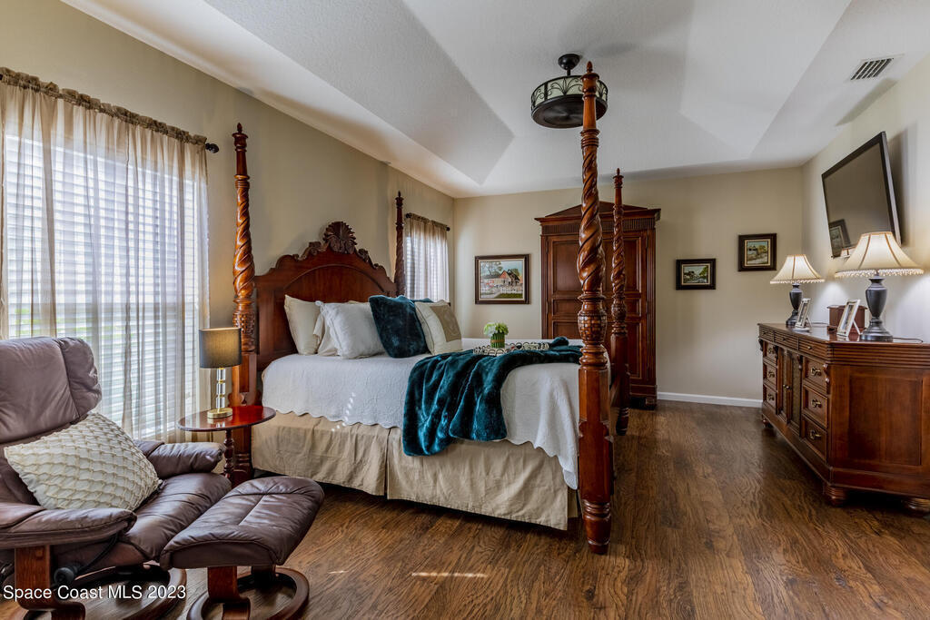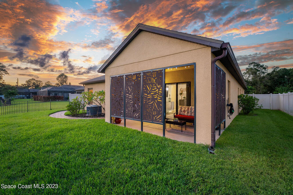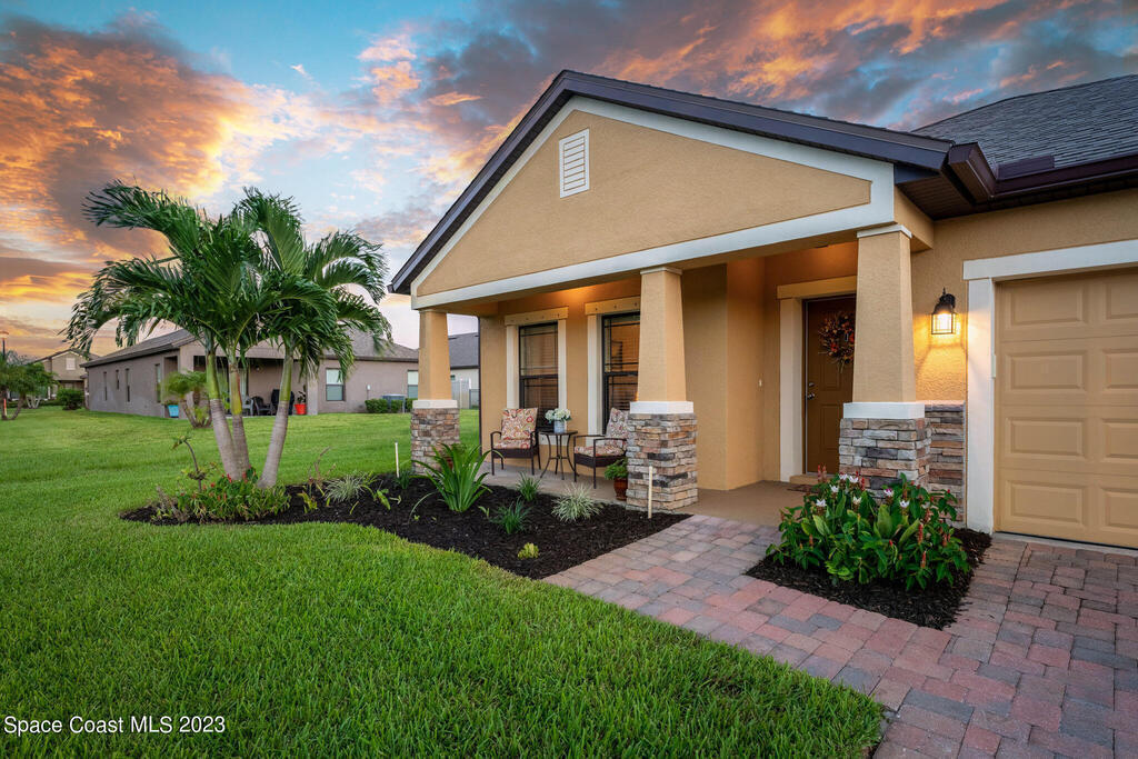Experience lakeside luxury in Melbourne's exclusive gated community of only 33 homes! Bathed in the abundant Florida sunshine, this residence offers a harmonious fusion of modern comfort and coastal charm with fresh landscaping and front porch perfect for chats with new friends. Upon entering, you'll be welcomed by formal living spaces, where natural light dances through the windows off the warm wood floors. The adjoining chef's kitchen, complete with granite countertops and SS appliances, beckons you to indulge your culinary passions. The master suite is a sanctuary of relaxation, featuring an en-suite bathroom and ample closet space with custom organization, boasting an extra room that can be used as an office space, work out area, nursery or zen space.