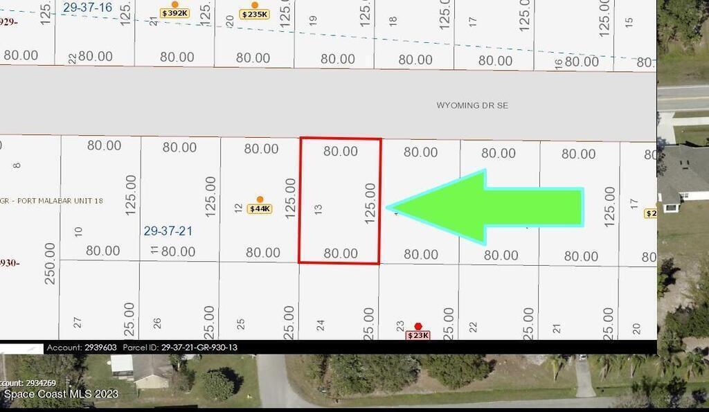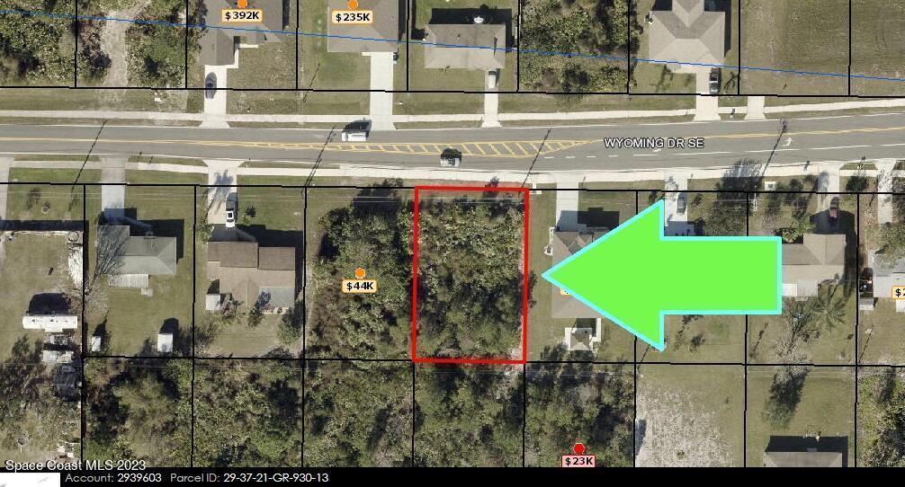 0.23 acre buildable single family residential lot with city water available in Port Malabar Unit #18. Great location in the SE Section of Palm Bay near the Bayside Lakes Subdivision. From this lot you are just 2.6 miles -8 minutes- to Publix Shopping, 4.1 miles -10 minutes- to Bayside High and WestSide Elementary Schools, 10.5 miles -26 miles- to the Melbourne Square Mall, and just 15.3 miles -27 minutes- to the beaches in Indialantic. From Exit #173 of I-95 go east on Malabar Road. Turn right on Babcock Street and proceed south for 2.2 miles. Turn right on Wyoming Drive. The lot will be on the left