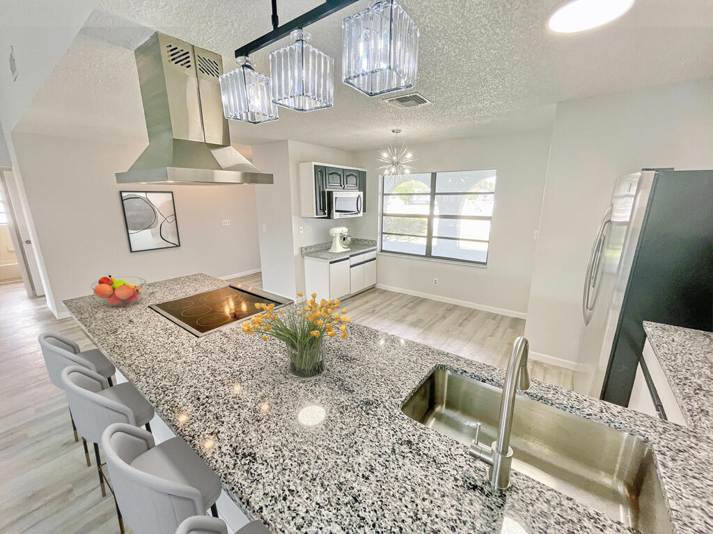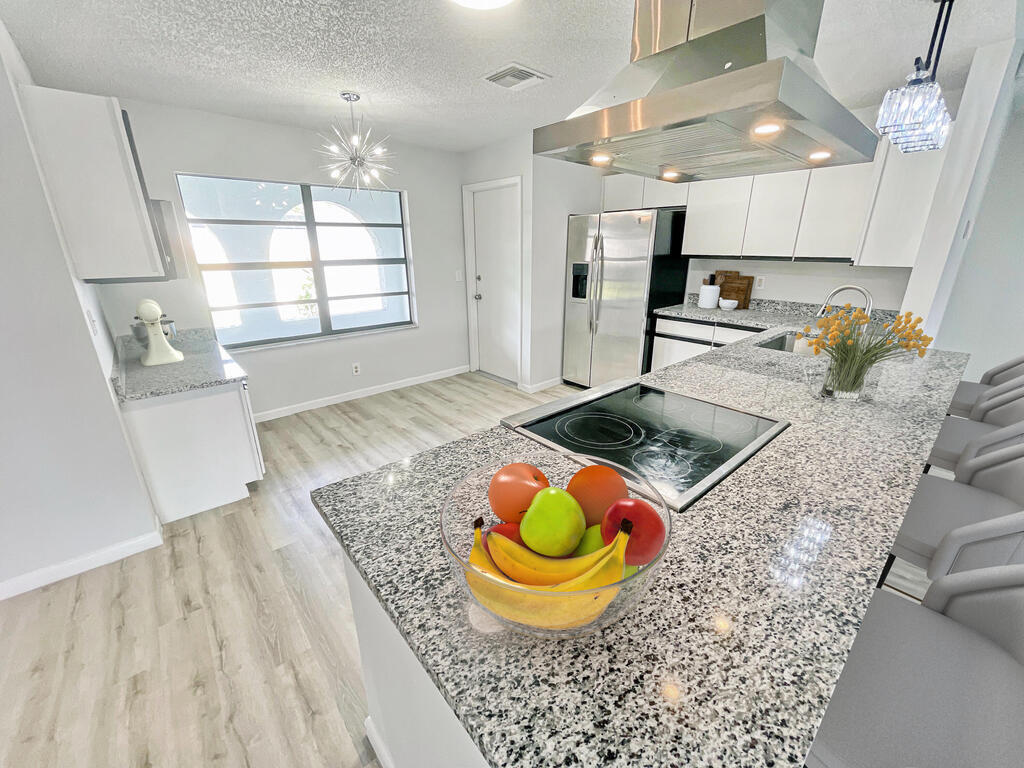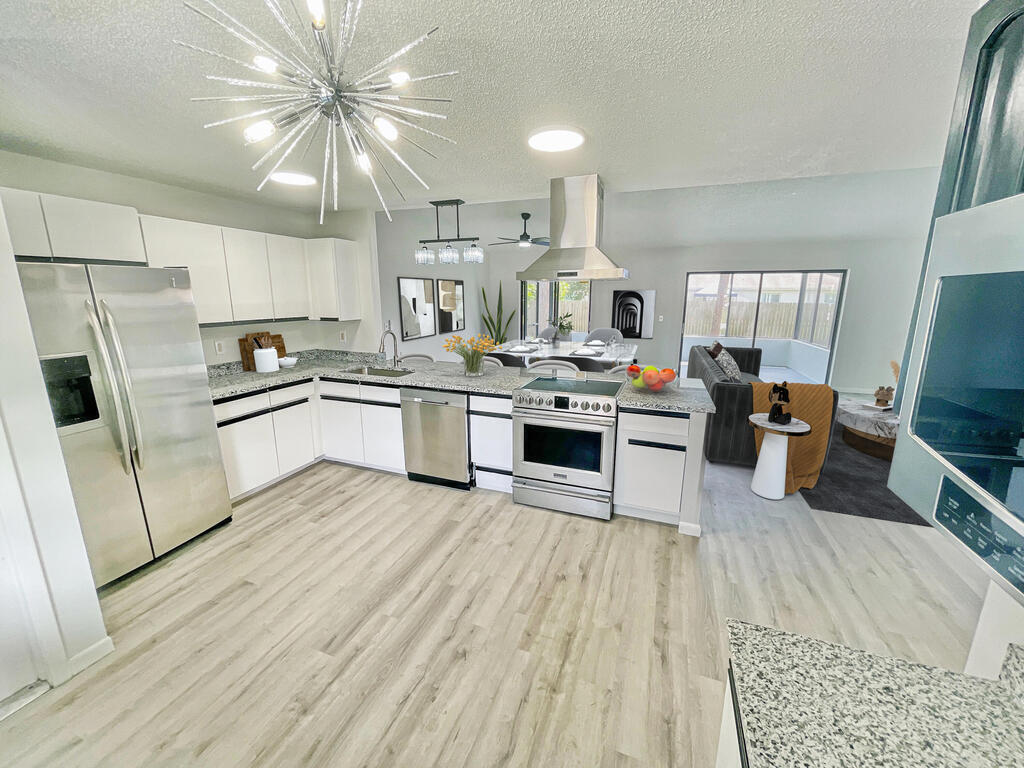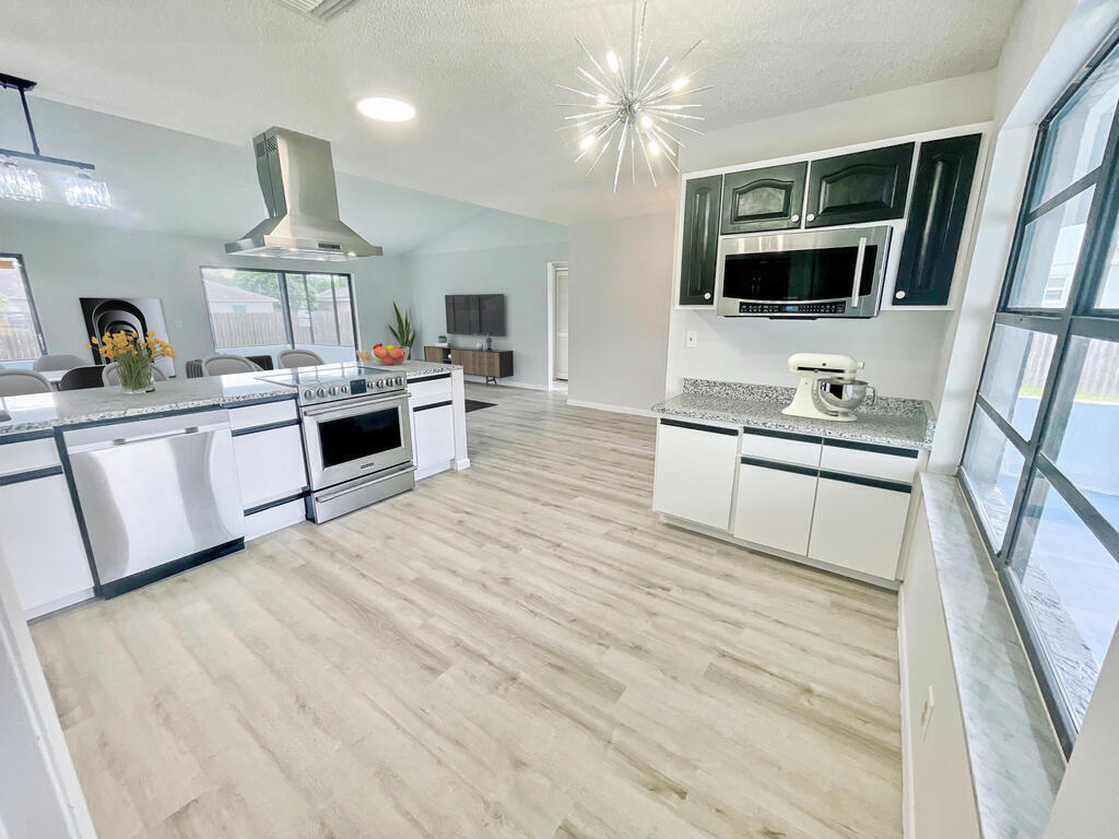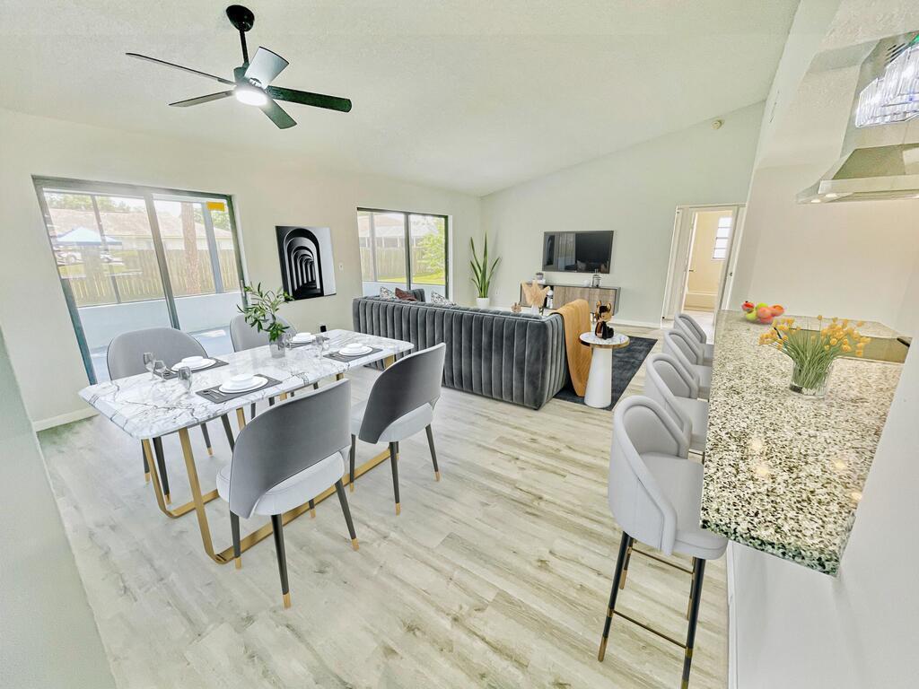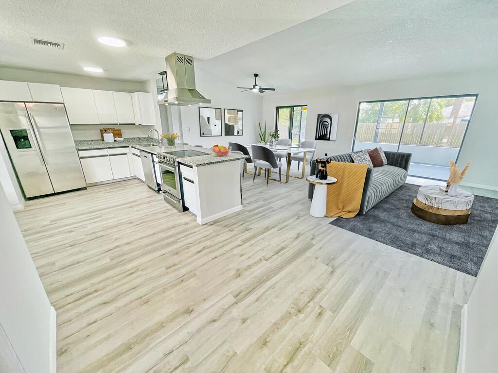 Spacious and beautiful move-in ready concrete block home with open floor plan and high ceilings. Excellent upgrades! Freshly painted interior & exterior, roof installed 2023, NEW LVP flooring, NEWER AC, Newer Hot water heater, & 2 car garage. Enter through your nice and airy front porch. Large formal living room greets with a view of the excellent backyard with 2 sliding doors that lead to the newly screened back patio and patio slab perfect for grilling. UPDATED, sophisticated and modern design large kitchen with NEW granite countertop, elegant coffee bar, NEW faucet & sink plus stainless steel appliances and brand new floating range hood. Huge family room with sliding glass doors overlooking the backyard. Must See!