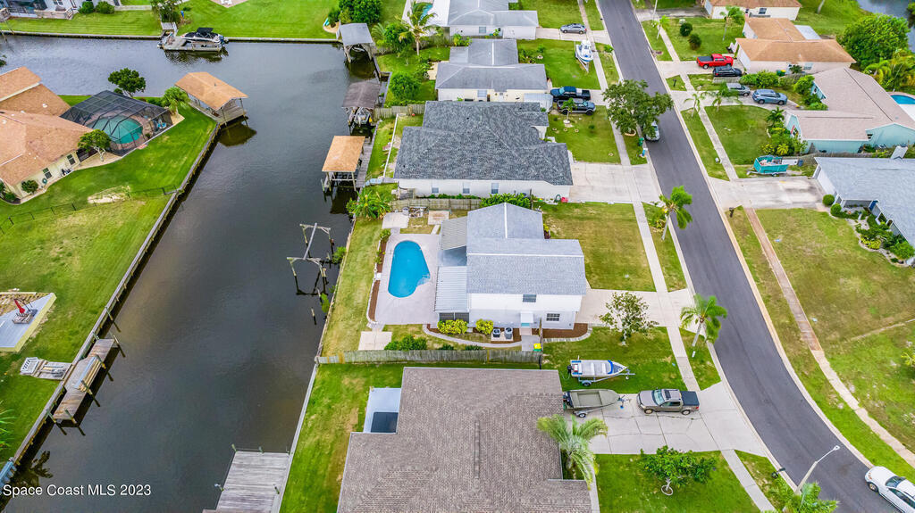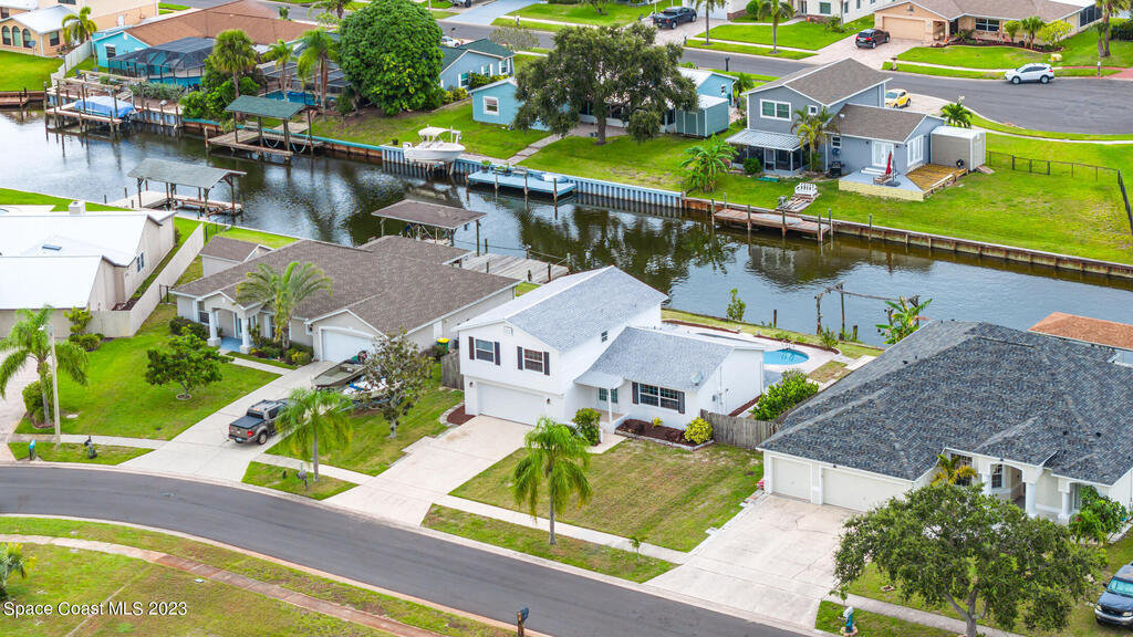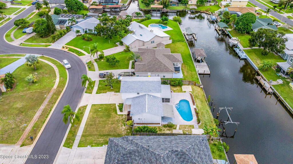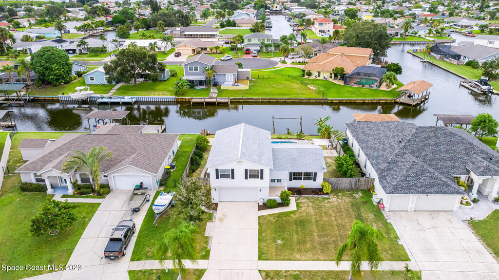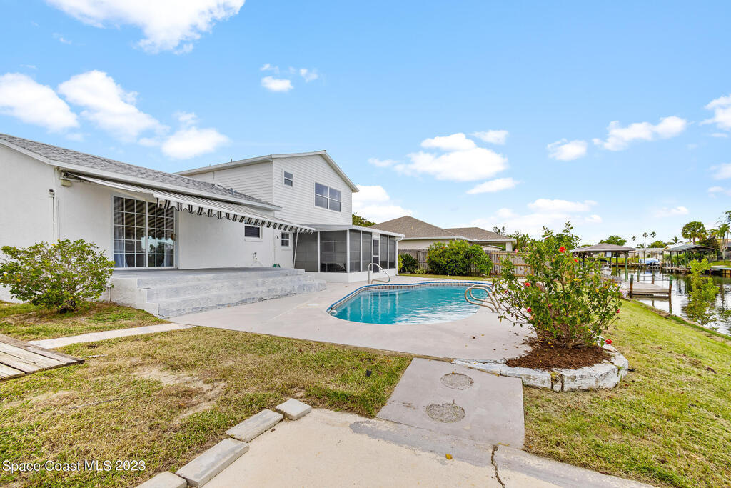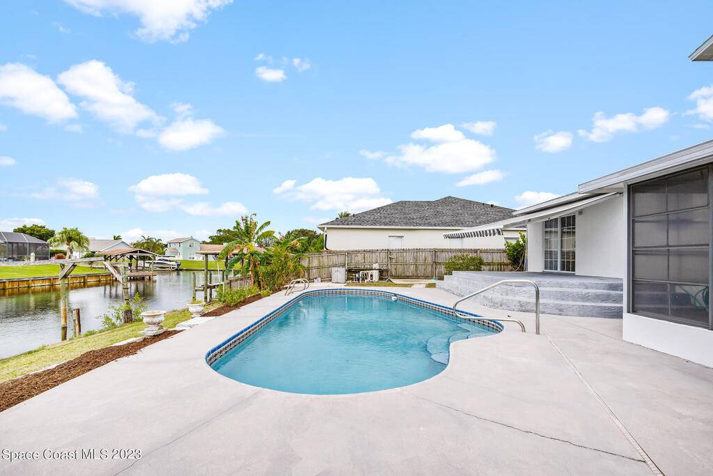 Come live the FLORIDA dream on the water! Step into this beautiful canal front pool home. Minutes to Port Canaveral, SPACEX and BLUE ORIGIN. NO cast iron pipes here, ROOF 6 yrs old. Freshly painted inside and out, new carpet in the bedrooms. This 4 bedroom 3 full baths split level gives you lots of space to spread out, with possible 5th bedroom utilizing the downstairs family room and full bath with sliders to the screen enclosure. Slider in dining room gives you the cool breeze coming off the canal. Enjoy your morning coffee on the pool patio watching the dolphins and manatees swim by. This home is located in the back of the neighborhood for added privacy.
