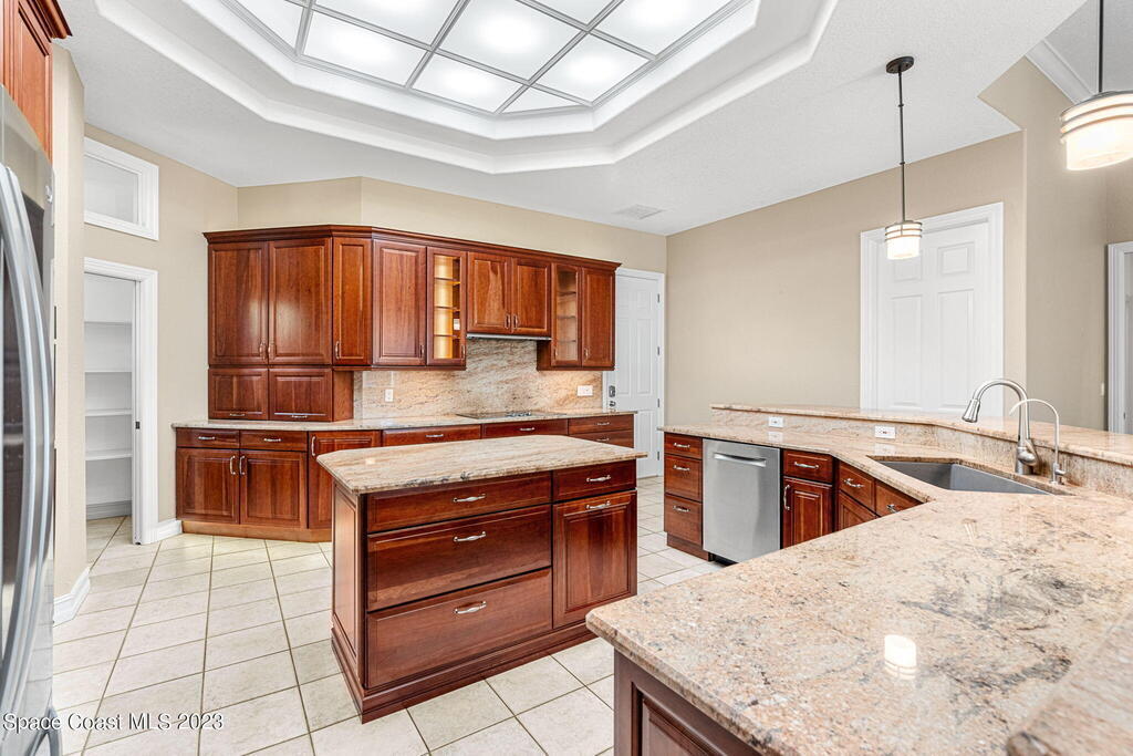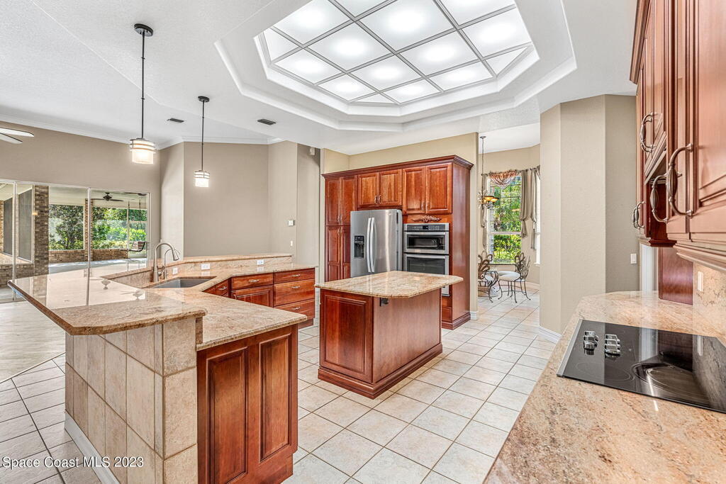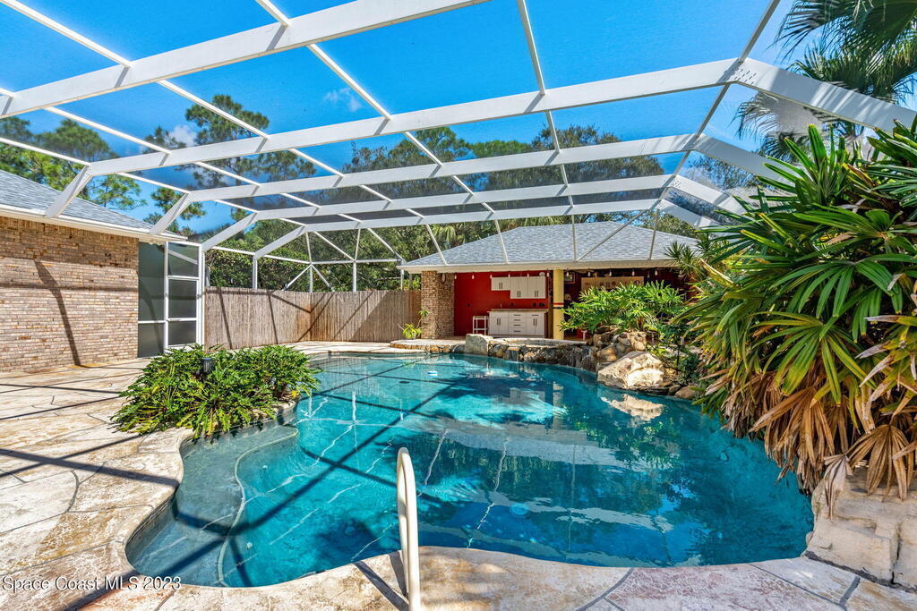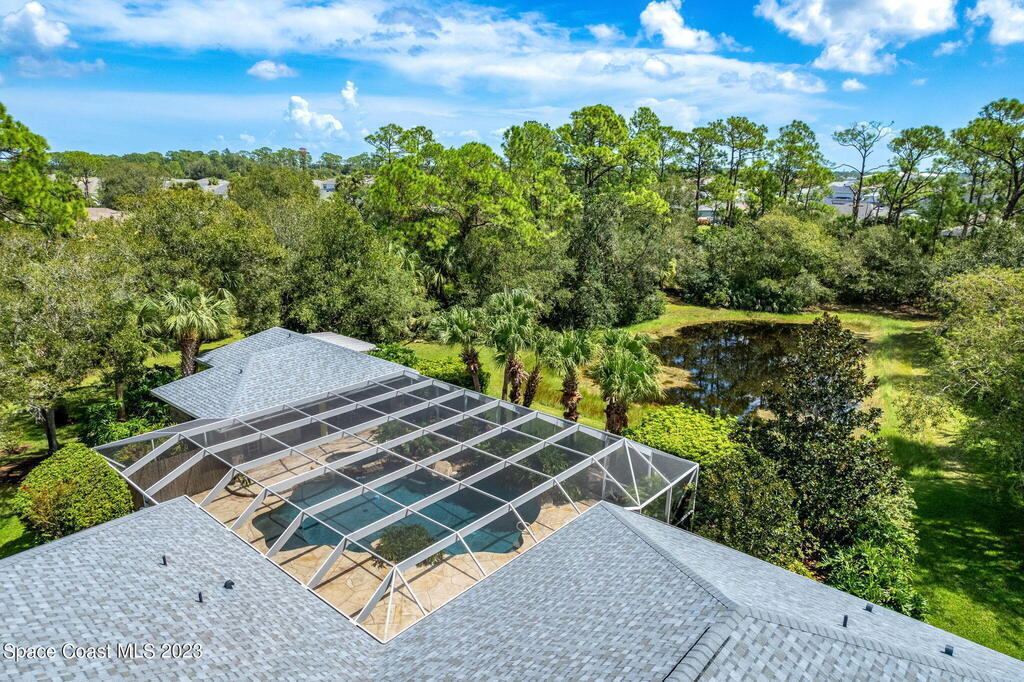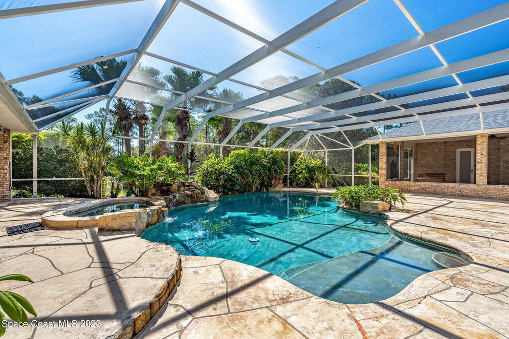 This woodsy spread is a parade of peaceful places, outrageous outdoor fun & upgraded interior delights! The property encompasses a handsome brick home topped w/a BRAND NEW roof & 3,135sqft of screened-in backyard space exhibiting a covered lanai, a rock waterfall pool & spa, an impressive open-air bar & entertainment arena, a cabana bath & a detached garage. A pond & forested hammocks add to the indulgent outdoor experience. Tall crown-molded ceilings outline tile & LVP floors. A granite island kitchen is stocked w/SS appliances, upper & lower cabinet lighting & a walk-in pantry. The family rm is customized w/a built-in media center & triple slider to the lanai. Two walk-in closets, double granite sinks, a jetted tub & tiled shower w/dual heads create a deluxe owner's suite.