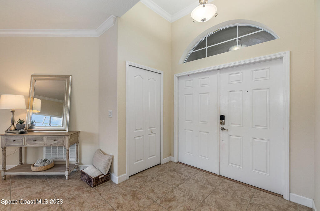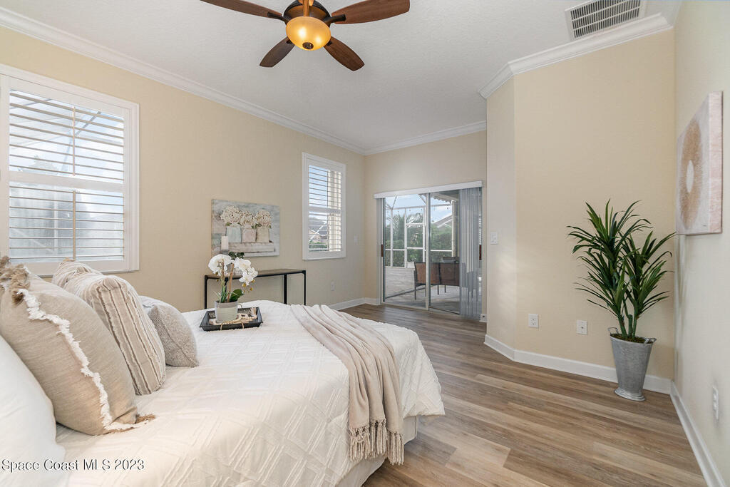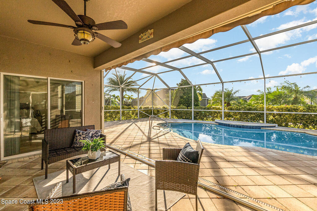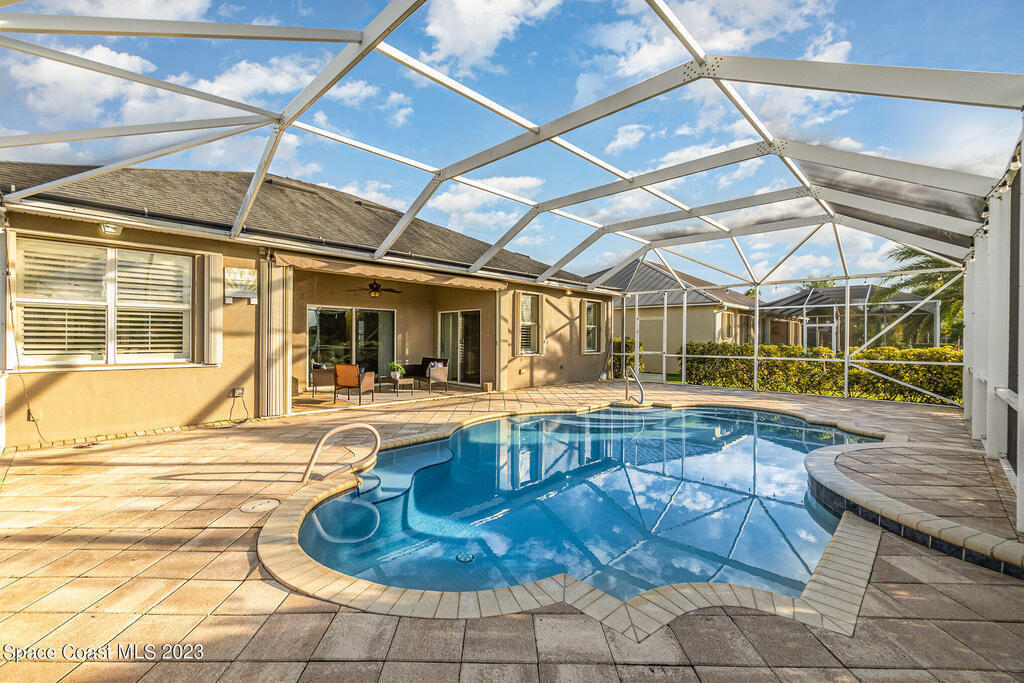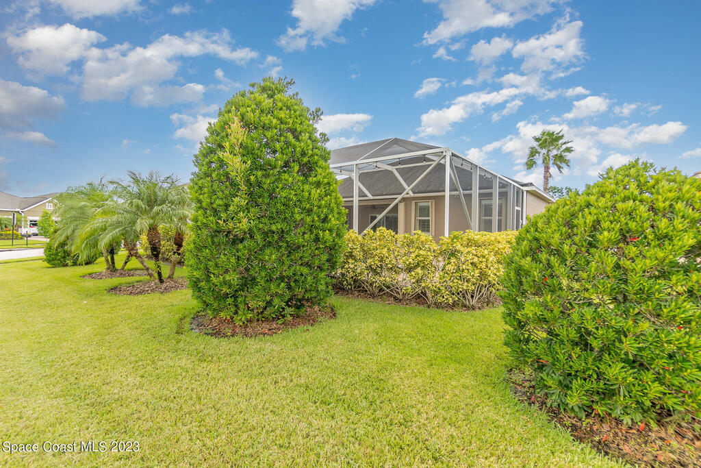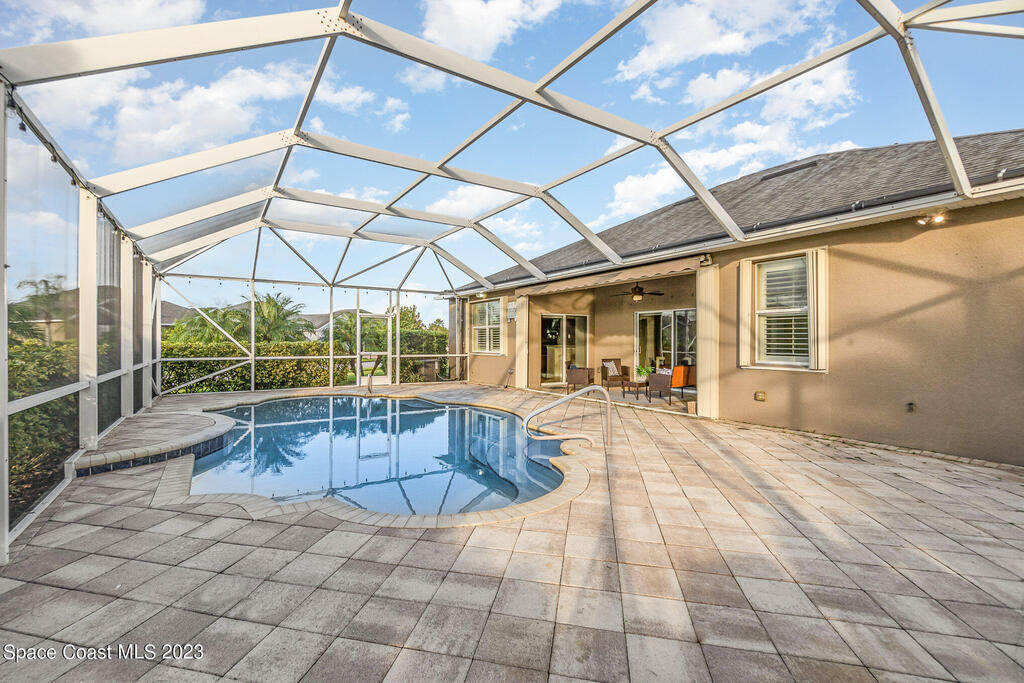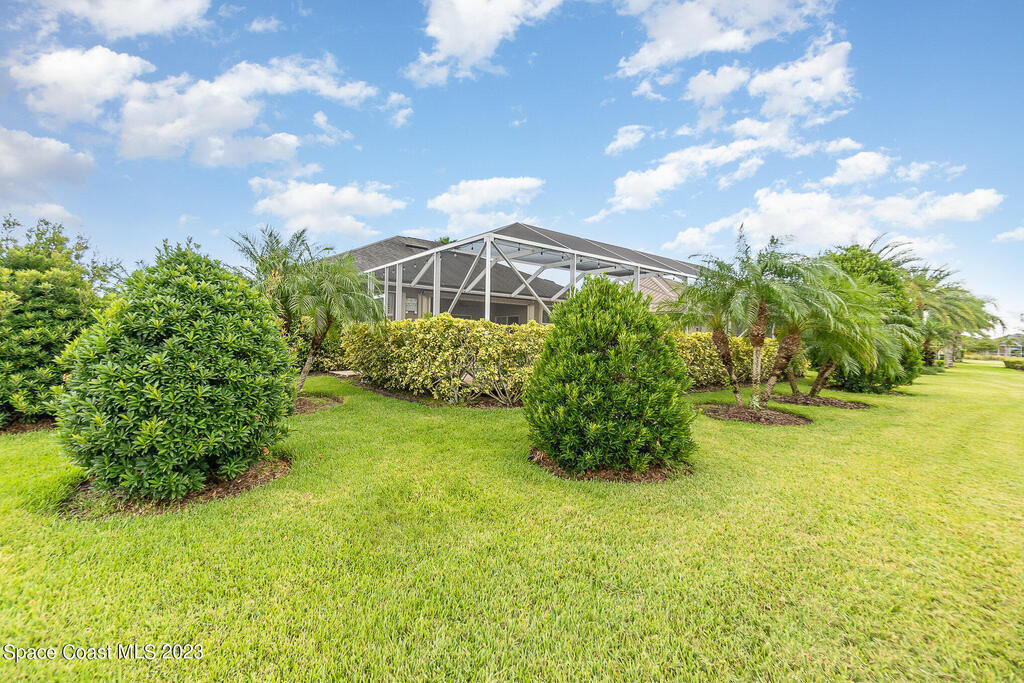 Discover resort style living at it's finest in this gorgeous pool home nestled on an extra large prime lot in the most prestigious, sought after 55+ resort style community in Viera. Don't miss an opportunity to own a spacious home with gorgeous solar heated pool with waterfall, accordion storm shutters, custom plantation shutters and more. Beautiful double entry doors leading to the large family room overlooking a private oasis and large lanai. Sliding doors lead to much more luxurious living space. Elegant master suite with his and hers sinks, private water closet and large walk in shower. Granite counter tops throughout, stainless steel appliances, raised panel cabinets, security system.