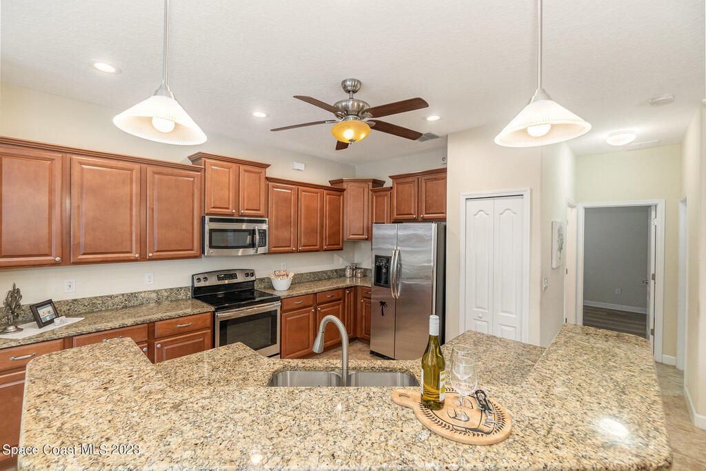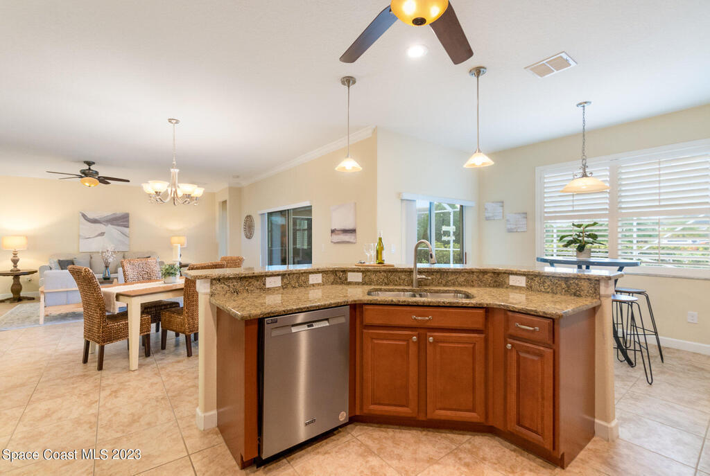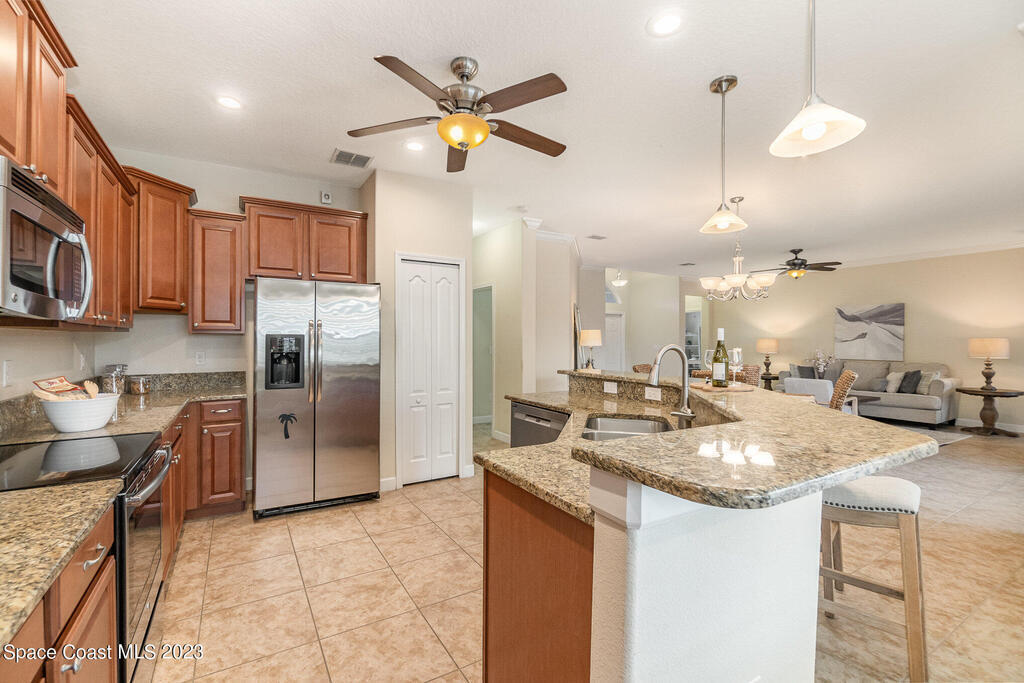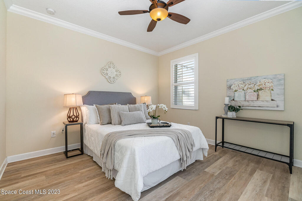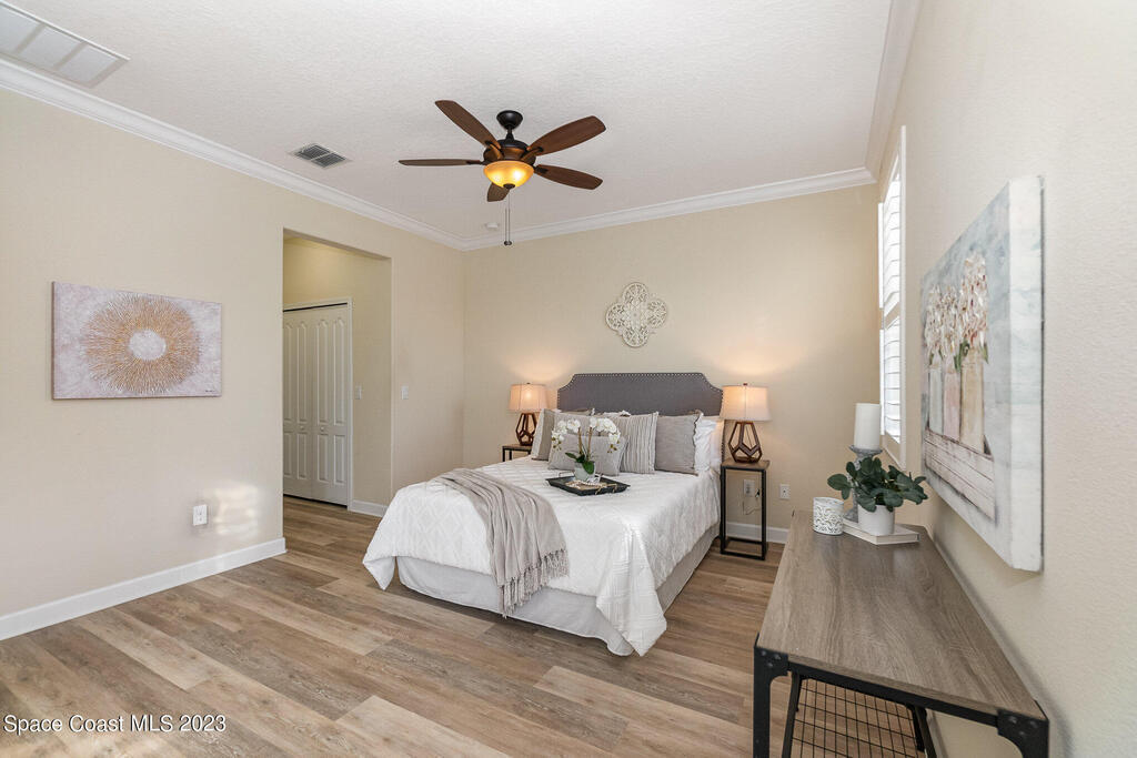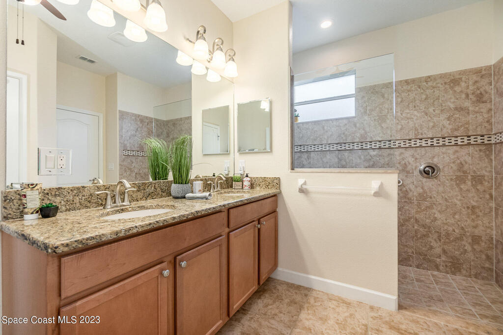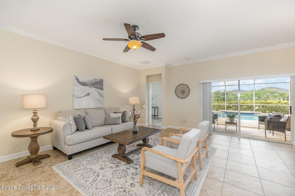 Discover resort style living at it's finest in this gorgeous pool home nestled on an extra large prime lot in the most prestigious, sought after 55+ resort style community in Viera. Don't miss an opportunity to own a spacious home with gorgeous solar heated pool with waterfall, accordion storm shutters, custom plantation shutters and more. Beautiful double entry doors leading to the large family room overlooking a private oasis and large lanai. Sliding doors lead to much more luxurious living space. Elegant master suite with his and hers sinks, private water closet and large walk in shower. Granite counter tops throughout, stainless steel appliances, raised panel cabinets, security system.