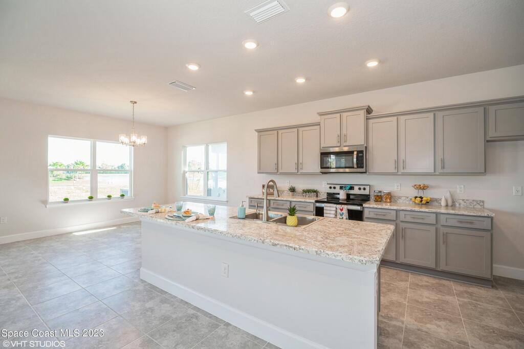 $1,000 deposit and save thousands of dollars with All closing costs paid (except escrow items) with approved lender. Beautiful water lot in gated community Gardens at Waterstone! This spacious 2 story home being built on homesite 59 has stunning cabinets w/ bump, stagger, and crown molding, SS appliances. Owner suite includes bath with double vanity sinks, fiberglass 5' walk-in shower, and enclosed toilet. Tile floors throughout living areas. Other features include ceiling fans, coach lights and irrigation system, 5 1/4 baseboards, Moen brushed nickel fixtures, 5 panel doors, a spacious loft for family activities. And a covered lanai for enjoyment of those summer evenings. Paver driveways and stone accents included! NO CDD.