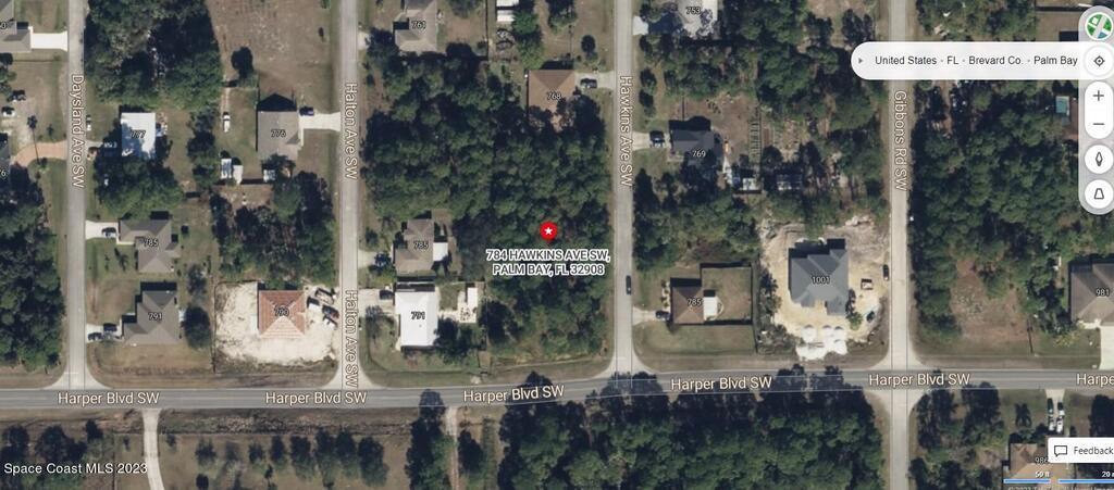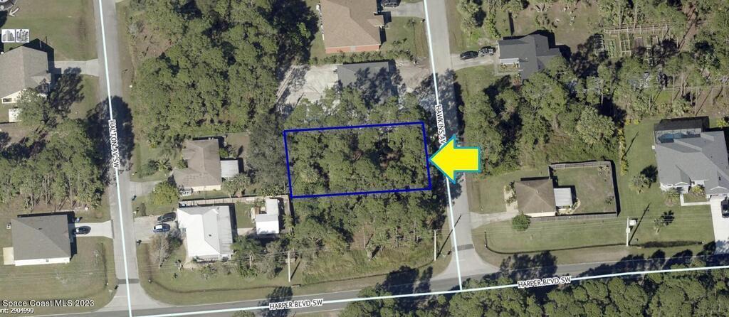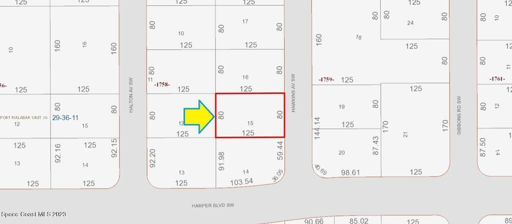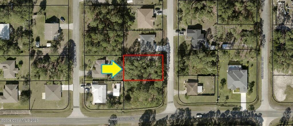 0.23 acre buildable residential lot available in Port Malabar Unit 36 of Palm Bay. Located in the southwest section, this lot is just 1.9 miles - 5 minutes to Jupiter Elementary School, 2.9 miles - 7 minutes to the Winn Dixie Supermarket, 12.3 miles - 26 minutes to Melbourne Airport, and 15.4 miles - 32 minutes to the beaches of Indialantic. From exit #180 of I-95 go west on US-192 for .5 miles, left on St Johns Heritage Parkway for 6.1 miles, left on Malabar Road for 1.8 miles, right on Hurley Boulevard for .8 miles, left on Harper Boulevard for 1.0 mile, and left on Hawkins Avenue. The lot will be on your left.