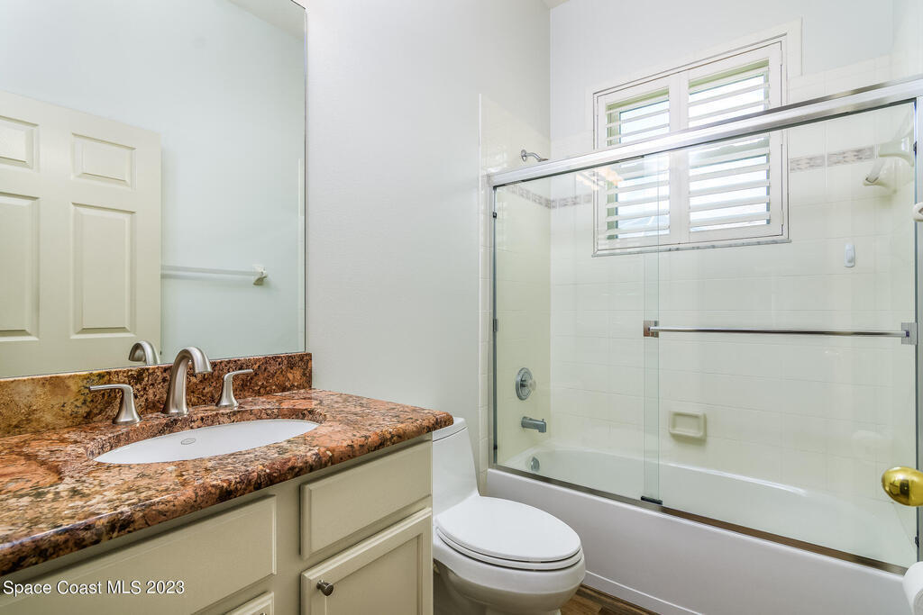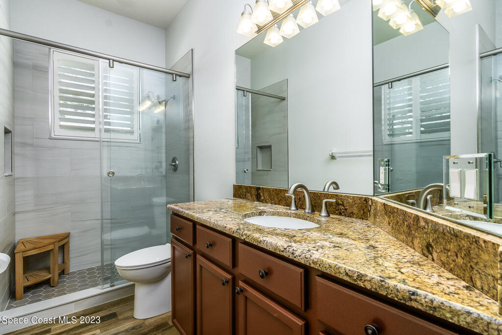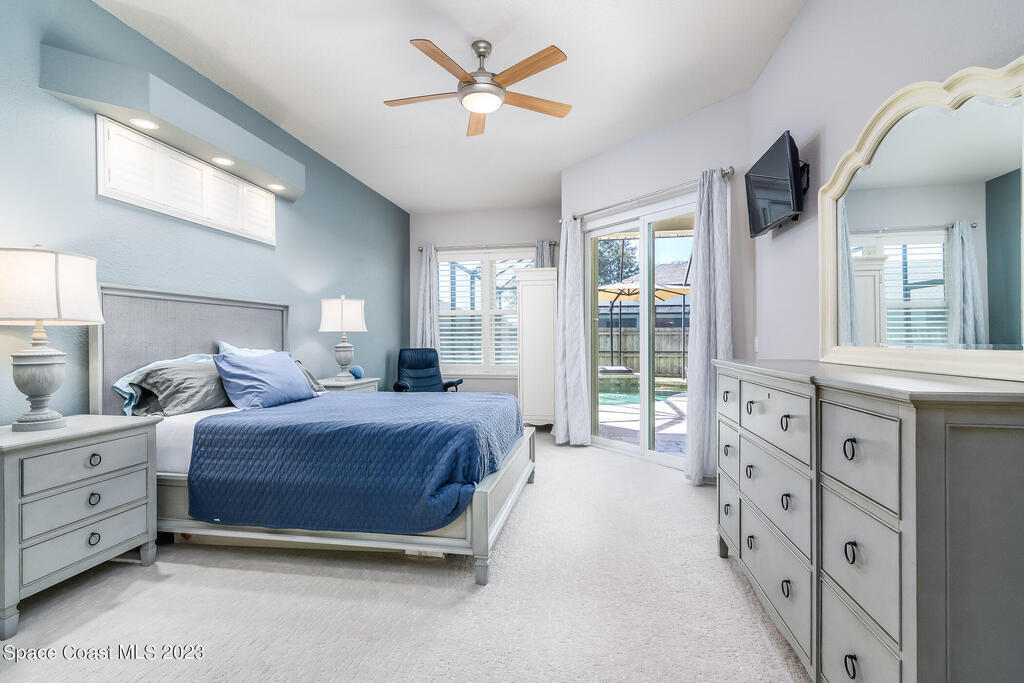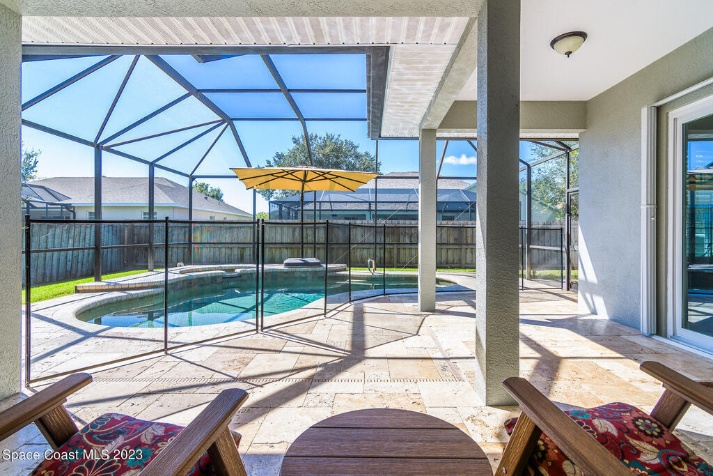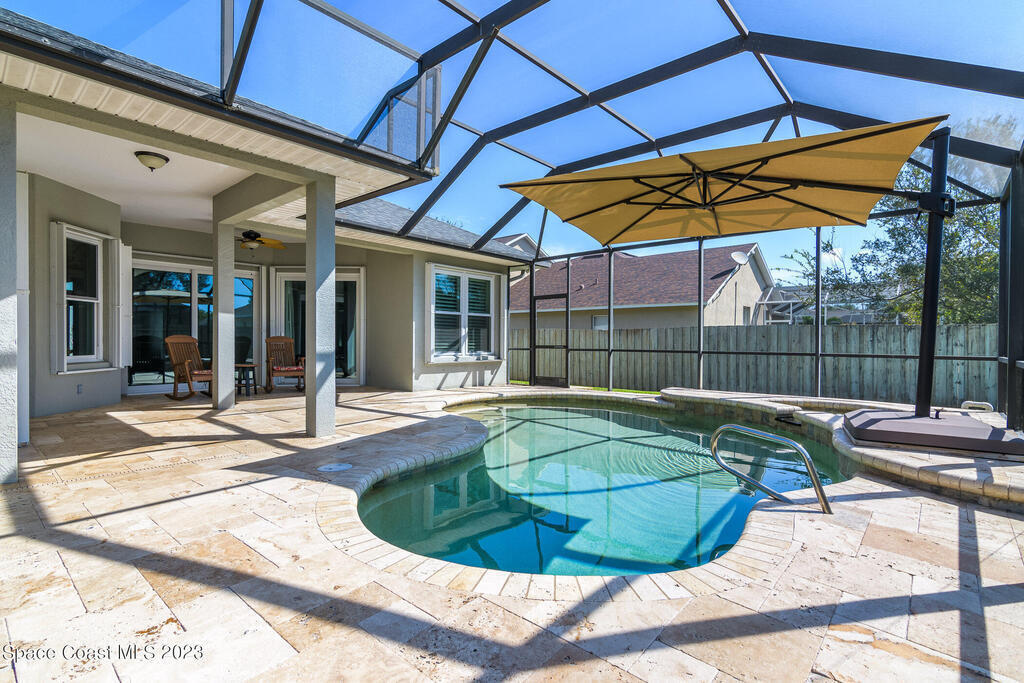 Finally, a clever 4/3+Den, pool home in a gated HOA w/low fees & A+ schools! From an elegant glass front door to a bright foyer, high ceilings are underscored by wood-look tile & plantation shutters. The kitchen offers wood cabinets, granite counters, SS appliances, & large breakfast bar. A perfect in-law quarters w/bathroom, bdrm + den w/private entrance. California Closet system in the pantry & primary closets. Spacious master w/sittiing area & newly renovated bath w/free standing tub, glass enclosed shower & backlit mirrors! Also, tankless water heater & EV charger! Outside, enjoy all fresco celebrations on the travertine marble deck, gas-heated salt-water pool w/spa, fully fenced yard & lush landscaping. Well secured w/hurricane impact windows, sliders + accordion hurricane shutters!
