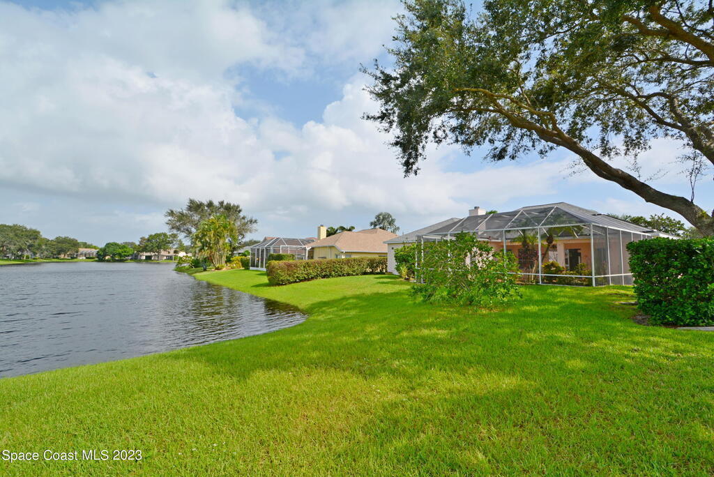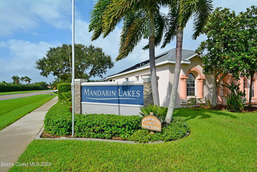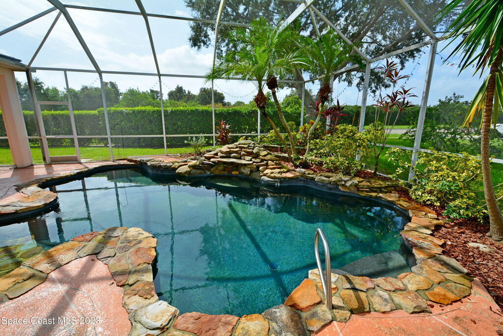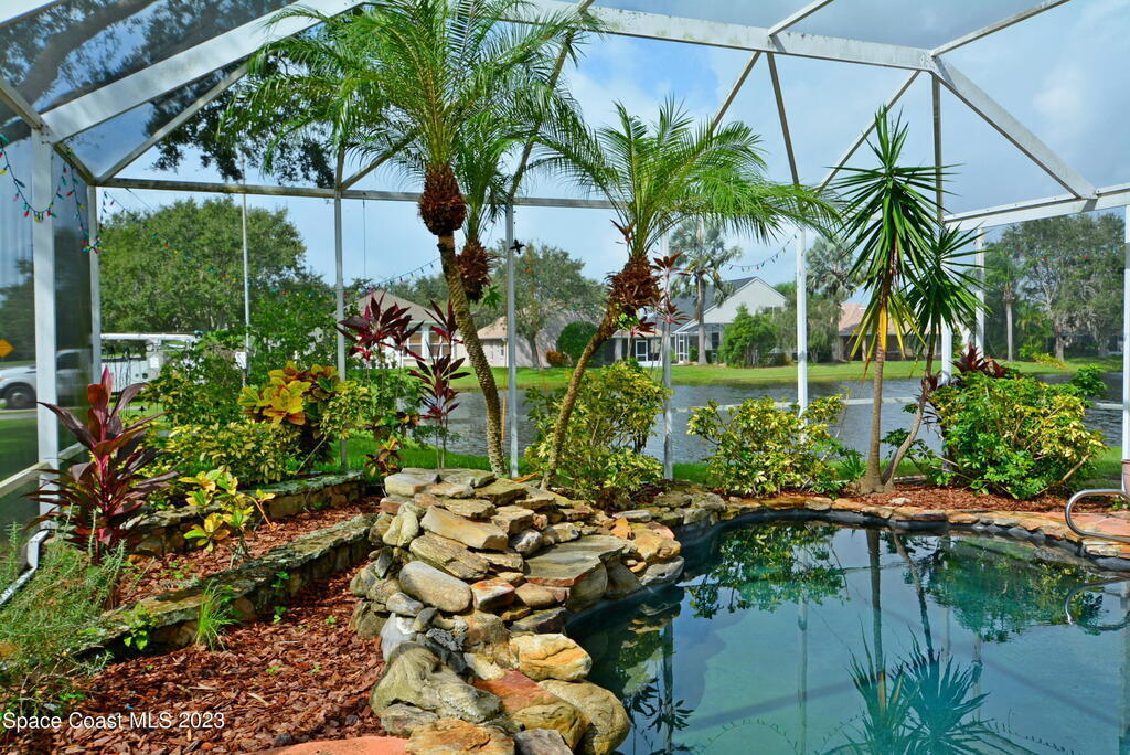 This beautiful lakefront property has 4 bedrooms with a 5th bedroom/office with built-in shelving and includes a second bedroom/bathroom suite, providing an area of extra privacy. The open floor plan with lofty ceilings has sliding glass doors surrounding the pool which welcomes sunlight in from all angles and provides views of the spectacular rock surface pool with waterfall. This home was the model for the tranquil subdivision of Mandarin Lakes in a great central location with easy access to the Suntree golf community, and a short drive to The Avenue in Viera, tennis courts, and the beaches.