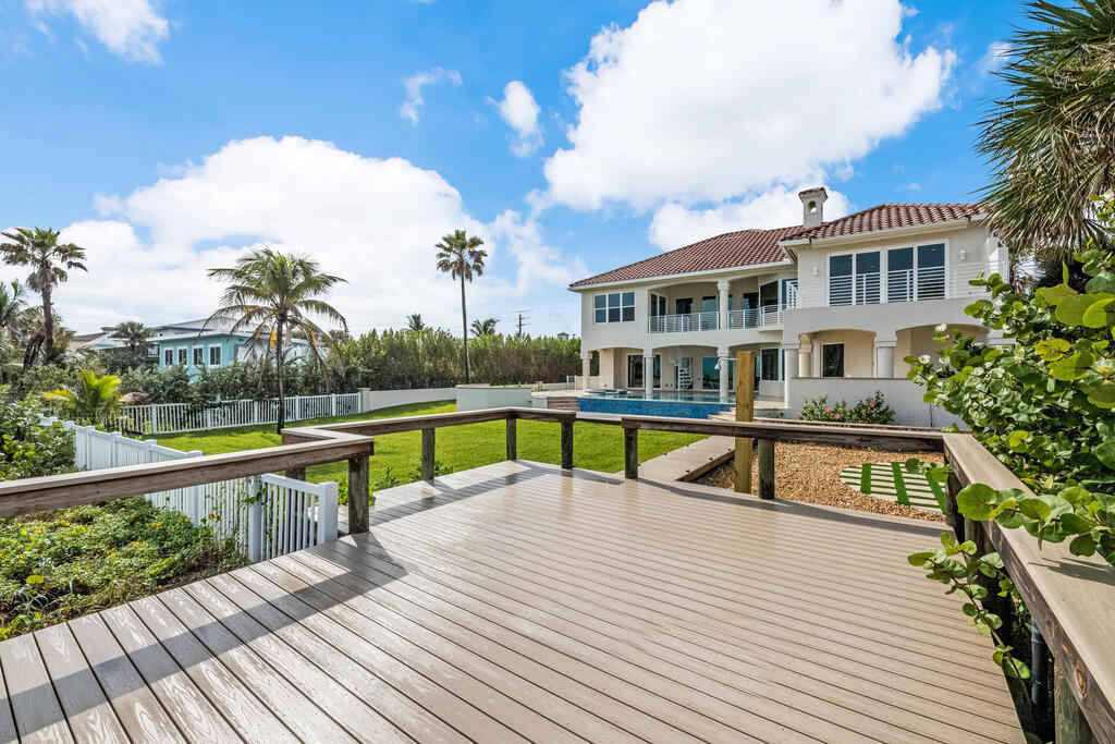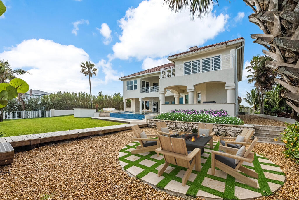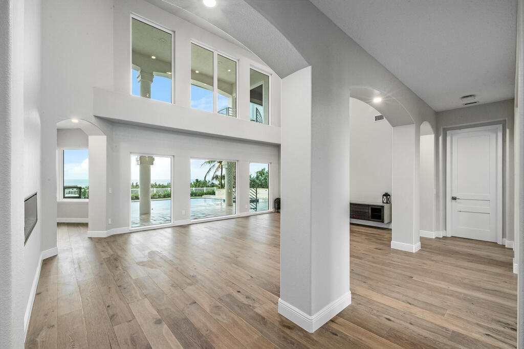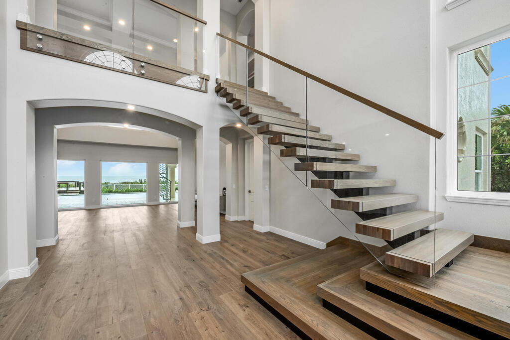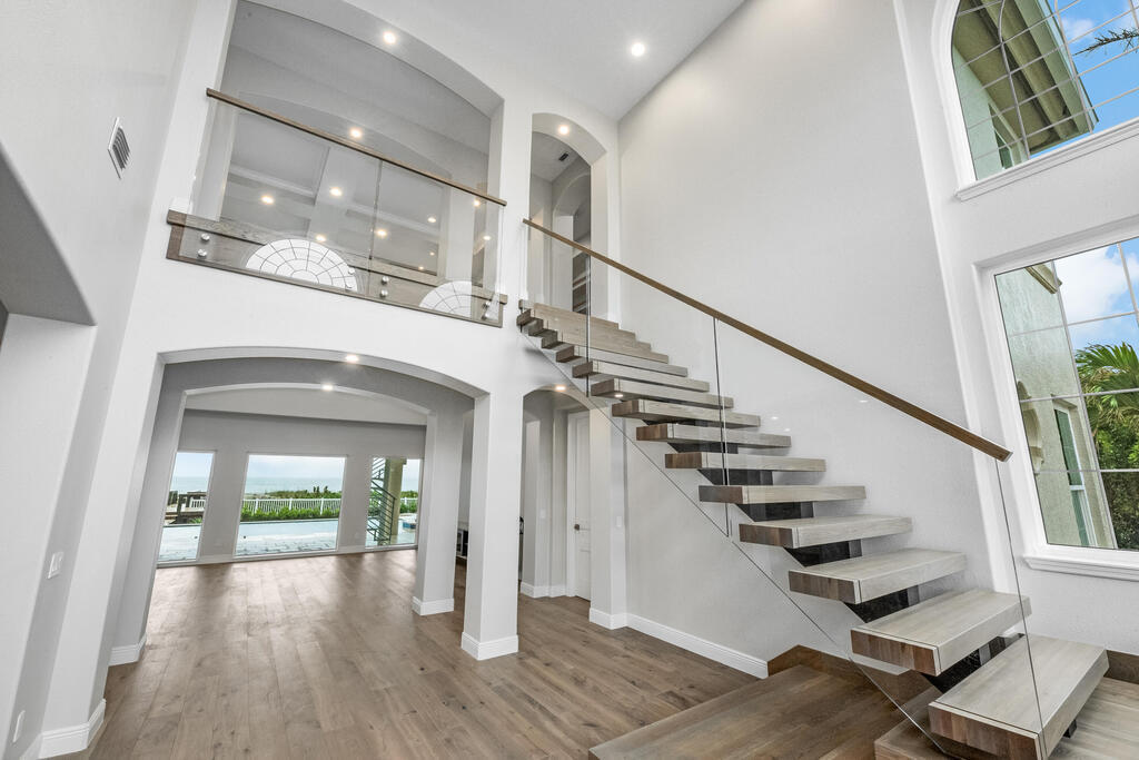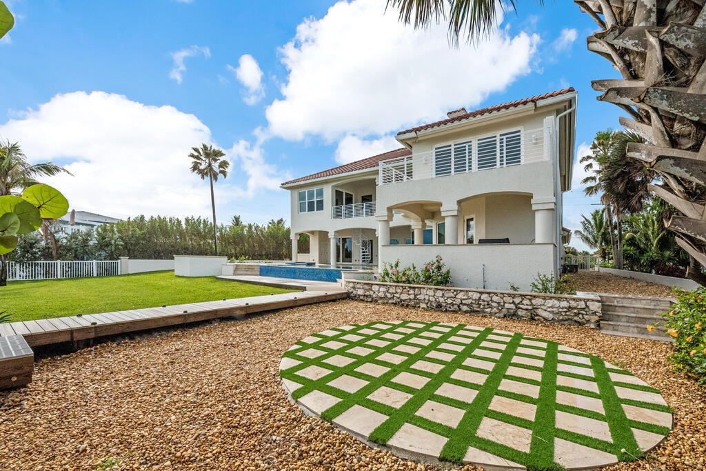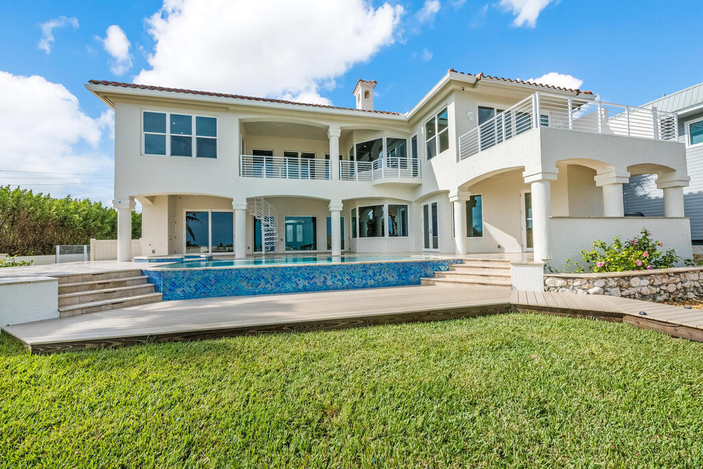 Welcome to this exquisite custom-built home, constructed in 1996, offering a generous living space of 4,758 sq ft. Nestled on a .58-acre lot with 100 feet of oceanfront, this property provides an idyllic coastal living. Recently remodeled and redesigned, this home showcases a modern aesthetic and impeccable craftsmanship. The highlight of the interior is the custom-built monostringer staircase, featuring 4'' white oak floating treads and elegant clear glass railings. This architectural masterpiece adds a touch of sophistication and serves as a focal point of the home. With two primary bedrooms, one on the main floor and another on the second floor, this home offers flexibility and convenience. The second-floor bedroom can be easily accessed via an elevator ensuring ease of movement throughout the home.The gourmet kitchen is a chef's dream, equipped with top-of-the-line Subzero refrigerator and Viking cooking appliances. The kitchen's open concept design allows for seamless