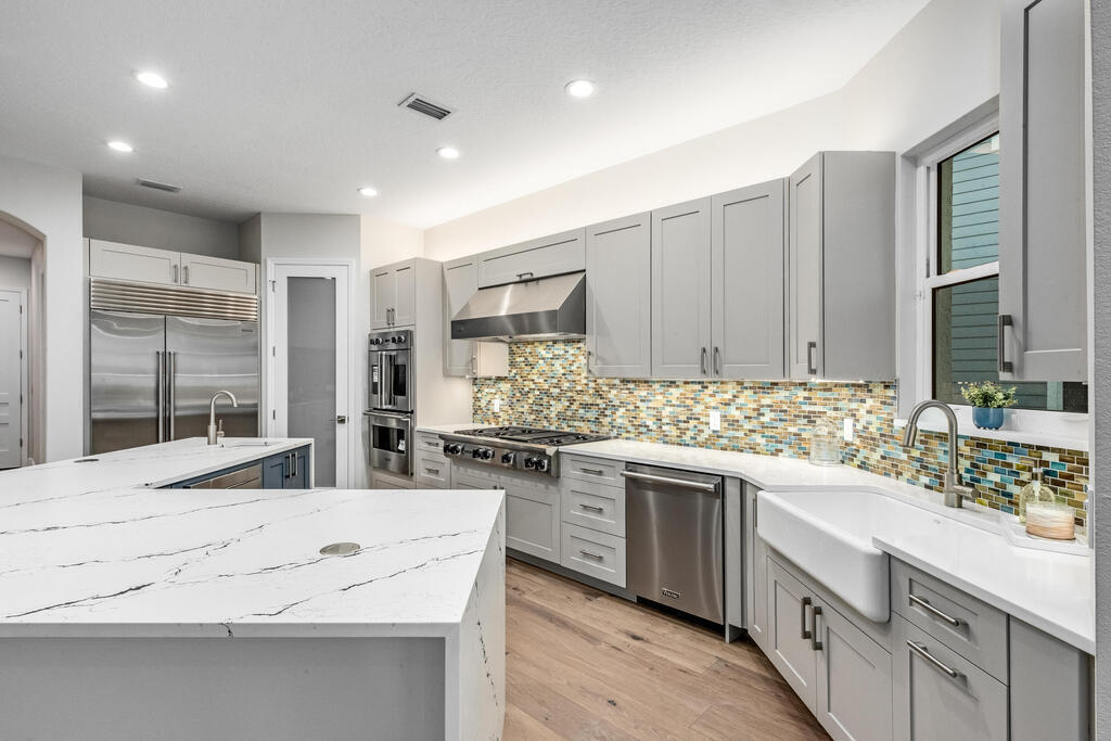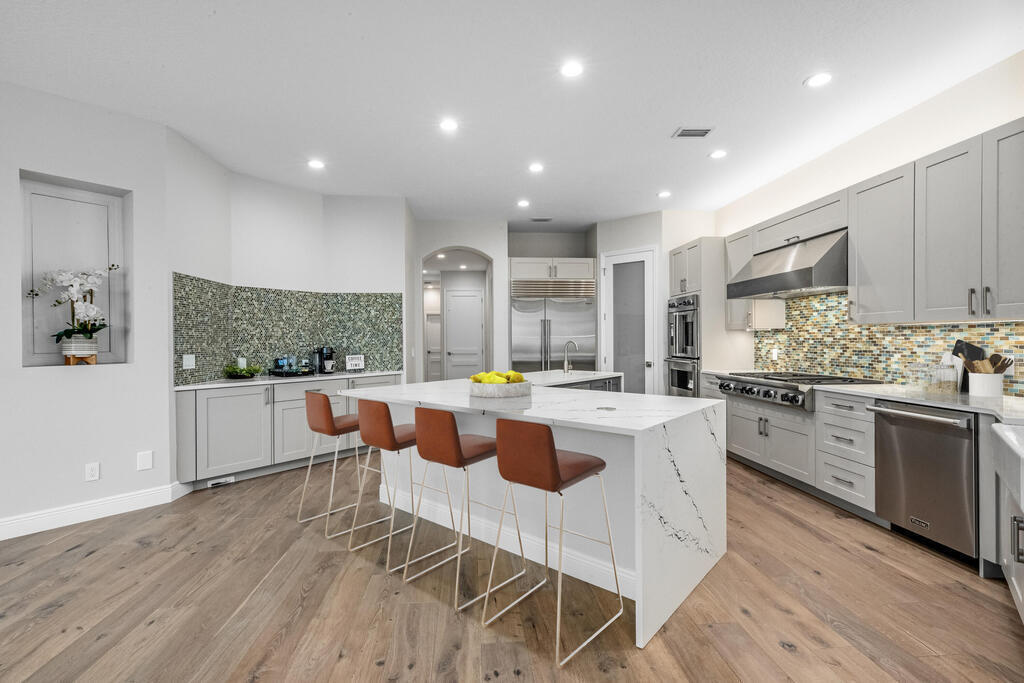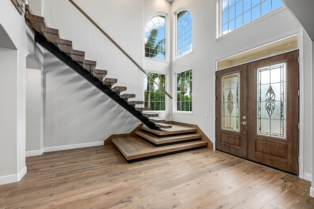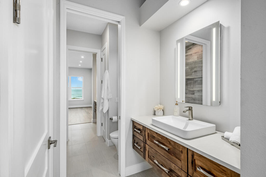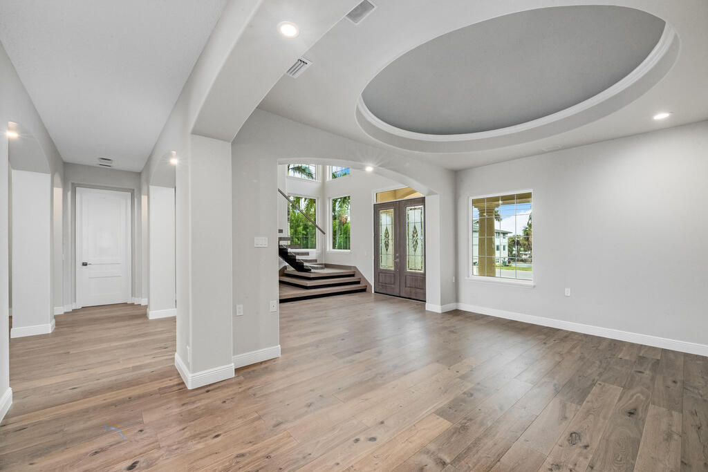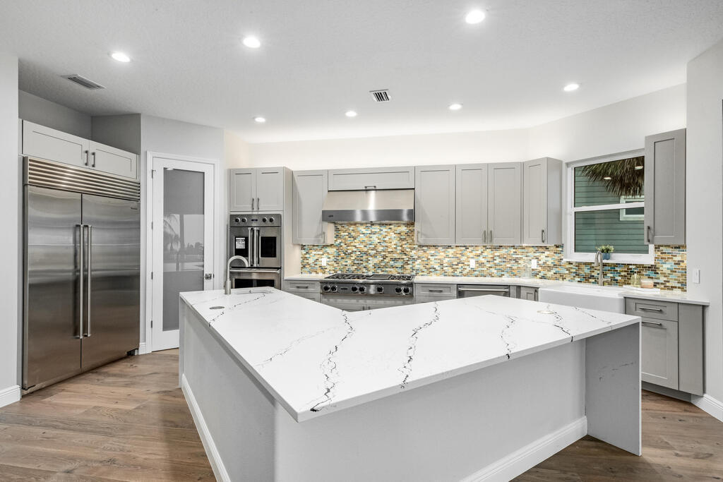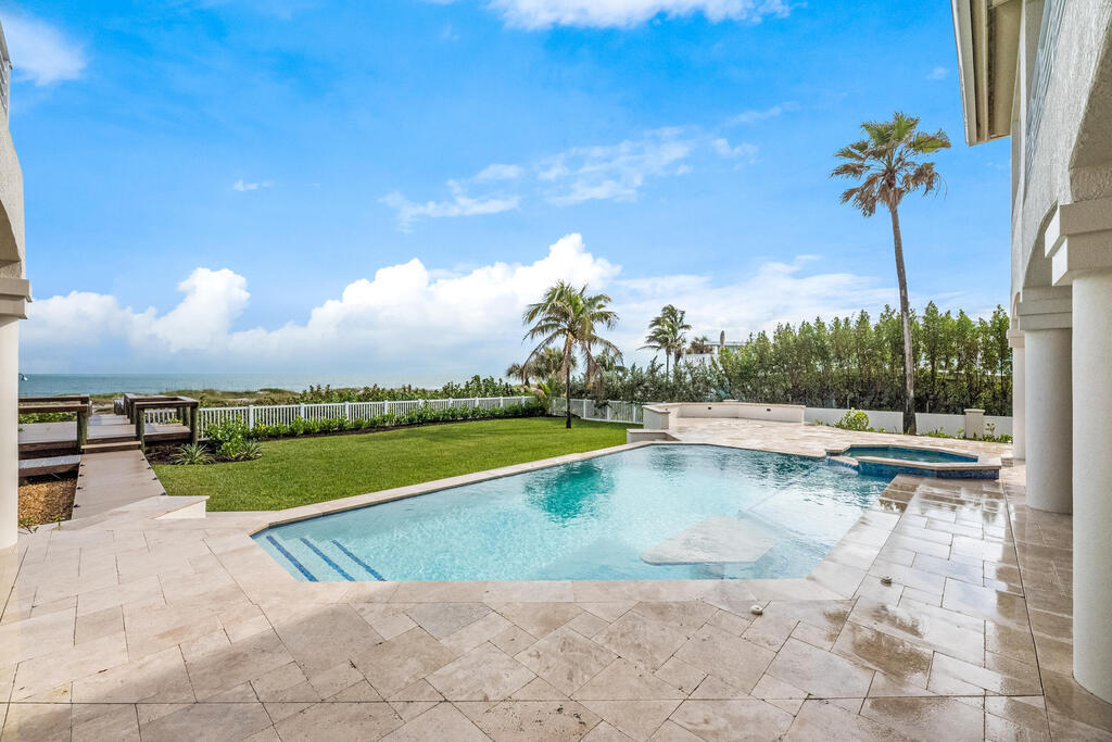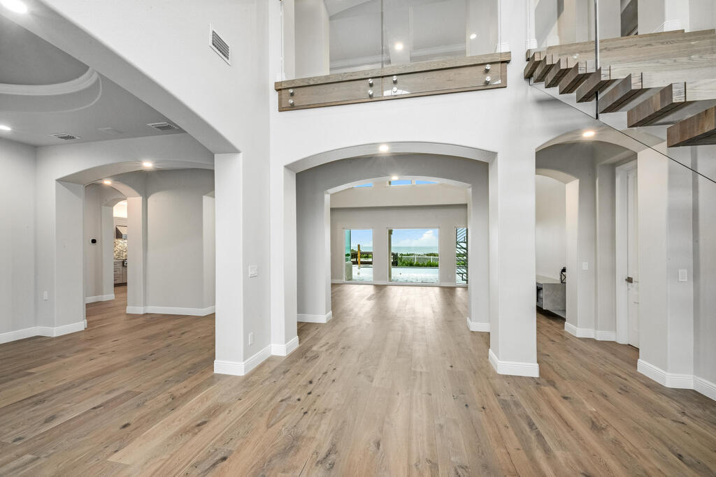 Welcome to this exquisite custom-built home, constructed in 1996, offering a generous living space of 4,758 sq ft. Nestled on a .58-acre lot with 100 feet of oceanfront, this property provides an idyllic coastal living. Recently remodeled and redesigned, this home showcases a modern aesthetic and impeccable craftsmanship. The highlight of the interior is the custom-built monostringer staircase, featuring 4'' white oak floating treads and elegant clear glass railings. This architectural masterpiece adds a touch of sophistication and serves as a focal point of the home. With two primary bedrooms, one on the main floor and another on the second floor, this home offers flexibility and convenience. The second-floor bedroom can be easily accessed via an elevator ensuring ease of movement throughout the home.The gourmet kitchen is a chef's dream, equipped with top-of-the-line Subzero refrigerator and Viking cooking appliances. The kitchen's open concept design allows for seamless