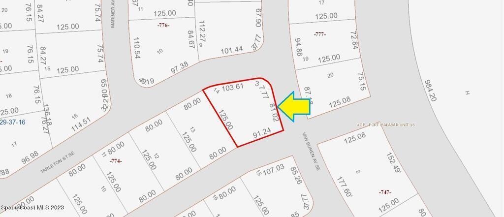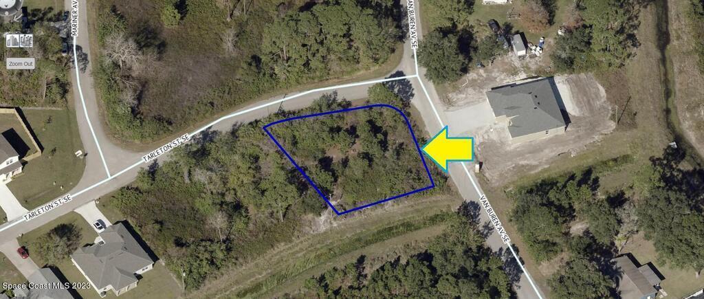 0.29 acre buildable residential corner lot available in Port Malabar Unit 16 of Palm Bay. Located in the southeast section, this lot has city water available, a drainage canal in the rear allowing more privacy, and is just .7 miles - 3 minutes to Columbia Elementary School, 2.5 miles - 7 minutes to the Publix Supermarket, 10 miles - 23 minutes to Melbourne Airport, and 15 miles - 27 minutes to the beaches of Indialantic. From exit #173 of I-95 go west on Malabar Road for .2 miles, left on San Filippo Drive for 2.6 miles, and left on Tarleton Street. The lot will be on your right on the corner with Van Buren Avenue.