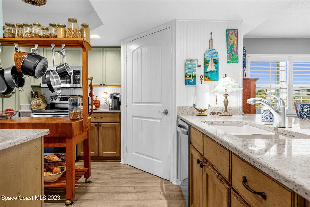 RARELY AVAILABLE 3 bed 2 bath stunning corner unit in Solona Lakes. Completely remodeled with high end wood cabinetry, chef's double oven, tumbled glass corian countertops, luxury vinyl plank flooring, shiplap, gorgeous clawfoot tub just to name a few finishes that lend to an inviting rustic yet modern seaside vibe. The split bedroom open floor plan is perfect for entertaining guest. Step out onto one of two spacious balconies with South and east facing lake/fountain and partial ocean views. All windows are adorned with plantation shutters and accordion hurricane shutters. Underground private single car garage included. HOA includes internet, cable, trash removal, water, hot water, building insurance & maintenance, tennis courts, fitness center, sauna, beach access.