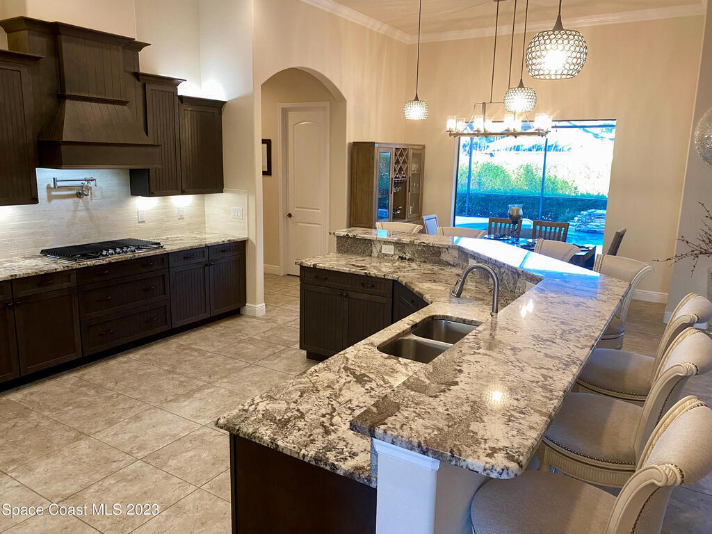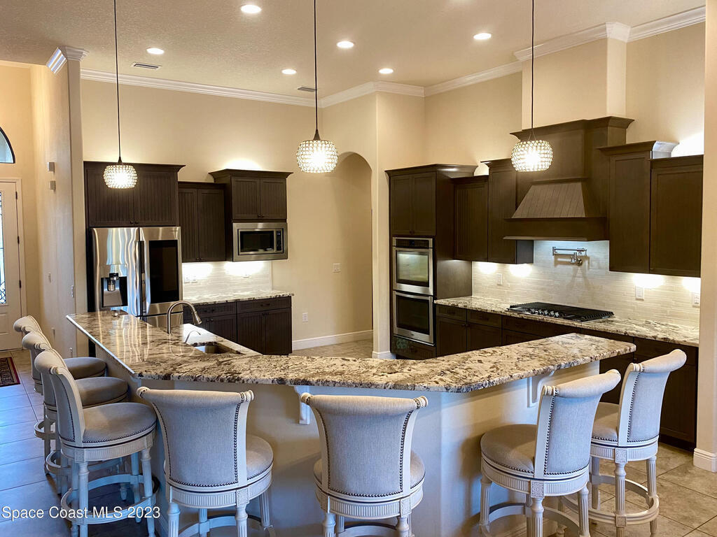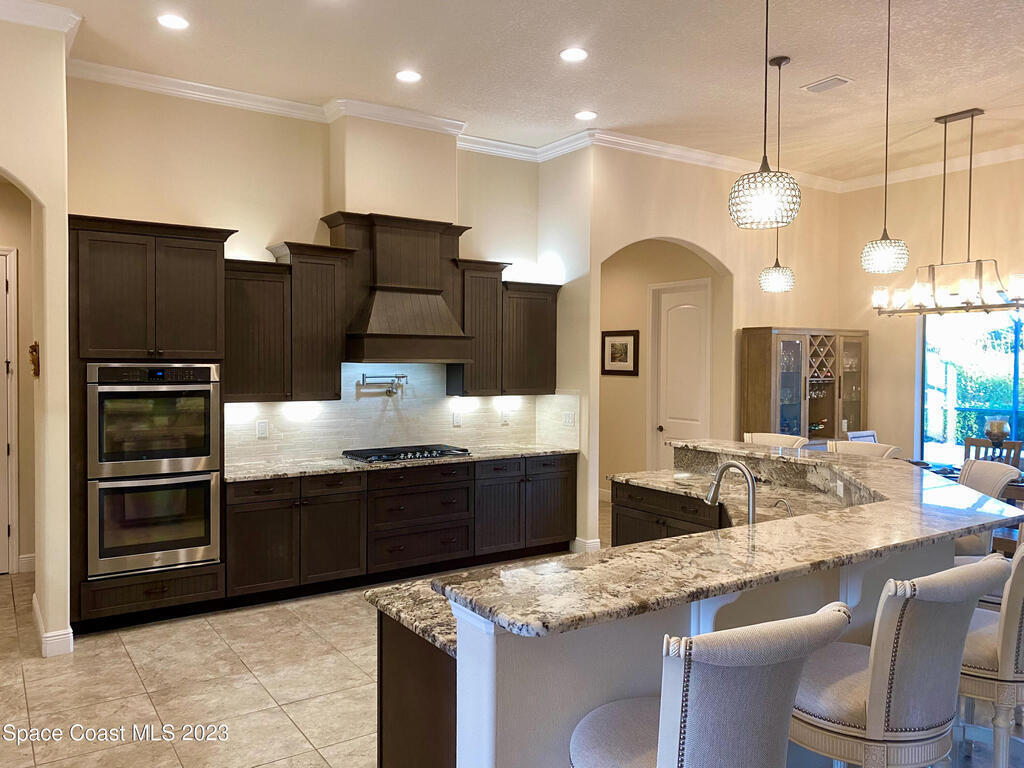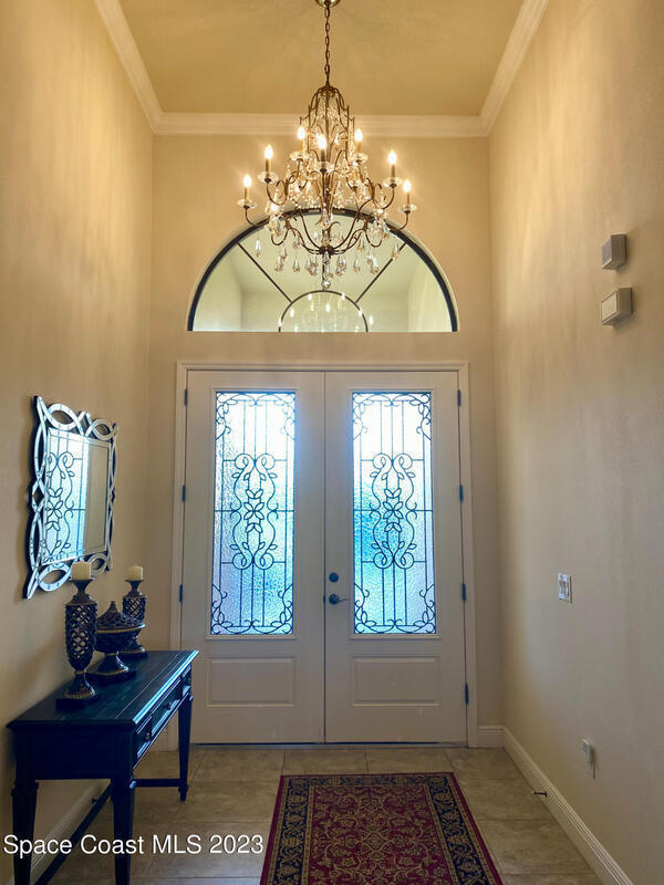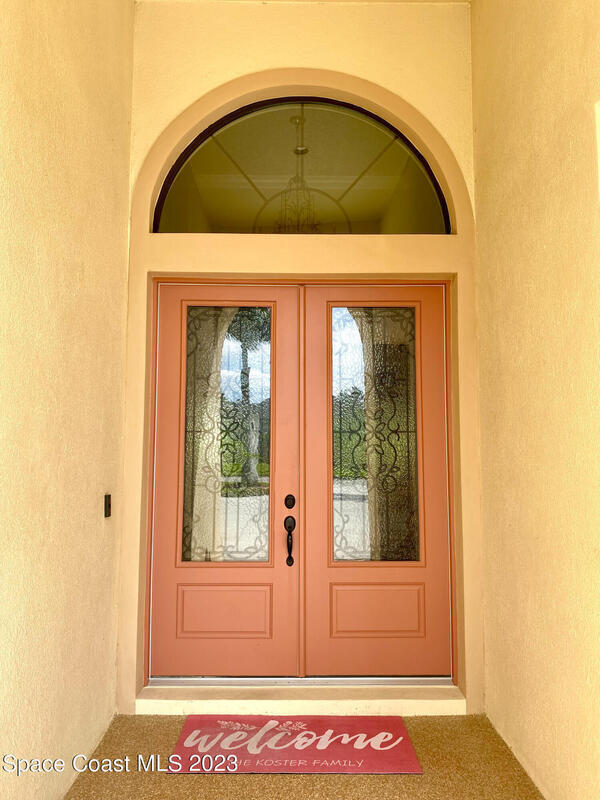 NEW ROOF 2024 This stunning executive residence with 5 bedrooms + 3.5 baths + study sits on a .64-acre corner property with lush landscaping. The grand courtyard driveway is framed by majestic Royal Palms providing vehicle access to an oversized 3-car garage with professionally installed epoxy flooring. Beautiful stone-arched entryway with decorative double doors lead into a chandelier lit foyer, open concept great room, and chef's kitchen with 18' long granite countertop seating 7, double ovens, built-in microwave, 5-burner natural gas cooktop with Italian marble backsplash & pot filler, a 22 cuft capacity 4-door flex refrigerator with smart touch screen, and RO system for the entire kitchen. French doors from the great room lead to a large covered patio and screened deck providing 2000 sf of BACK