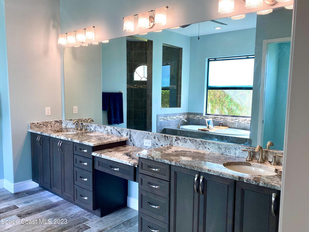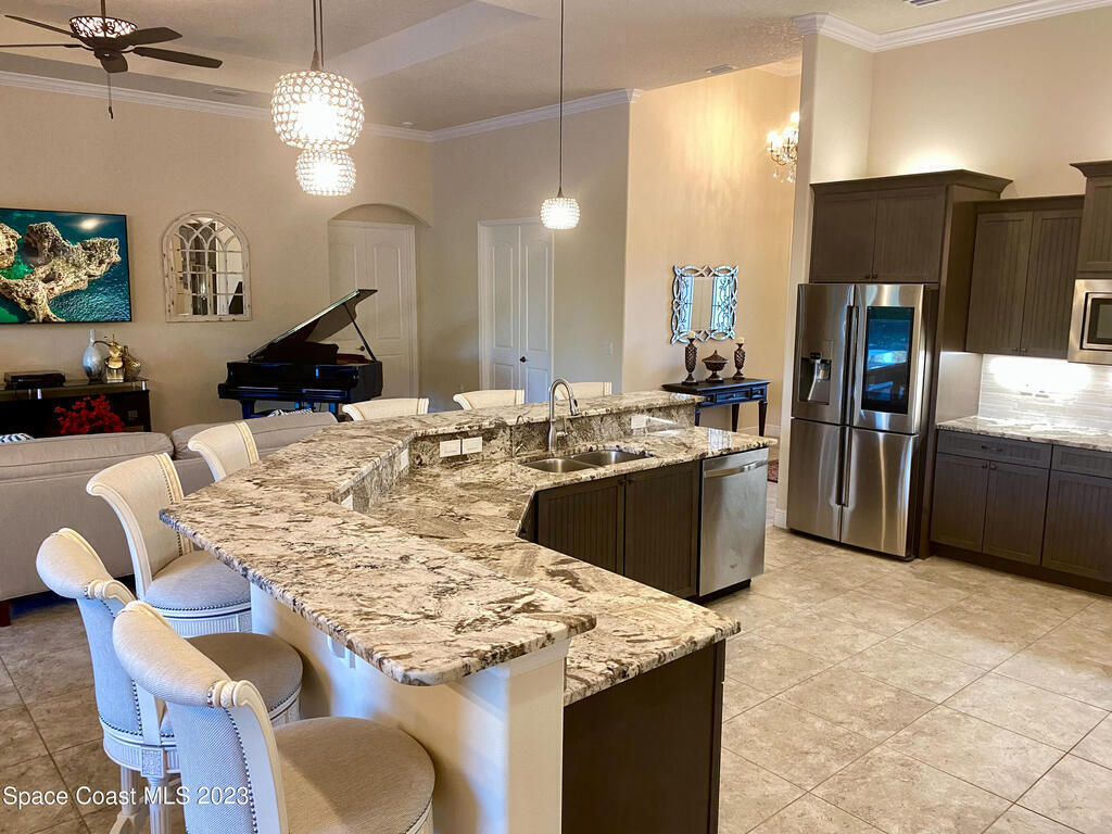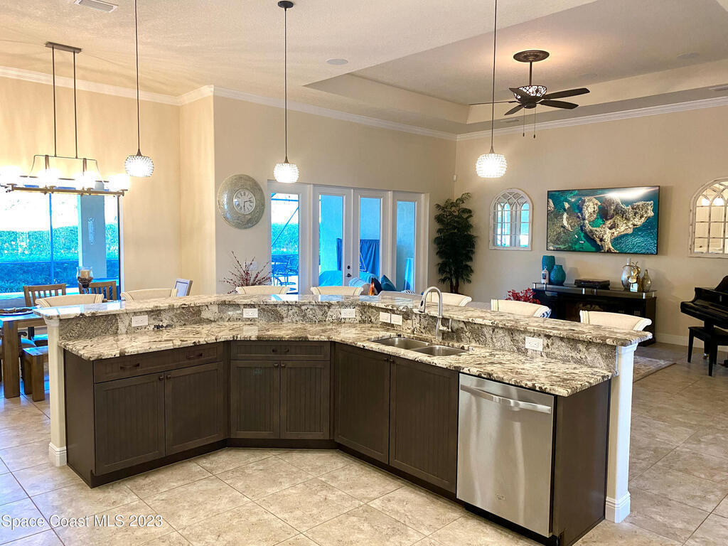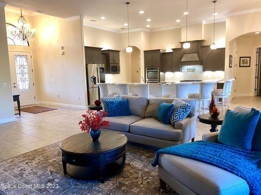 NEW ROOF 2024 This stunning executive residence with 5 bedrooms + 3.5 baths + study sits on a .64-acre corner property with lush landscaping. The grand courtyard driveway is framed by majestic Royal Palms providing vehicle access to an oversized 3-car garage with professionally installed epoxy flooring. Beautiful stone-arched entryway with decorative double doors lead into a chandelier lit foyer, open concept great room, and chef's kitchen with 18' long granite countertop seating 7, double ovens, built-in microwave, 5-burner natural gas cooktop with Italian marble backsplash & pot filler, a 22 cuft capacity 4-door flex refrigerator with smart touch screen, and RO system for the entire kitchen. French doors from the great room lead to a large covered patio and screened deck providing 2000 sf of BACK