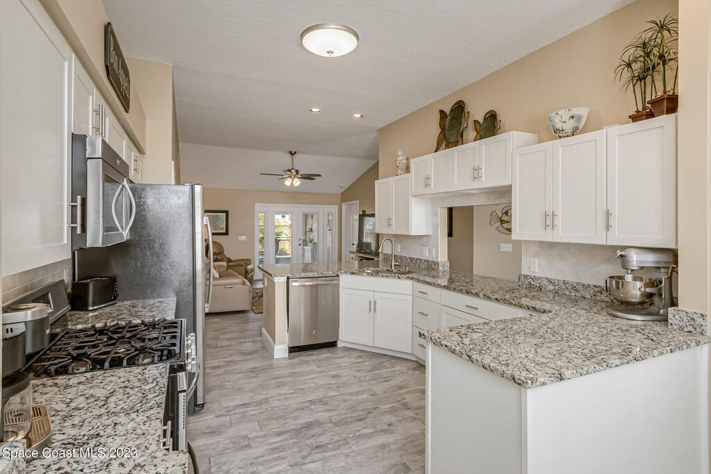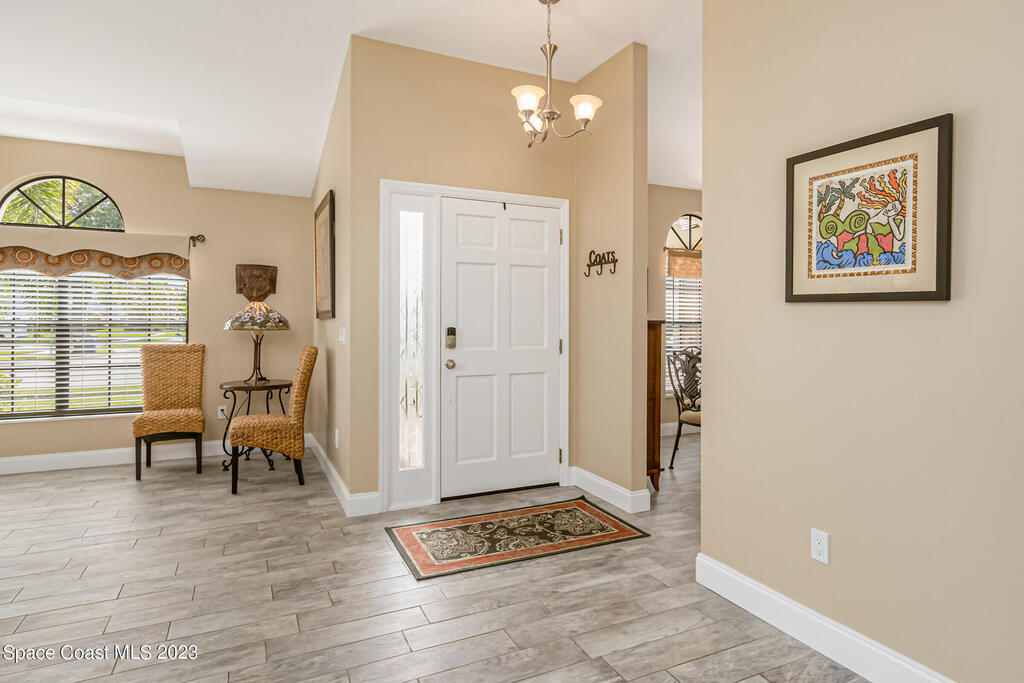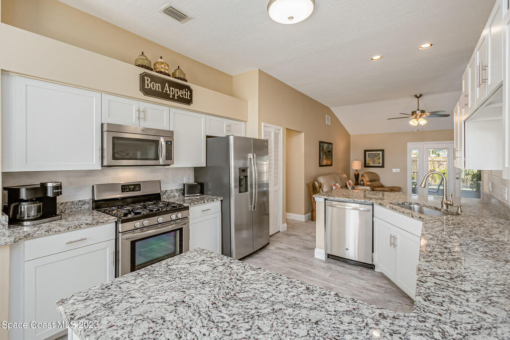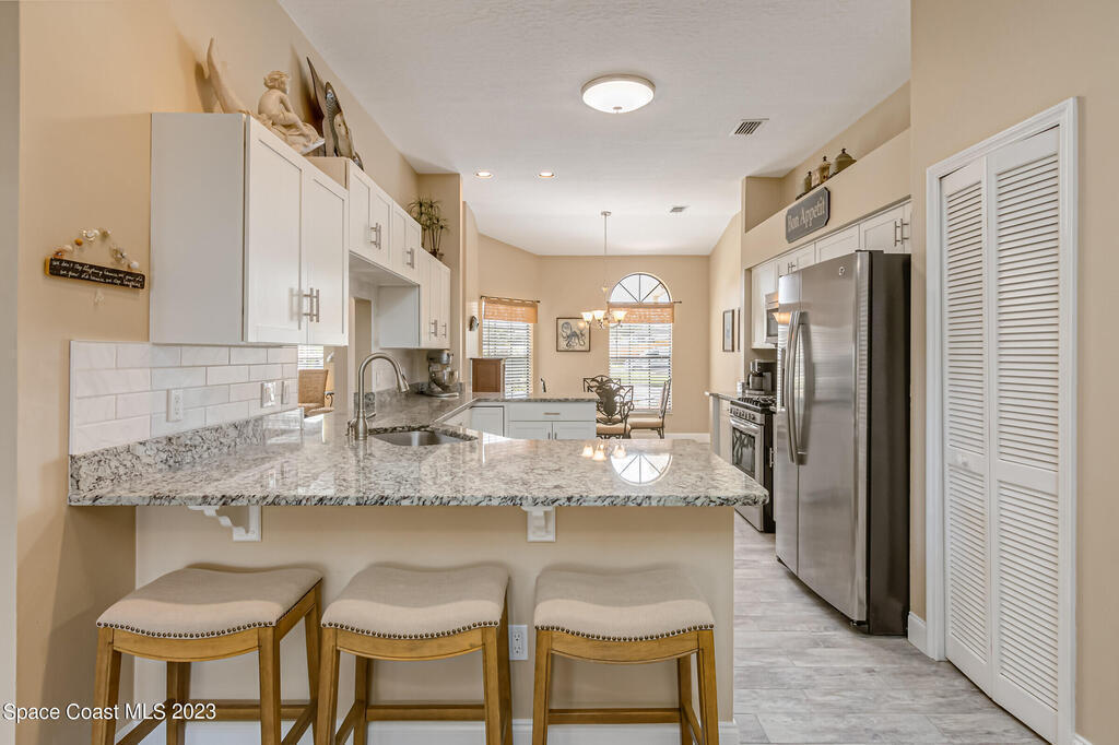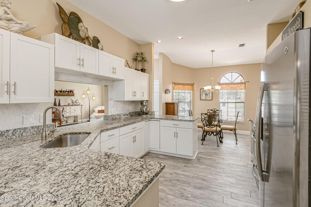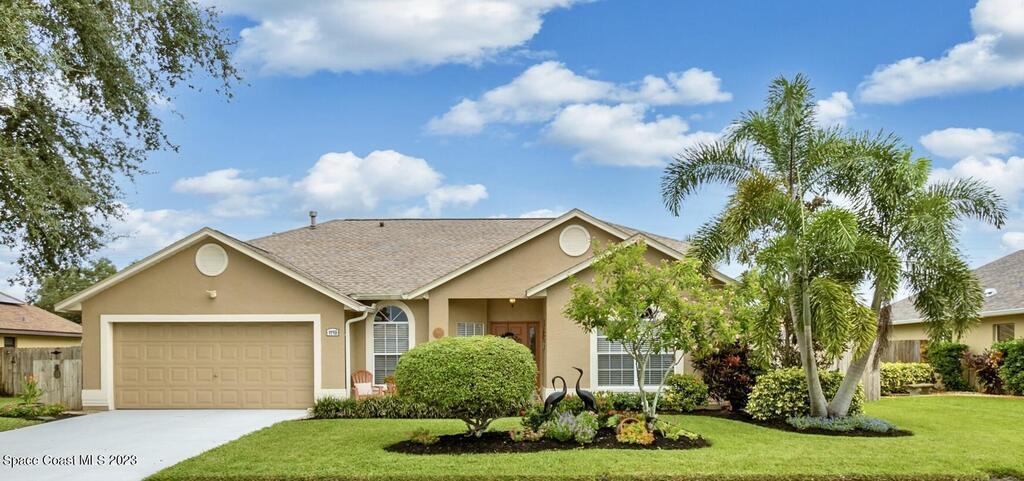 Accepting Backups.HOME WARRANTY offered on this 4 BR, concrete block, updated and meticulously maintained home situated close to everything Viera has to offer! Having undergone a complete remodel just a few years ago including the roof and HVAC, this beauty is turn-key and ready for you to call it home! The gorgeous paver walkway and impeccable curb-appeal leading to the front door and designer color palate of the new exterior paint welcomes you to come inside to be greeted by a bright and airy open floor-plan. The updated wood-look tile floors with all new baseboards blend beautifully with the modernized ,neutral, and fully-renovated kitchen. New white shaker cabinets beautifully showcase the high-end stainless-steel appliances and granite counters. The added benefit of natural gas allows you