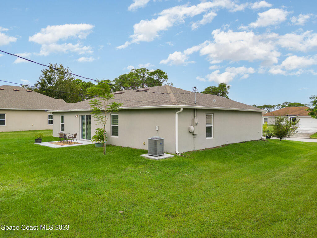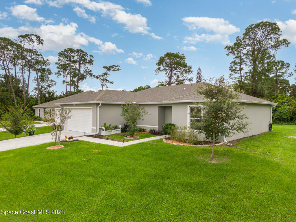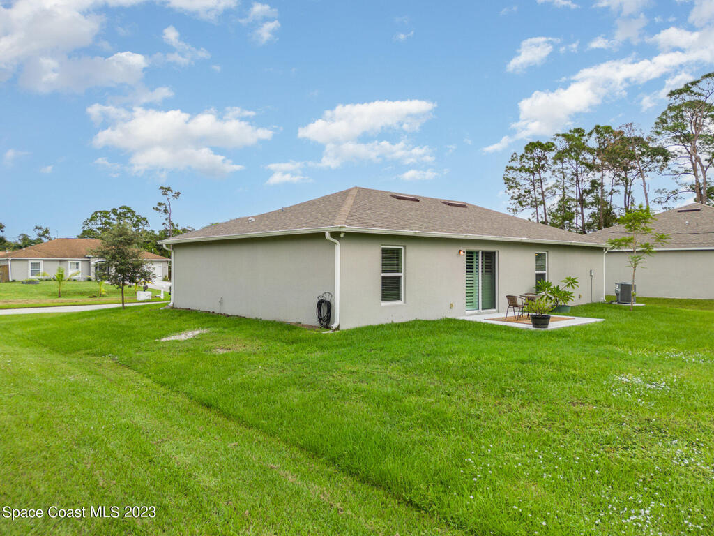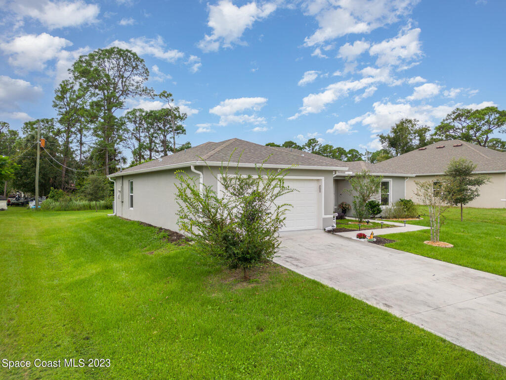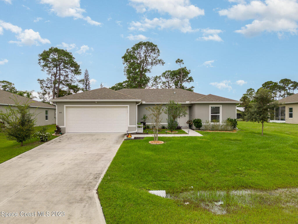 Nestled in the charming city of Palm Bay, this splendid 3-bedroom, 2-full bath home built in 2020 offers a modern oasis for those seeking both comfort and style. As you step onto the manicured front lawn, the lush landscaping welcomes you into a world of tranquility. With custom blinds to stay & an extended patio to relax on those cool evenings. Gutters have been added to the home.