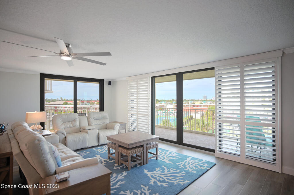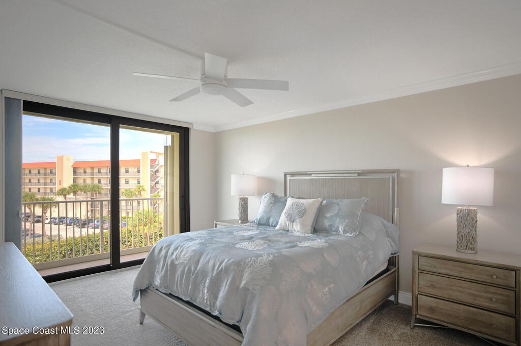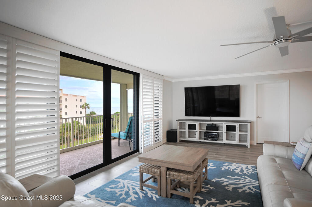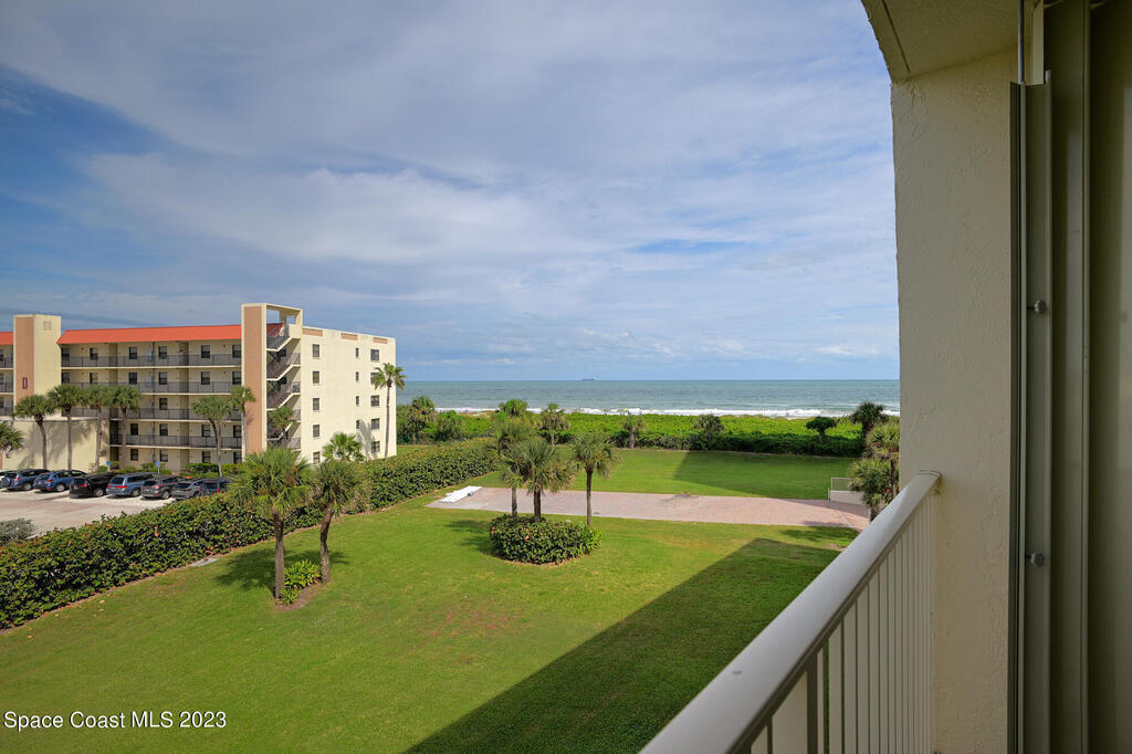Pristine oceanfront turnkey 3/2 condo completely remodeled in 2019 to perfection boasting an array of sleek finishes and a thoughtful open floor plan. Elegant custom craftsmanship and here are just a few of the features: modern quartz countertops, premium cabinets, custom walk-in closets, crown molding, flooring, SS appliances, expanded master and guest bath, AC and water heater. Other additions were new shutters 2020 and new balcony sliders in 2022. This luxurious unit is truly a trophy property and comes with a deeded shared garage for car and all the beach toys. Complex is 24/7 manned guard gate and sits on 13 acres well off the road for complete serenity. Sit on your wrap around balcony and enjoy watching rocket launches, cruise ships and local events such as air and boat shows.