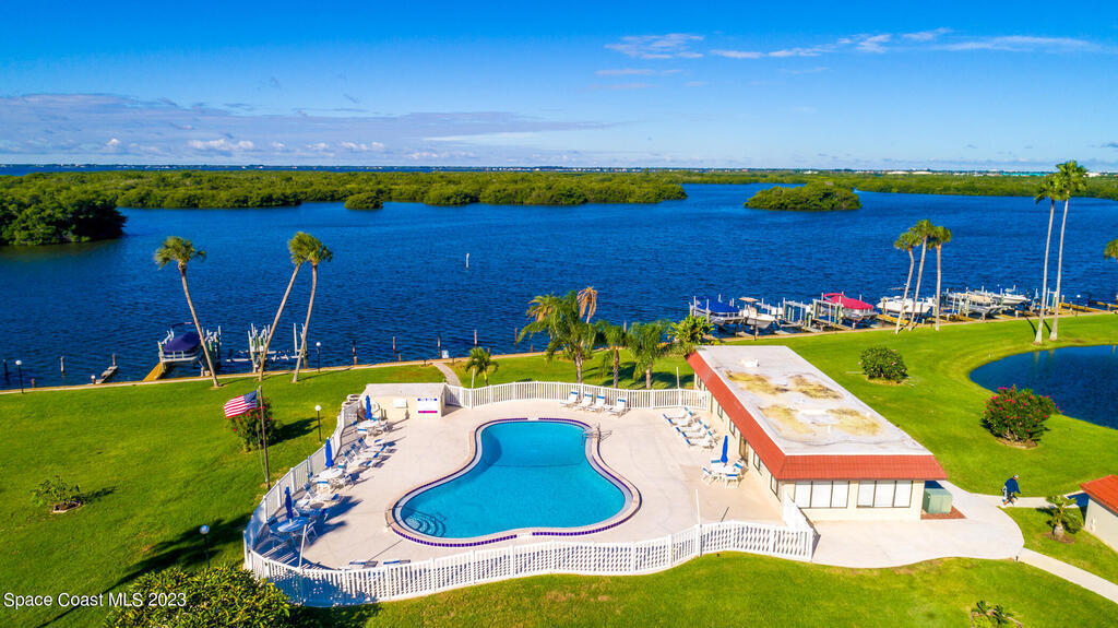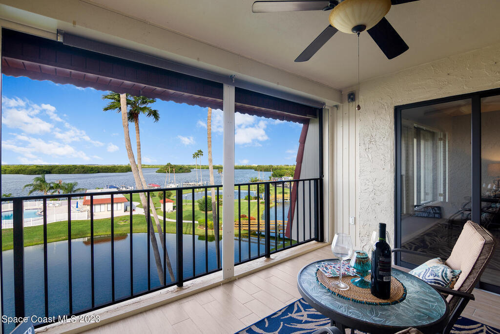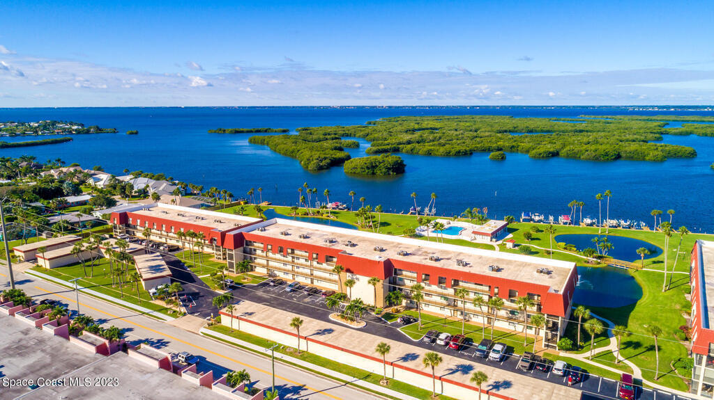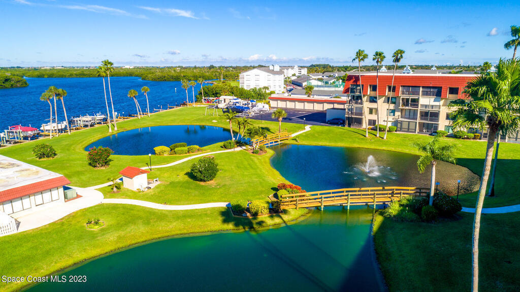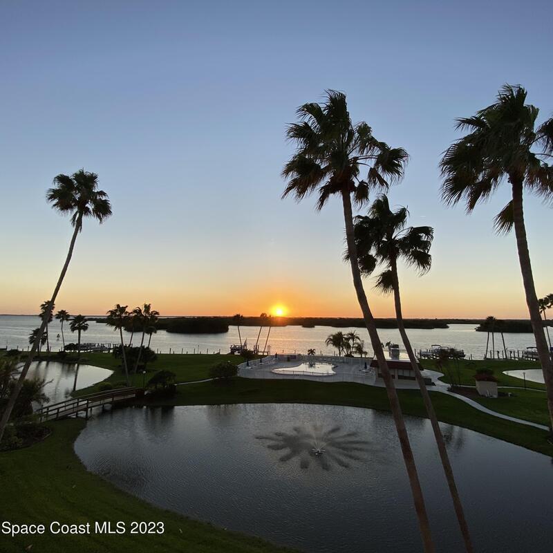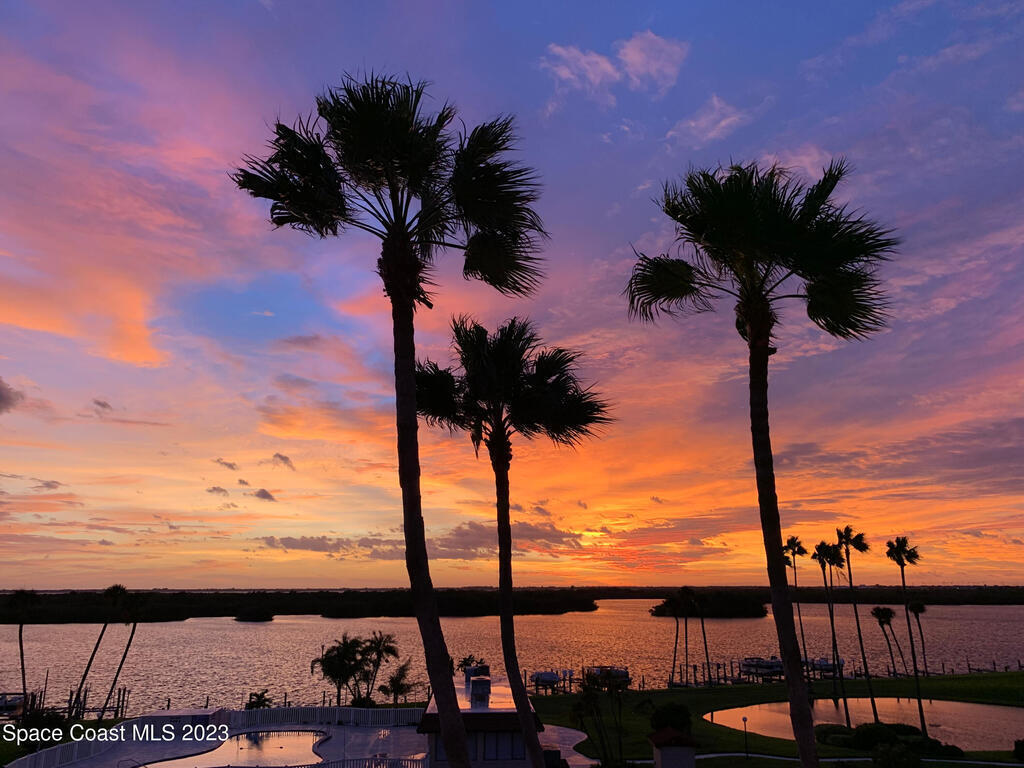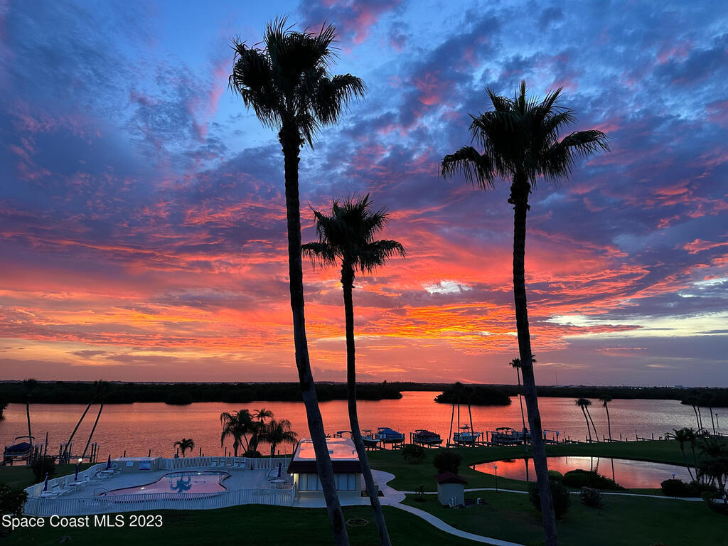 DIRECT Riverfront, TOP FLOOR FURNISHED unit with panoramic views of Thousand Islands Preserve and the Banana River, offering spectacular sunsets!! The best of beachside living on the river and only 2 short blocks to the Atlantic ocean, this remodeled unit boasts 2 bedrooms, 2 full baths, separate family/flex room, large, open living/dining room, stainless steel GE appliances, granite counter tops, Lighted breakfast bar shelving, maple cabinetry, laminate plank flooring, retractable balcony screens/shutters, Plantation shutters, and detached garage. Amenities include island style heated pool, ponds, tropical walkways, boat slip (lift can be added), riverfront Community Room, canoe/kayak rack, boat ramp, 725-ft dock to walk along, and fishing pier.
