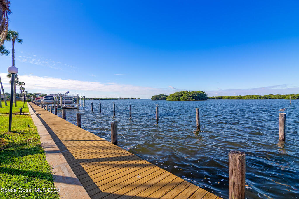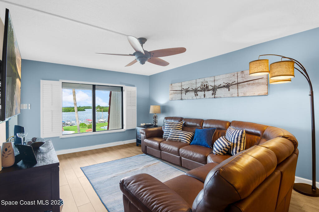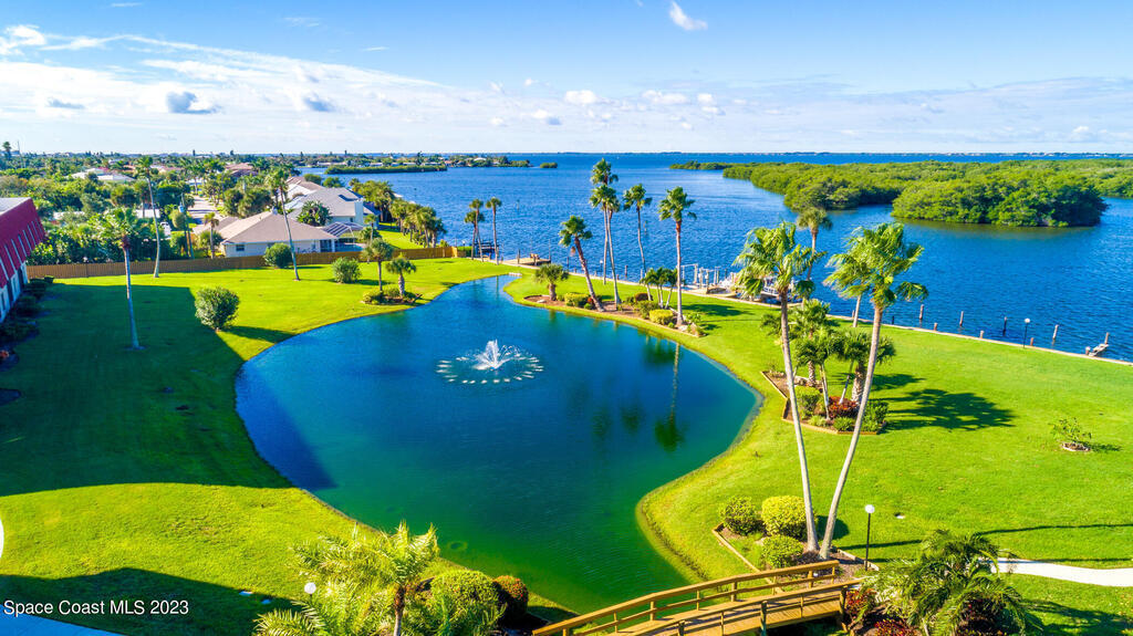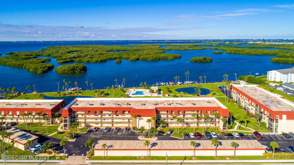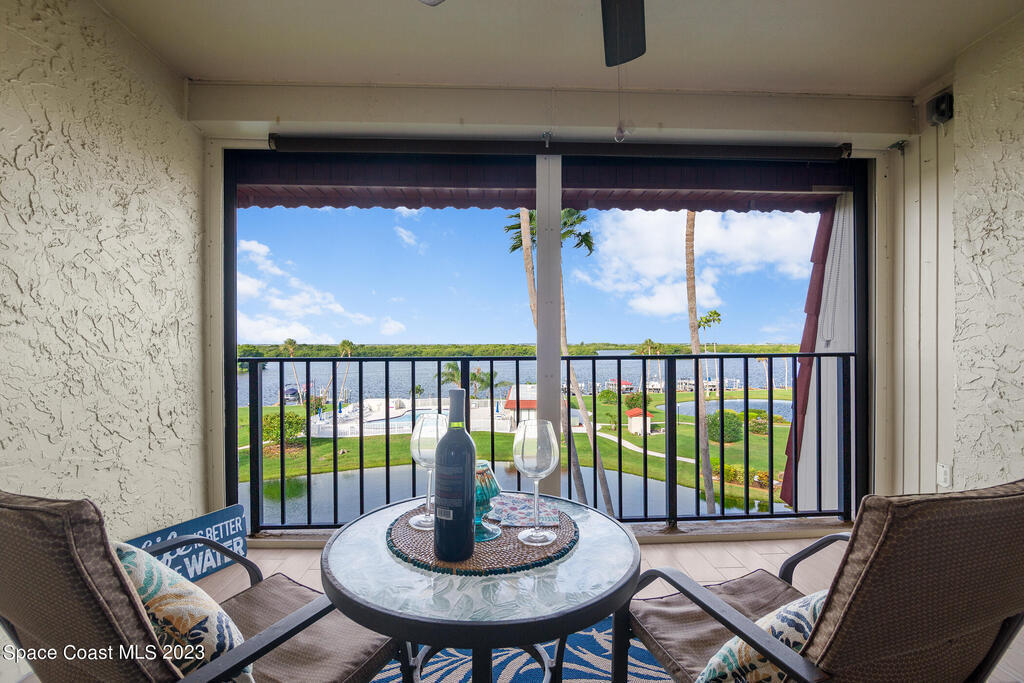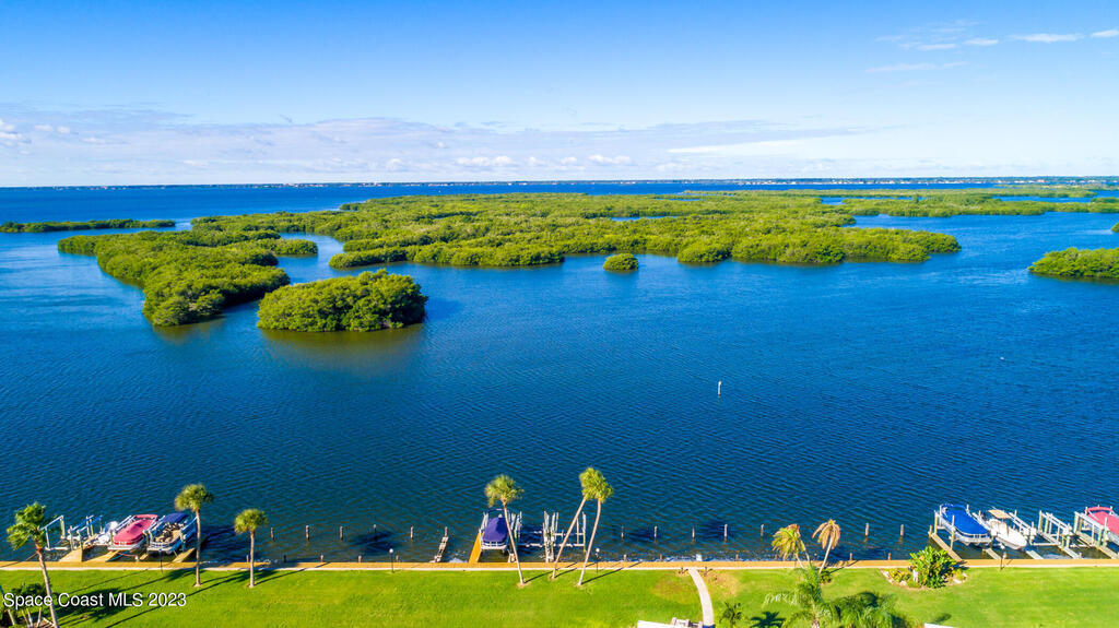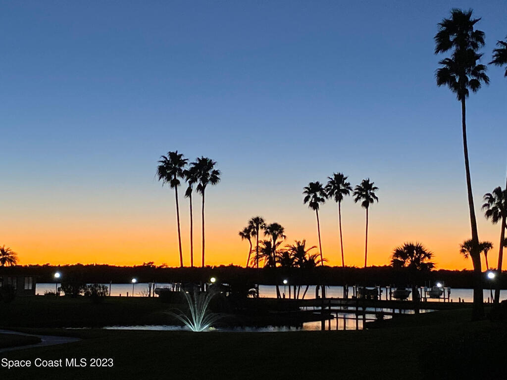 DIRECT Riverfront, TOP FLOOR FURNISHED unit with panoramic views of Thousand Islands Preserve and the Banana River, offering spectacular sunsets!! The best of beachside living on the river and only 2 short blocks to the Atlantic ocean, this remodeled unit boasts 2 bedrooms, 2 full baths, separate family/flex room, large, open living/dining room, stainless steel GE appliances, granite counter tops, Lighted breakfast bar shelving, maple cabinetry, laminate plank flooring, retractable balcony screens/shutters, Plantation shutters, and detached garage. Amenities include island style heated pool, ponds, tropical walkways, boat slip (lift can be added), riverfront Community Room, canoe/kayak rack, boat ramp, 725-ft dock to walk along, and fishing pier.