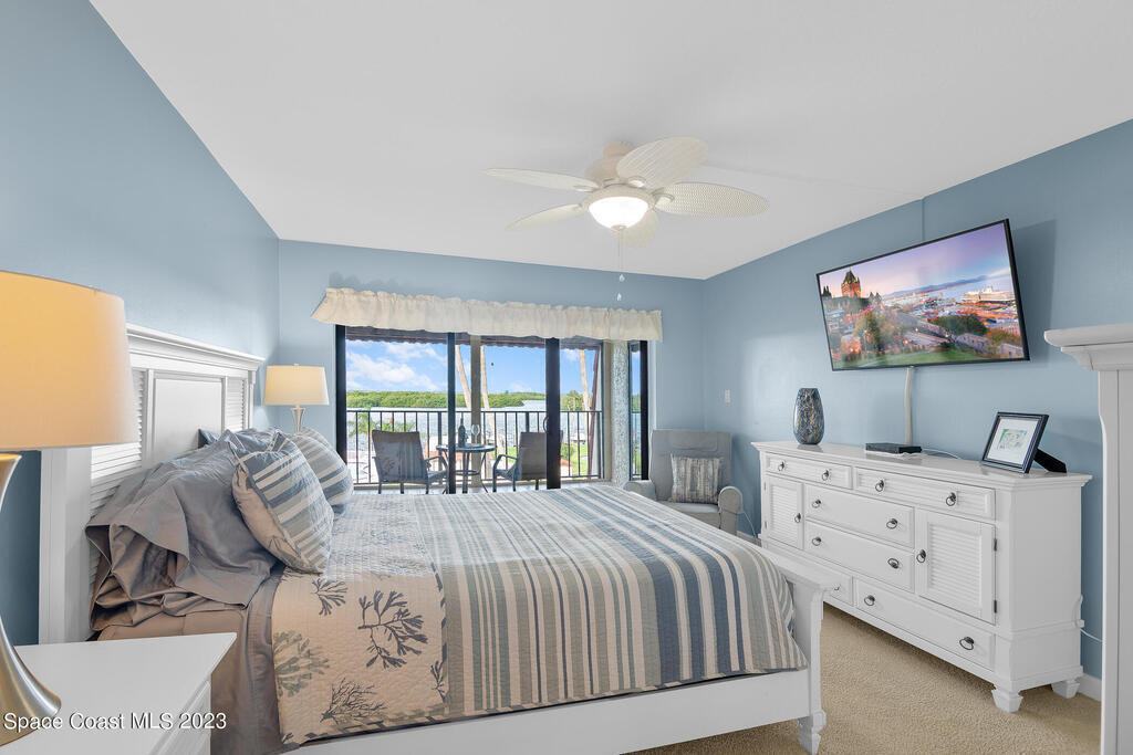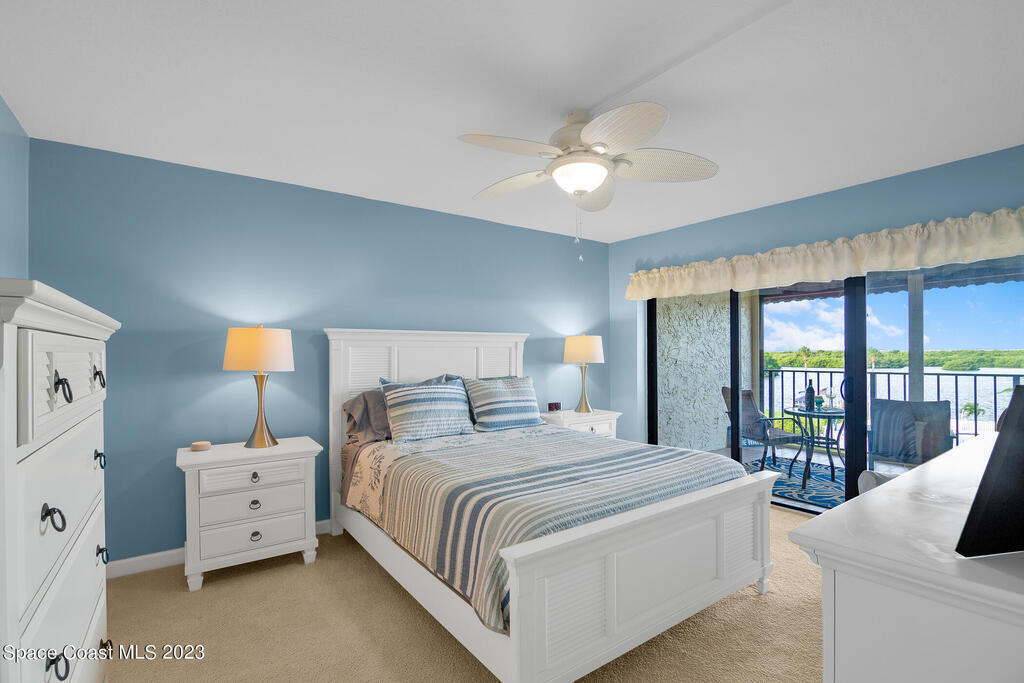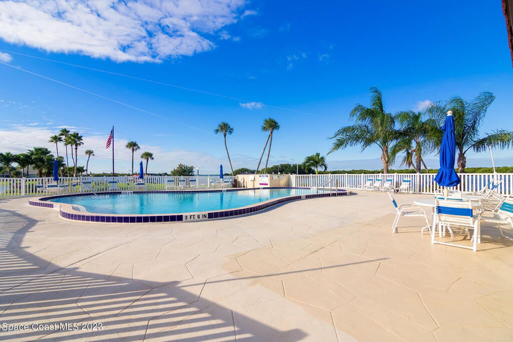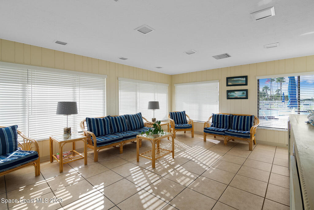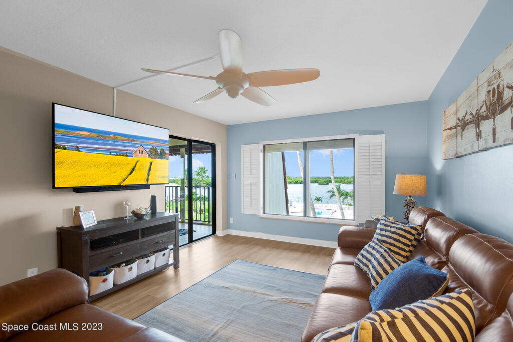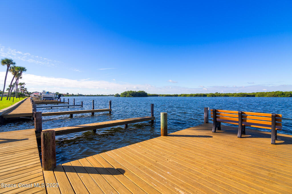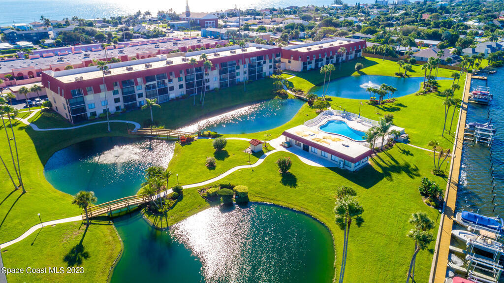 DIRECT Riverfront, TOP FLOOR FURNISHED unit with panoramic views of Thousand Islands Preserve and the Banana River, offering spectacular sunsets!! The best of beachside living on the river and only 2 short blocks to the Atlantic ocean, this remodeled unit boasts 2 bedrooms, 2 full baths, separate family/flex room, large, open living/dining room, stainless steel GE appliances, granite counter tops, Lighted breakfast bar shelving, maple cabinetry, laminate plank flooring, retractable balcony screens/shutters, Plantation shutters, and detached garage. Amenities include island style heated pool, ponds, tropical walkways, boat slip (lift can be added), riverfront Community Room, canoe/kayak rack, boat ramp, 725-ft dock to walk along, and fishing pier.