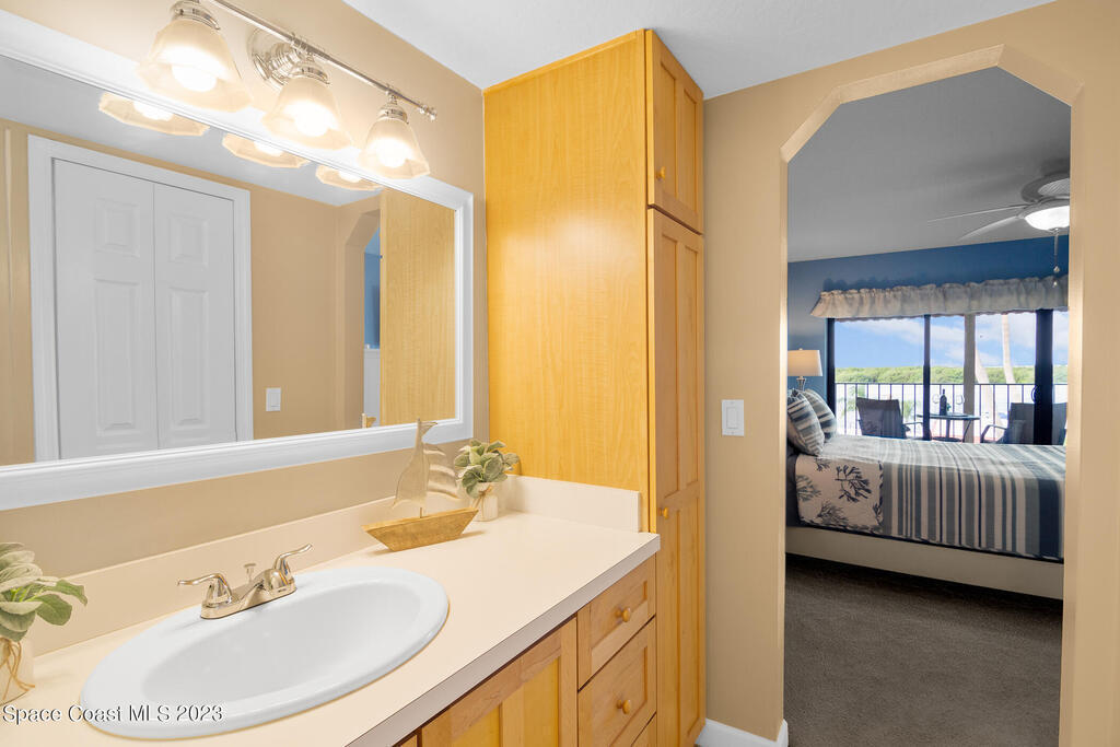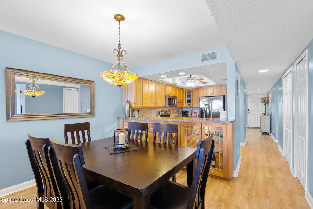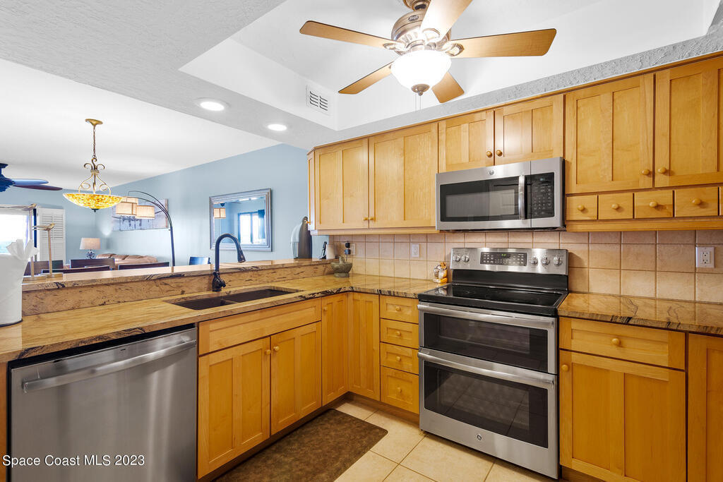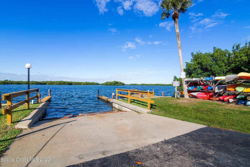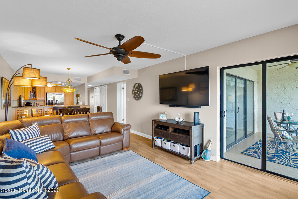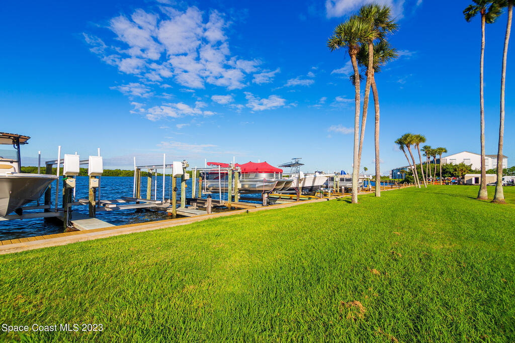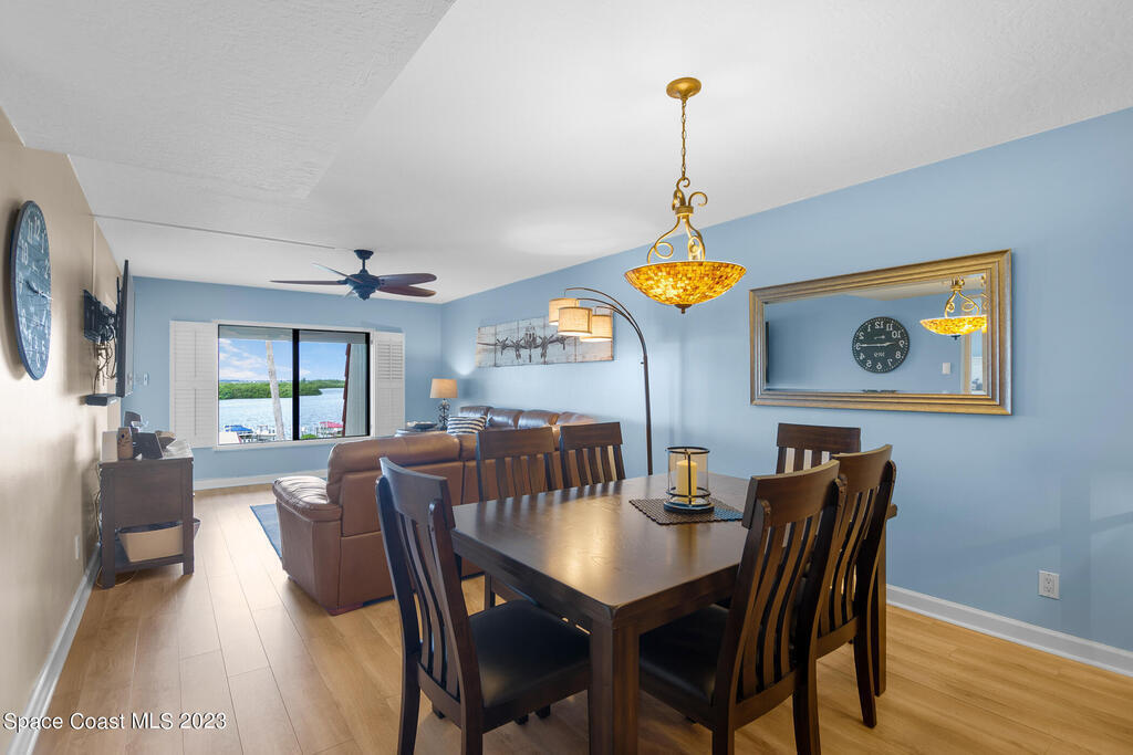 DIRECT Riverfront, TOP FLOOR FURNISHED unit with panoramic views of Thousand Islands Preserve and the Banana River, offering spectacular sunsets!! The best of beachside living on the river and only 2 short blocks to the Atlantic ocean, this remodeled unit boasts 2 bedrooms, 2 full baths, separate family/flex room, large, open living/dining room, stainless steel GE appliances, granite counter tops, Lighted breakfast bar shelving, maple cabinetry, laminate plank flooring, retractable balcony screens/shutters, Plantation shutters, and detached garage. Amenities include island style heated pool, ponds, tropical walkways, boat slip (lift can be added), riverfront Community Room, canoe/kayak rack, boat ramp, 725-ft dock to walk along, and fishing pier.