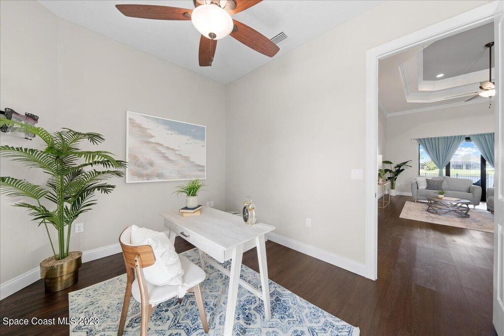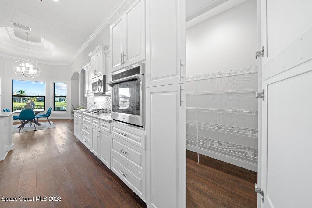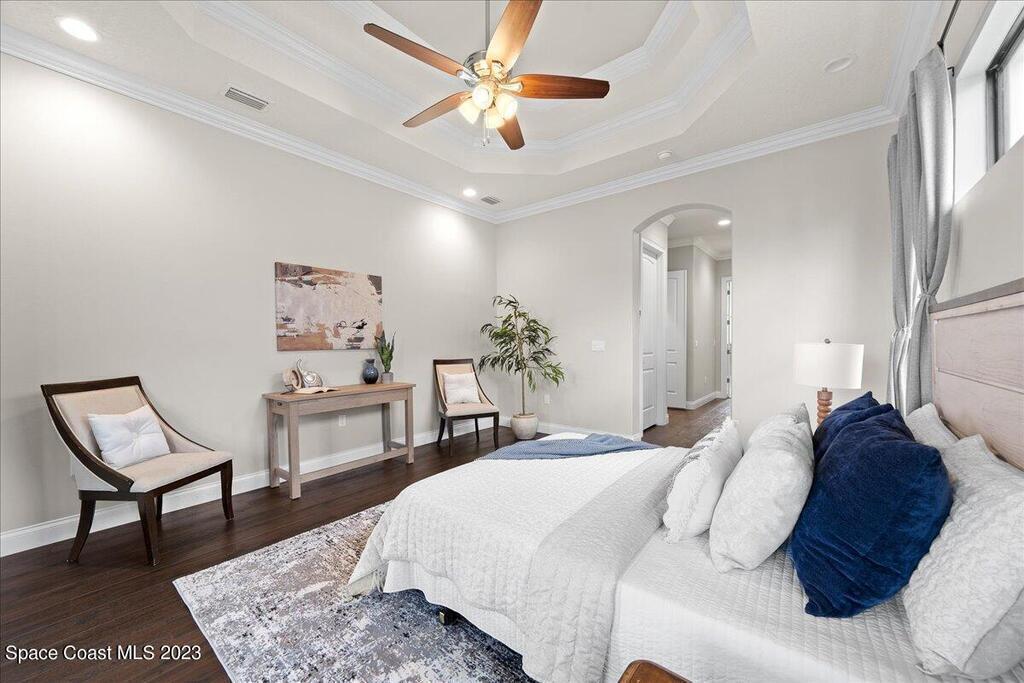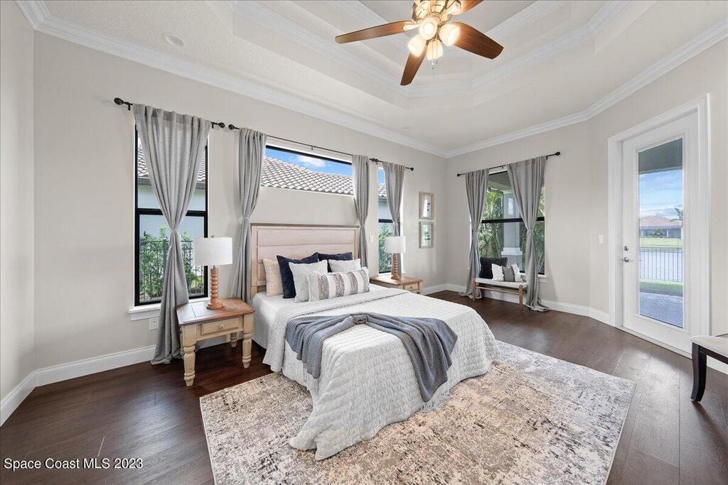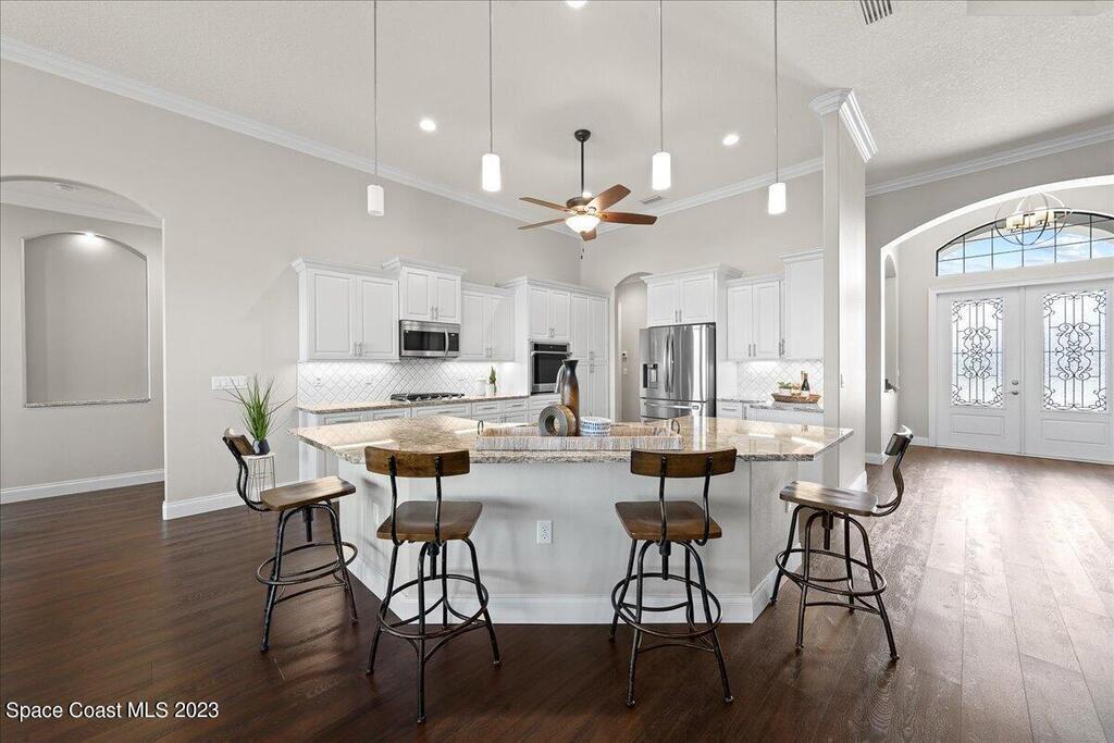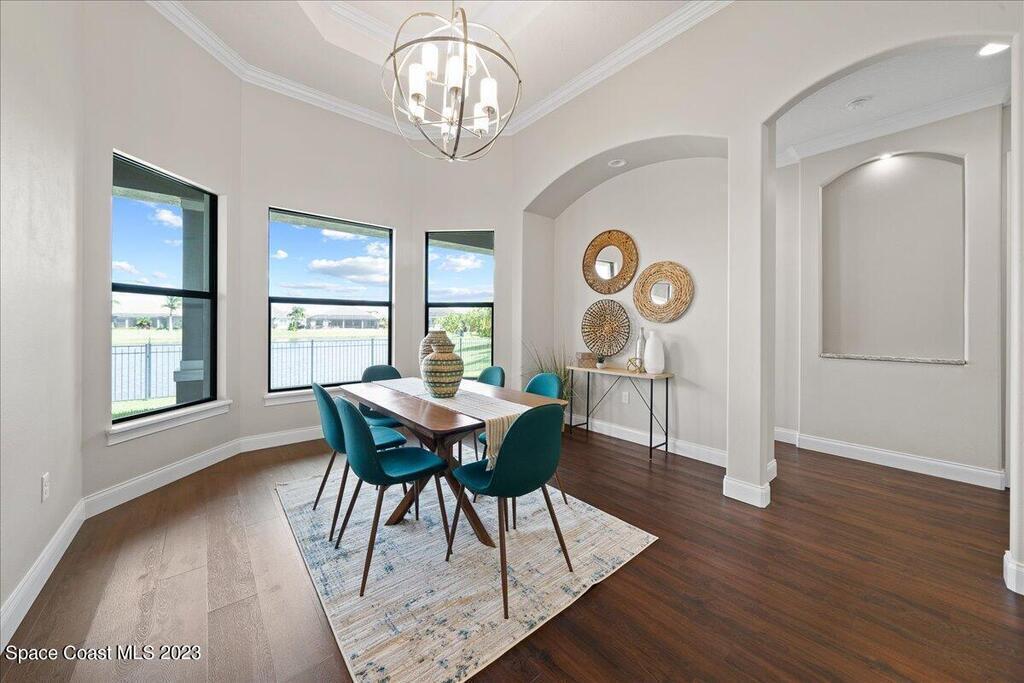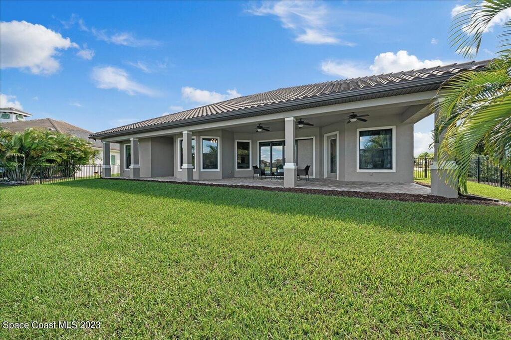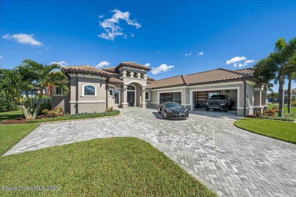 Welcome home to the luxurious gated community of Valencia located in the top 10 master planned community of Viera. This beautifully crafted custom built executive home sits on a .3 acre lake front lot offering 4 bedrooms + office, 3 baths & a side entry 4 car oversized garage built for a car enthusiast. Upon arrival the grand entrance to this home makes a huge statement coupled with the double door glass entry. As you enter you will be captivated by the soaring ceilings with double trays in the great room & dining room along with the crown molding details. The gourmet kitchen is a chefs paradise with a 5 burner gas cooktop, wall oven and huge kitchen island with ample room to prep & entertain. The kitchen showcases white painted custom cabinetry, beautiful granite countertops and a