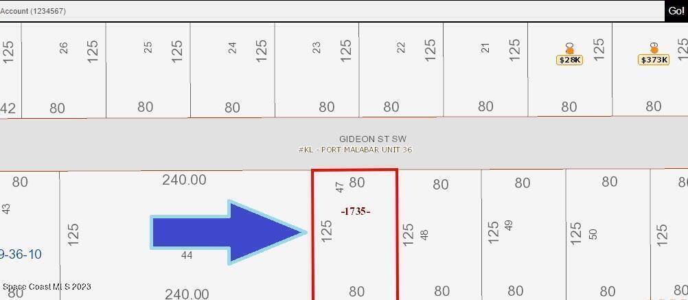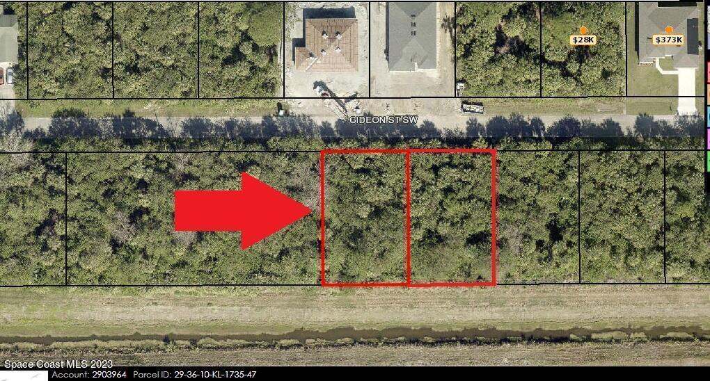 One of Two side-by-side adjacent buildable single family residential lots [Rs2 Zoning] available in Port Malabar Unit #36 of Palm Bay. Nicely located in the SW section with a drainage right-of-way easement canal in the back, these lots are just 5.6 miles -13 minutes- to Publix Shopping, 4.4 miles -9 minutes- to Bayside High and Westside Elementary Schools, 10.8 miles -25 minutes to the Melbourne Square Mall, and just 16.1 miles -33 minutes to the beaches in Indialantic. From Exit #176 of I-95 go west on Palm Bay Road NE. Turn right on Minton Road and proceed south for 3.3 miles. Turn right on Malabar Road and proceed west 1 mile. Turn left on Garvey Road. Go 1.3 miles and turn right on Harper Boulevard SW. Proceed 1.2 miles and turn left on Natroma Avenue and right on Gideon Street SW.