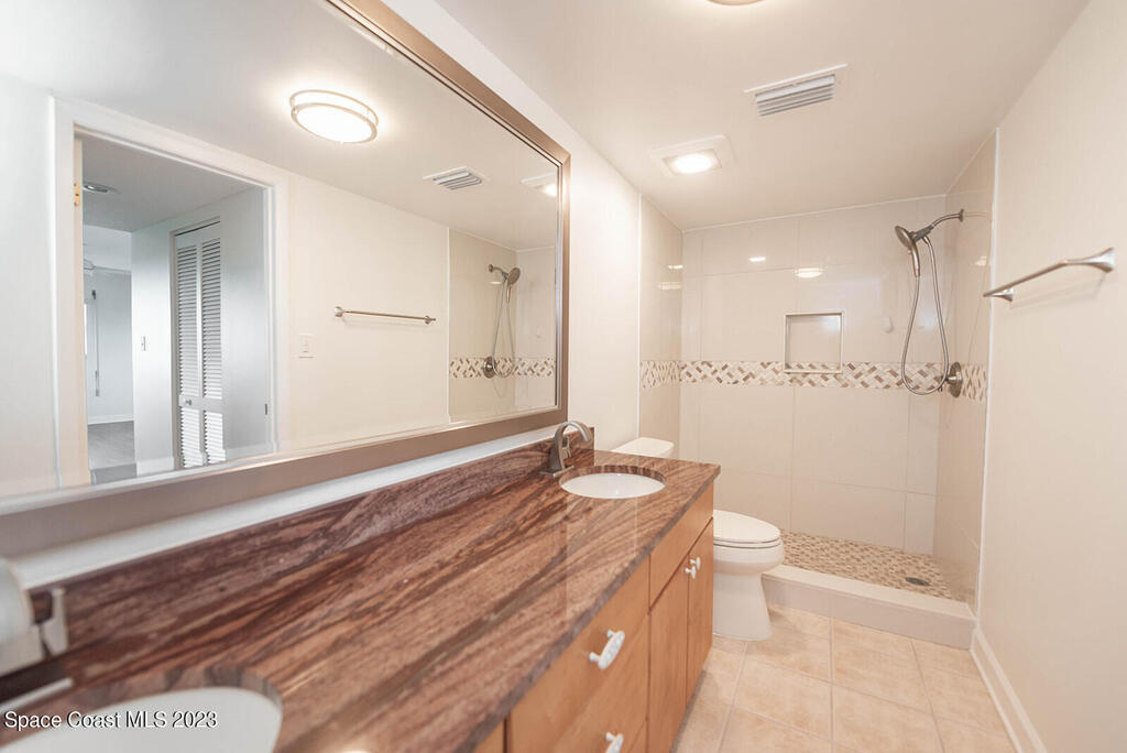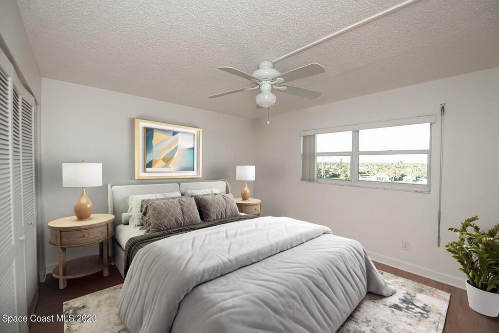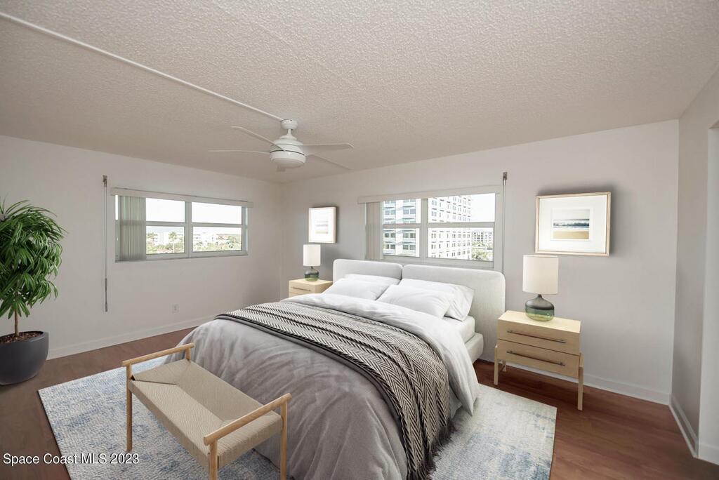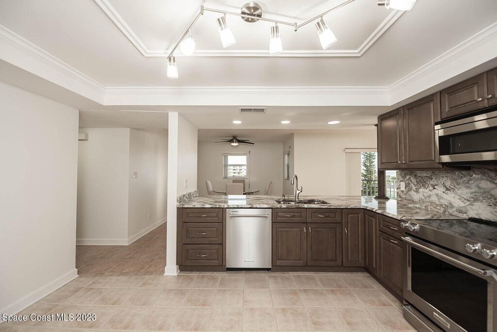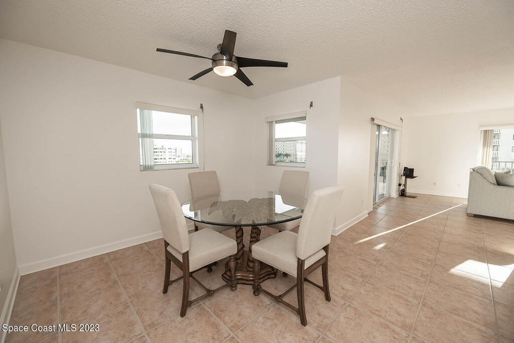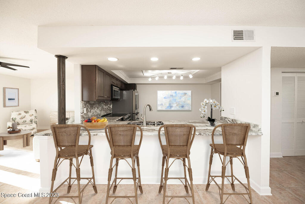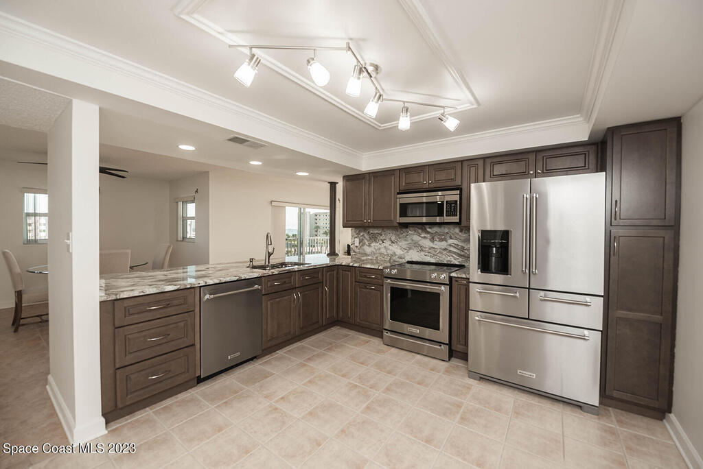 The views of Cocoa Beach can't be beat in this top floor, freshly painted end unit with wrap around balcony. This tastefully updated home is move-in ready & has all of the amenities you've been looking for. Enjoy a chef's kitchen complete with new Kitchenaid appliances & designer granite countertops. Adjacent to the kitchen is an oversized laundry room with plenty of storage for pantry items & other essentials. The primary suite boasts two expansive closets & an updated bath with double vanity. With amazing views from the living area, dining room, & balcony, the only decision to make is where you'll choose to enjoy your morning coffee or evening cocktails. Abundant storage options are included both inside the condo & in the private single car garage conveniently located to the elevator.