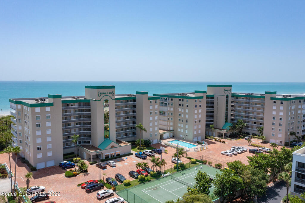 Enjoy paradise from the large Oceanfront balcony that stretches from the living room to the Bedroom suite. Floor to ceiling sliders allow for a large view to the beach. A large kitchen, breakfast bar & pantry closet. The primary suite features ocean views, walk-in closet, double sink vanity, jetted bath & shower. Private hallway leads to 2 guest bedrooms, a bath & laundry room. 4th bedroom or flex space is being used as a den. Emerald Seas is a secure gated community that offers great amenities including swimming pool & hot tub, tennis court, updated clubhouse w/kitchen, private beach access & exercise room. Located on much desired Ocean Beach Blvd, away from busy A1A, this is a must see