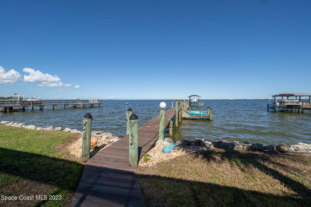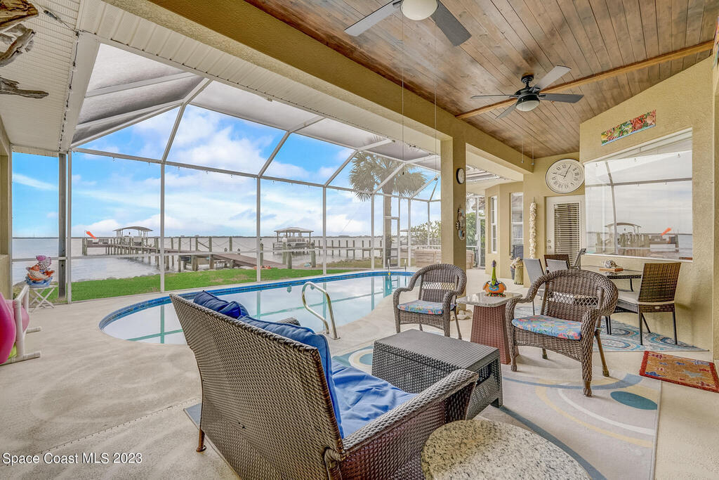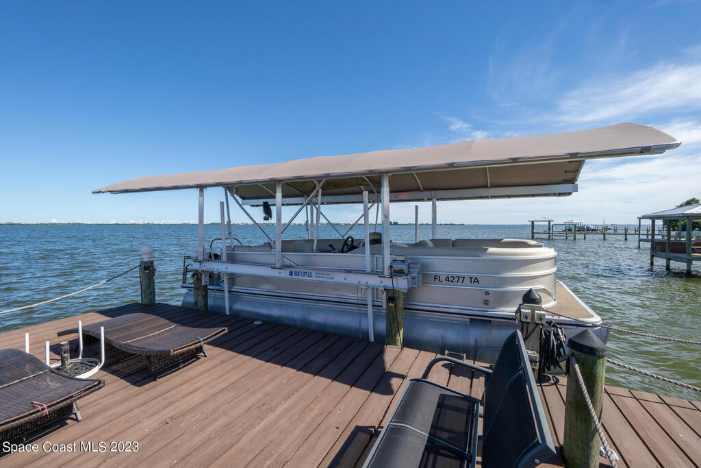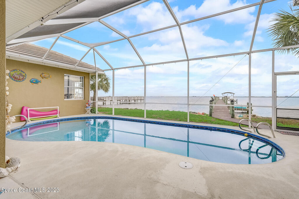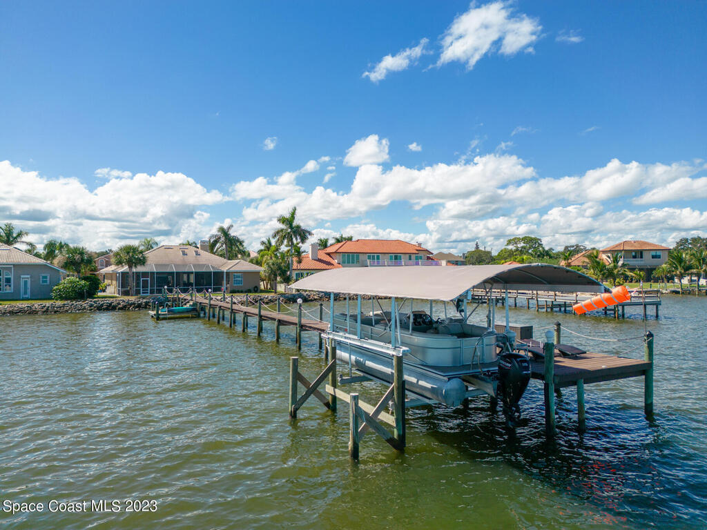 RIVERFRONT POOL HOME, the perfect BOATERS PARADISE with 5 foot draft at the end of the 160ft Dock with a new 10k lbs Boat lift. NEW ROOF 2024 with 25 Year non prorated transferrable Warranty. A kayak deck for easy on and off. Enjoy a day on the water and relax pool side with dinner overlooking the Banana River. Open the large sliders that make your home flow from indoor to outdoor living, light the gas fireplace giving you the feel of a cool evening Caribbean resort. Tall ceilings, and new tile plank flooring, create the perfection of resort home. Easy maintenance home with rock sea wall, heated pool and granite kitchen counters, Convenient location within minutes of the beach and with easy access to I-95 and the Orlando attractions.