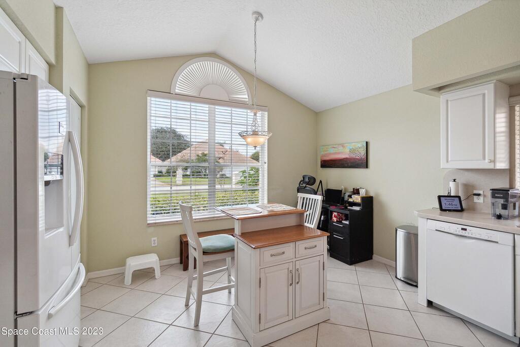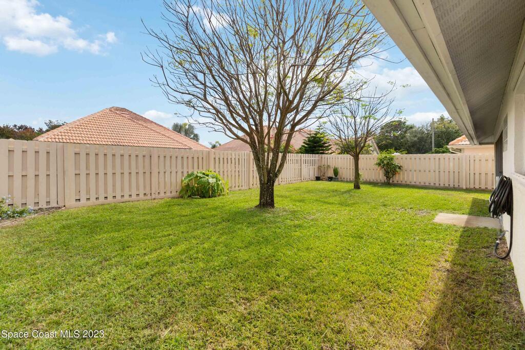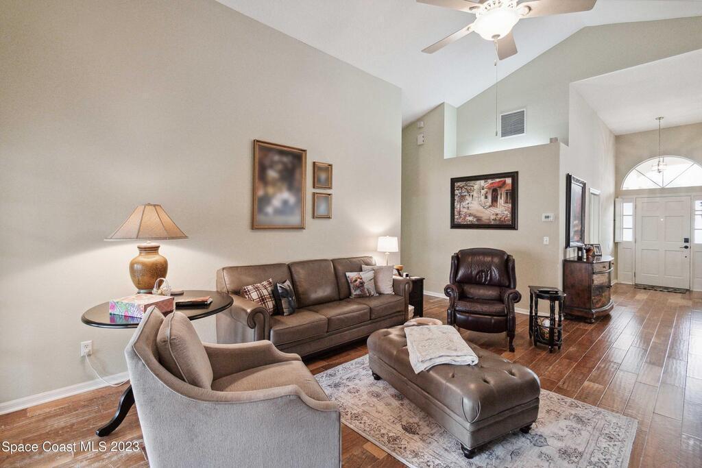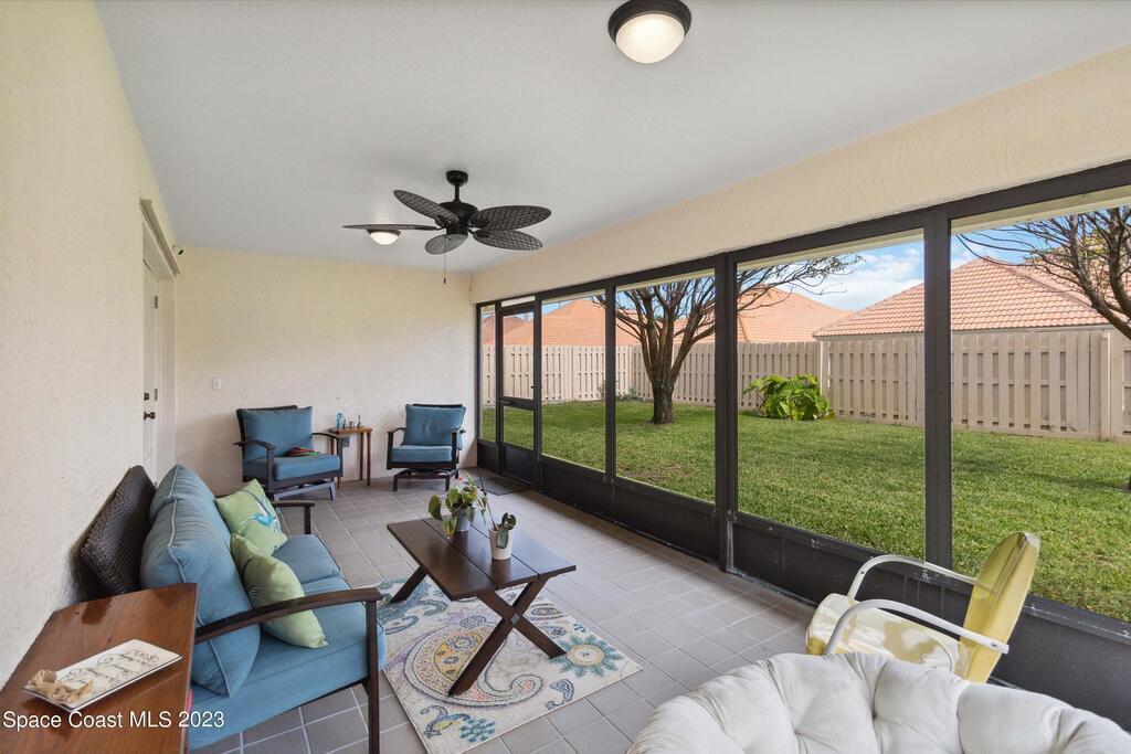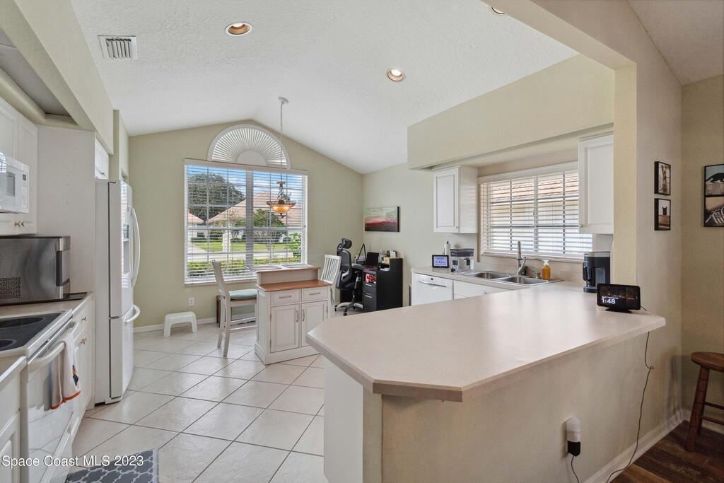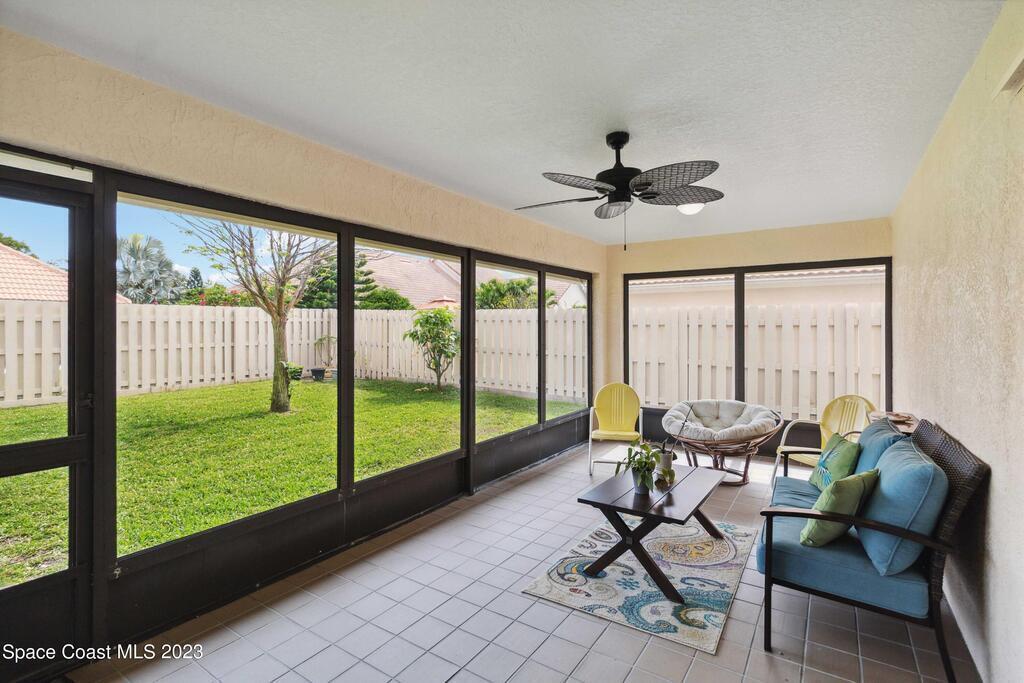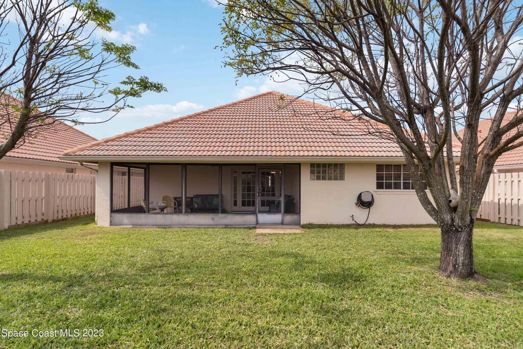 Welcome to Titusville. Tucked away in the back of Titusvillage. This Bob Donaldson home has 3 bedroom two bath, vaulted ceilings, ceramic and wood look flooring in addition to a Ceramic tile roof. The chef friendly kitchen has plenty of open space as well as counter space, cabinets and modern appliances. The owner suites has a custom walk in closet with floor to ceiling shelving, racks and storage. The back yard is fenced in for privacy and pets. It's great for entertaining too. It has enough room for you to add a pool. ADT security system is monitored and able to be transferred to new owner. Most furniture is available for purchase. HOA is paid quarterly and includes lawn service.