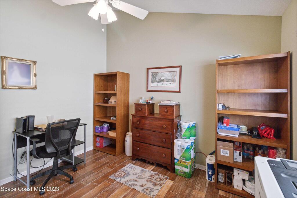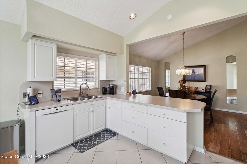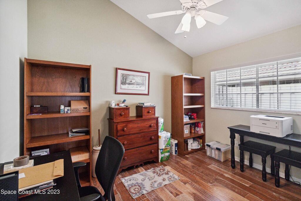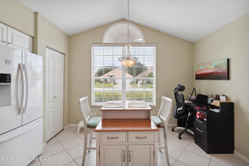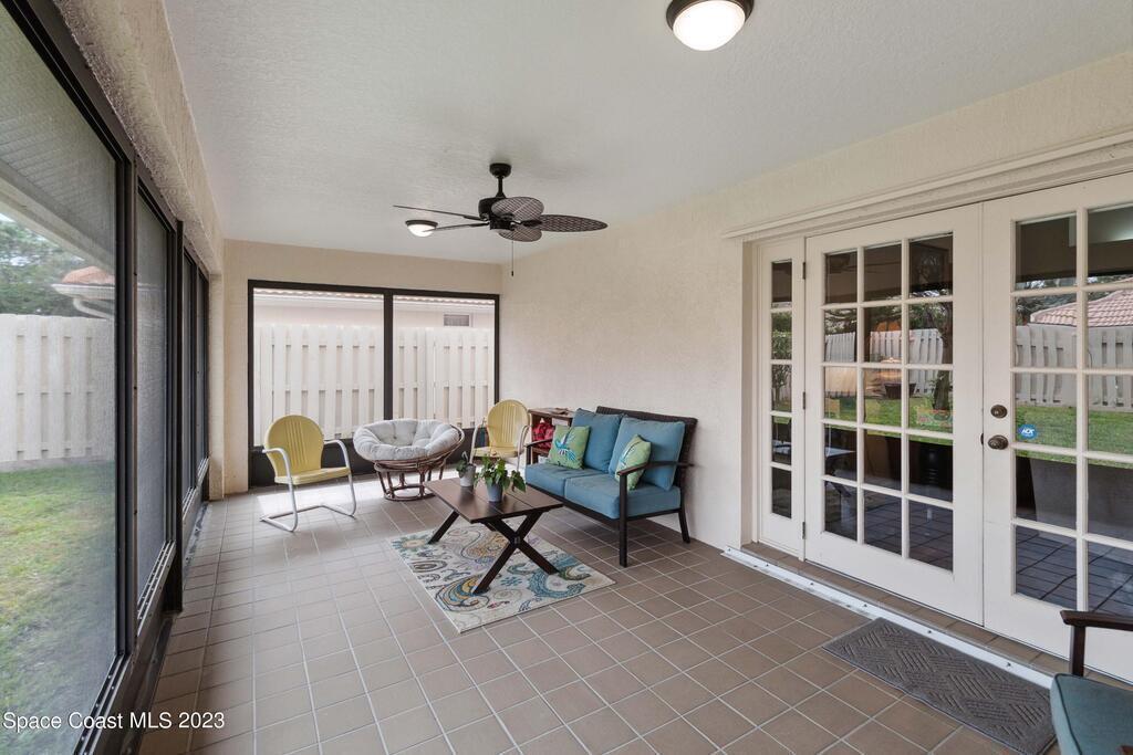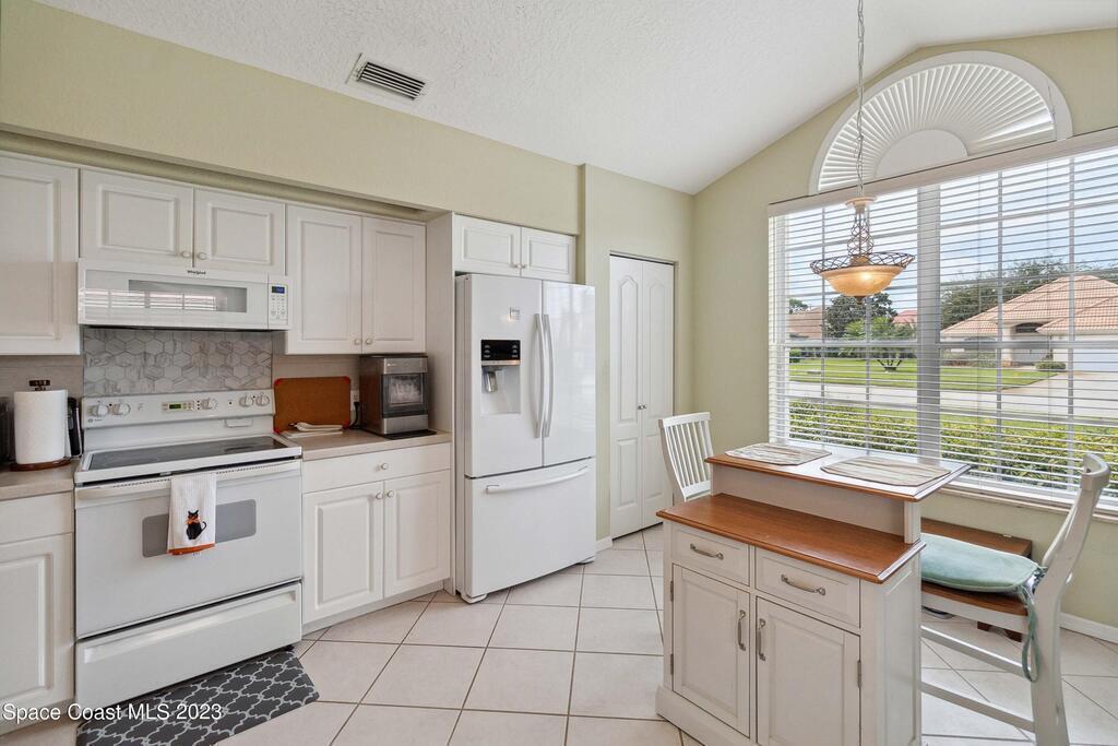 Welcome to Titusville. Tucked away in the back of Titusvillage. This Bob Donaldson home has 3 bedroom two bath, vaulted ceilings, ceramic and wood look flooring in addition to a Ceramic tile roof. The chef friendly kitchen has plenty of open space as well as counter space, cabinets and modern appliances. The owner suites has a custom walk in closet with floor to ceiling shelving, racks and storage. The back yard is fenced in for privacy and pets. It's great for entertaining too. It has enough room for you to add a pool. ADT security system is monitored and able to be transferred to new owner. Most furniture is available for purchase. HOA is paid quarterly and includes lawn service.