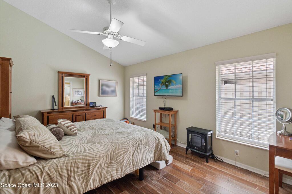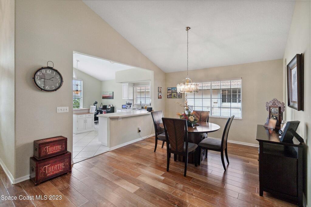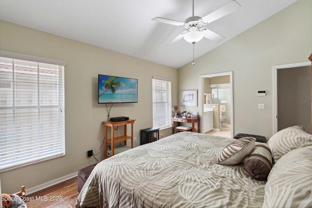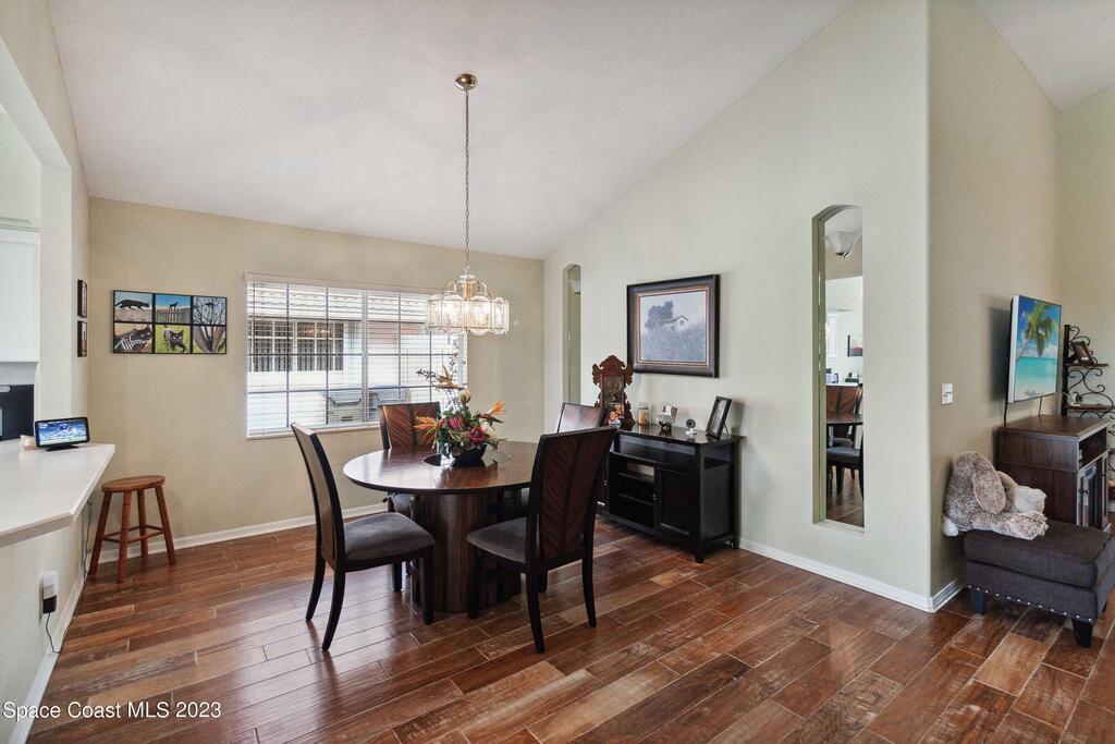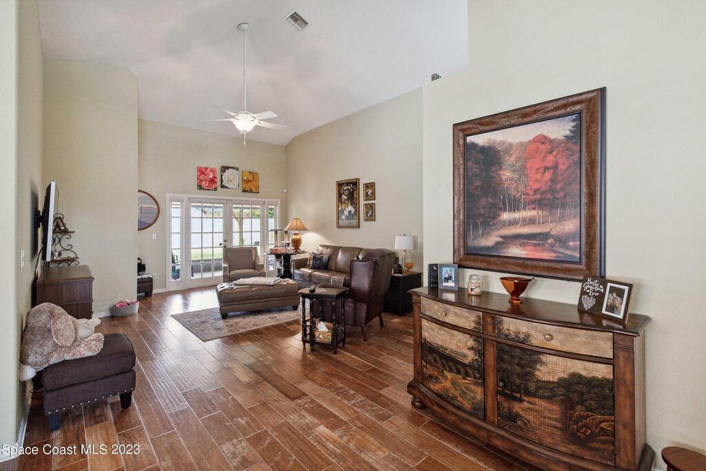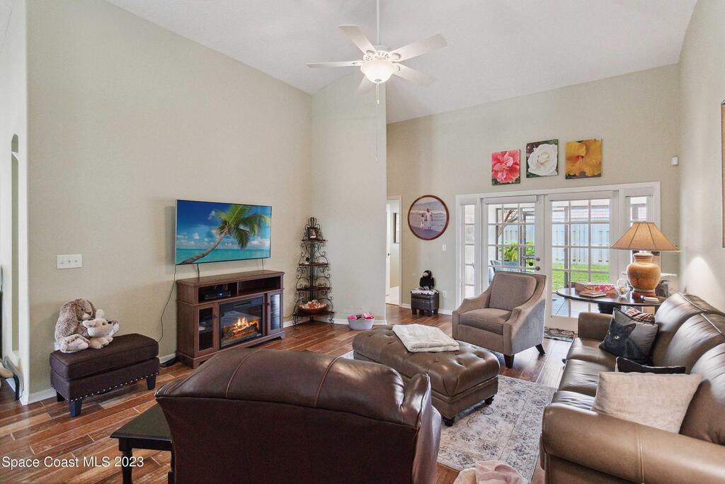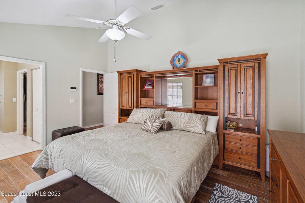 Welcome to Titusville. Tucked away in the back of Titusvillage. This Bob Donaldson home has 3 bedroom two bath, vaulted ceilings, ceramic and wood look flooring in addition to a Ceramic tile roof. The chef friendly kitchen has plenty of open space as well as counter space, cabinets and modern appliances. The owner suites has a custom walk in closet with floor to ceiling shelving, racks and storage. The back yard is fenced in for privacy and pets. It's great for entertaining too. It has enough room for you to add a pool. ADT security system is monitored and able to be transferred to new owner. Most furniture is available for purchase. HOA is paid quarterly and includes lawn service.