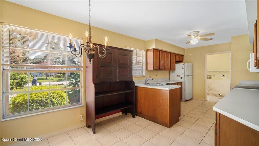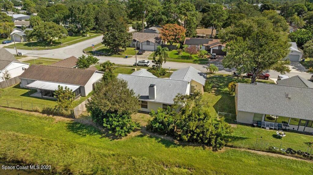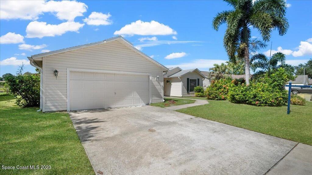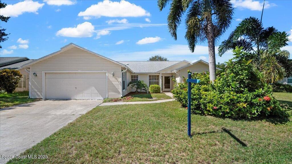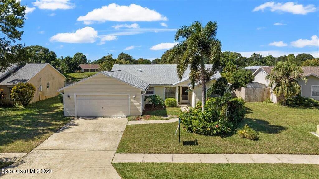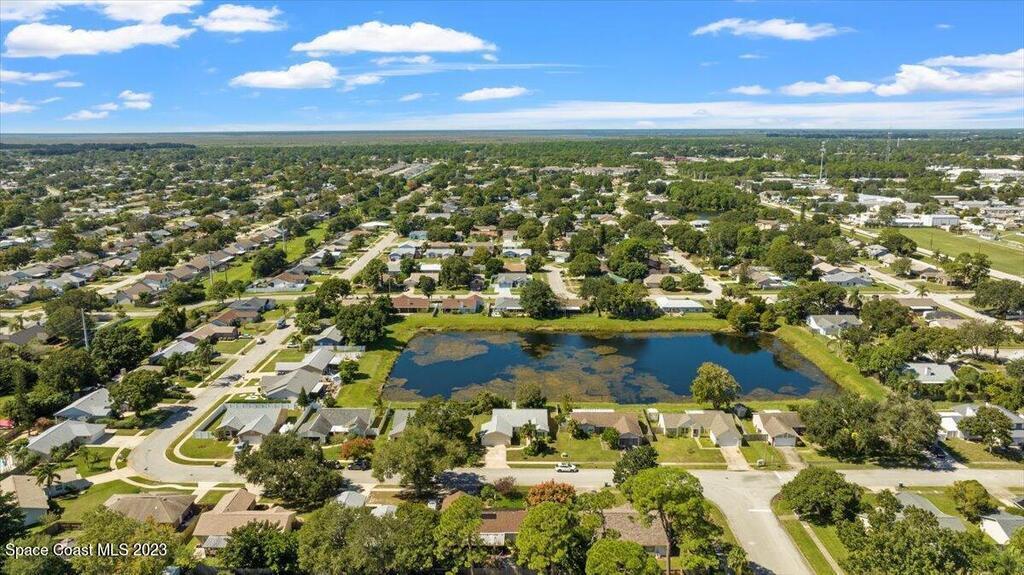 Here's a great opportunity to purchase at a lower price & remodel into the home of your dreams! Open floor plan with vaulted ceilings, split bedroom design, interior laundry, screened patio & pond view. Kitchen has breakfast nook & pass thru to dining area. This is a project home - everything needs to be updated. Recent improvements: roof 2019, vinyl siding 2013, water heater 2022 & HVAC 2017. Primary bedroom features walk in closet & en-suite with shower, double sinks. Tile flooring throughout with carpet in bedrooms. Popcorn ceiling texture loose in some areas. Possible plumbing leak in primary walk-in closet. Screened patio. Trim vegetation for better water view. Convenient location - easy access to I-95, Hwy 1, KSC & related space industry businesses, cruise port, shopping & beaches