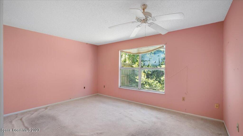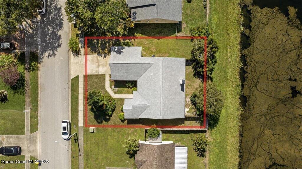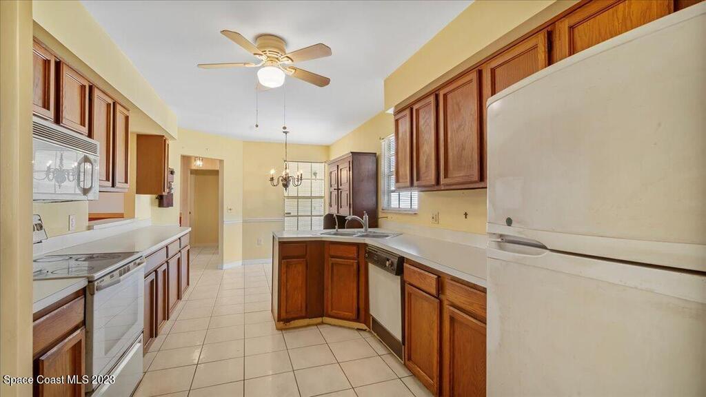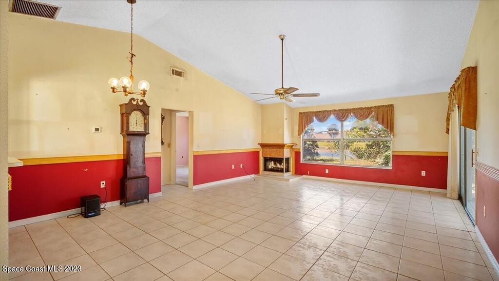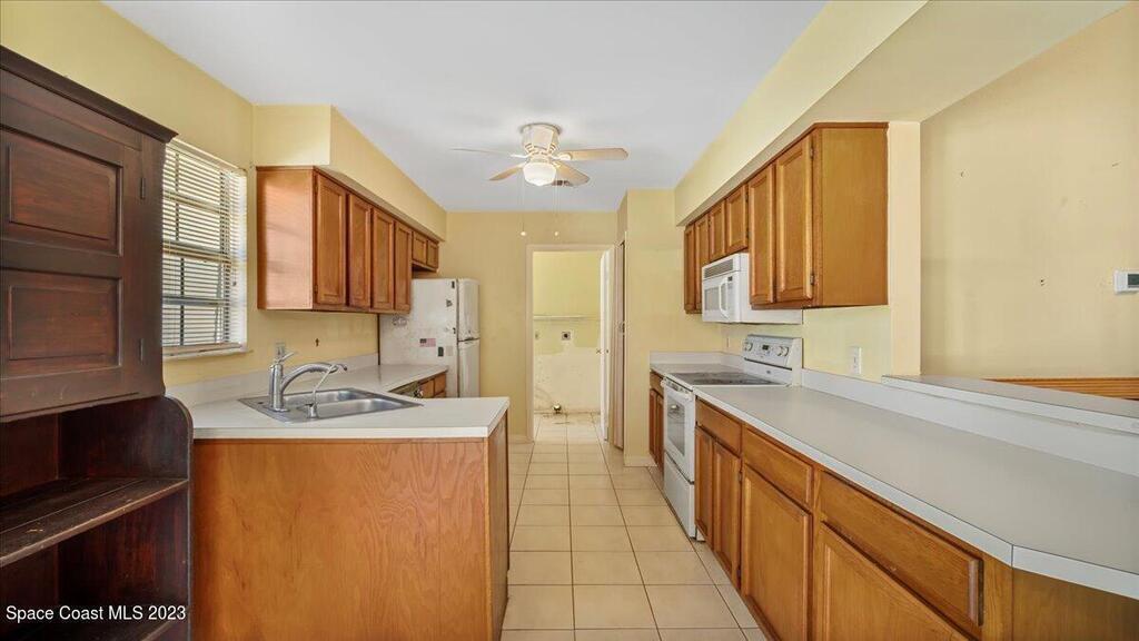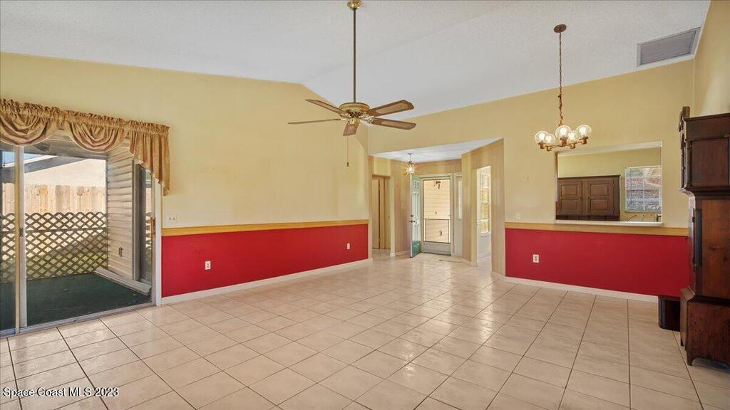 Here's a great opportunity to purchase at a lower price & remodel into the home of your dreams! Open floor plan with vaulted ceilings, split bedroom design, interior laundry, screened patio & pond view. Kitchen has breakfast nook & pass thru to dining area. This is a project home - everything needs to be updated. Recent improvements: roof 2019, vinyl siding 2013, water heater 2022 & HVAC 2017. Primary bedroom features walk in closet & en-suite with shower, double sinks. Tile flooring throughout with carpet in bedrooms. Popcorn ceiling texture loose in some areas. Possible plumbing leak in primary walk-in closet. Screened patio. Trim vegetation for better water view. Convenient location - easy access to I-95, Hwy 1, KSC & related space industry businesses, cruise port, shopping & beaches