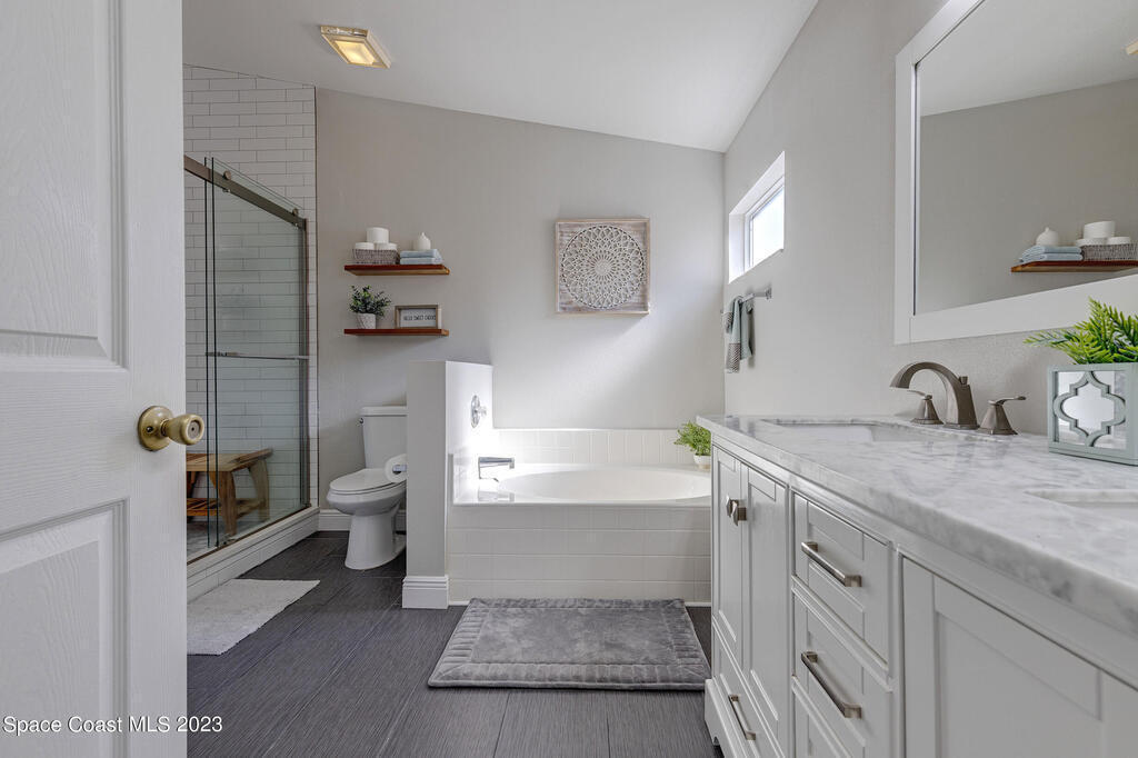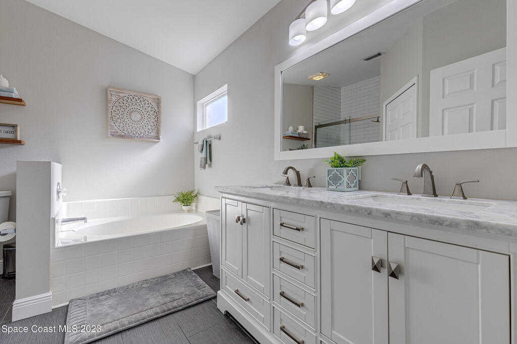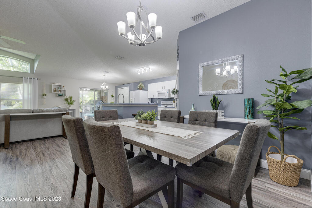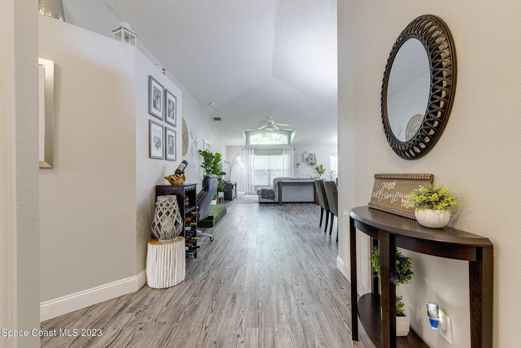 Nestled in the Viera East community, Bayhill, this well-kept 3-bedroom, 2-bathroom residence offers a blend of modern comfort and natural serenity. Featuring a split bedroom plan, an open, entertaining-friendly layout, and an lush outdoor space, this home is designed for relaxation and good times. When entering, you'll be greeted by a spacious, light-filled living area with easy-to-maintain luxury vinyl flooring that creates a warm and inviting atmosphere. The open layout provides an ideal setting for gatherings and quality time with family and friends. The master suite features a beautifully updated bathroom with tile floors, a double vanity, a comfortable soaking tub, and a separate shower. The true magic of this home is found outside. Step onto the screened-in porch through the