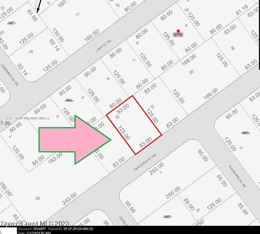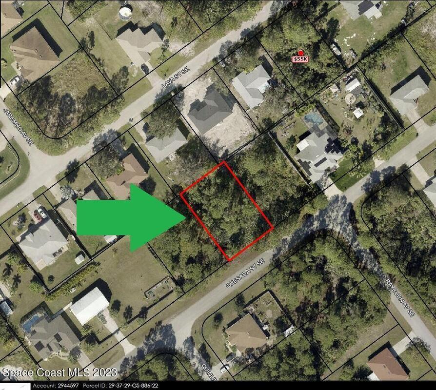 Oversized 0.24 acre buildable single family residential lot (Rs2) zoning available in Port Malabar Unit #22 of Palm Bay. Located in the rural SE section, this lot is just 3.9 miles -8 minutes- to Publix Shopping, 5.1 miles -9 minutes- to Bayside High and WestSide Elementary Schools, 5.4 miles -11 minutes- to the Shoppes of Palm Bay, and just 14.6 miles -32 minutes- to the Indialantic beaches. From Exit #173 of I-95 go west on Malabar Road SE. Turn left on San Filippo Drive SE and proceed south for 4.8 miles. Turn right on Eldron Boulevard SE and left on Quesada Street SE. The lot will be on your right