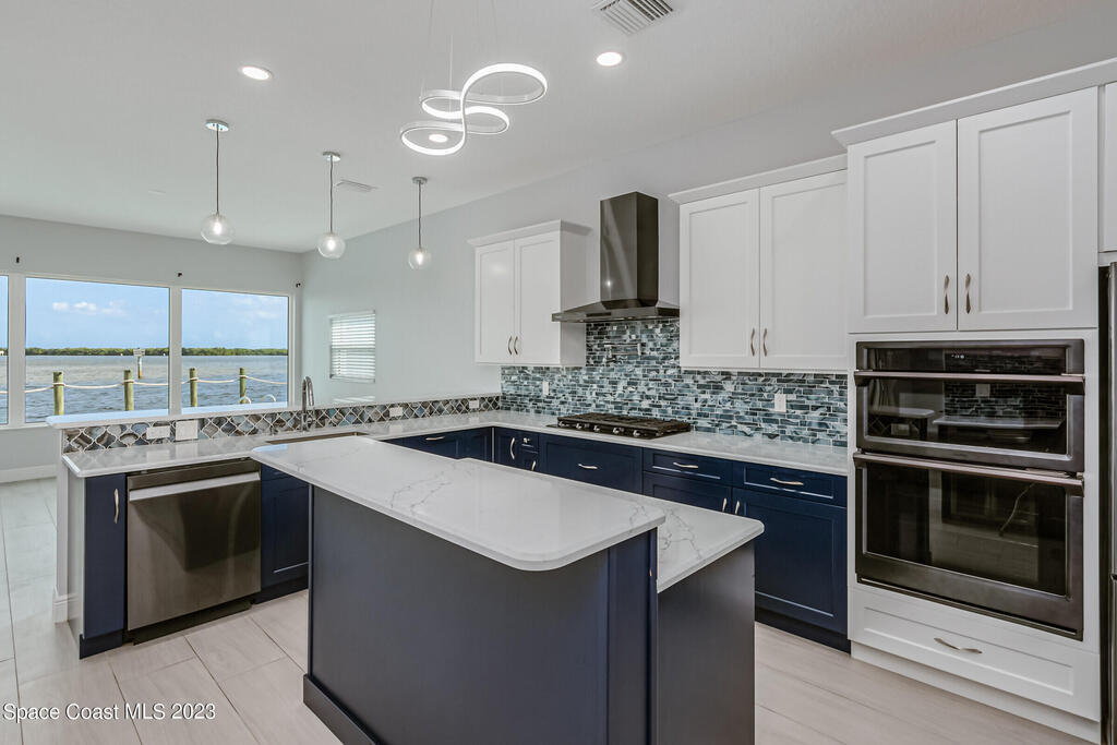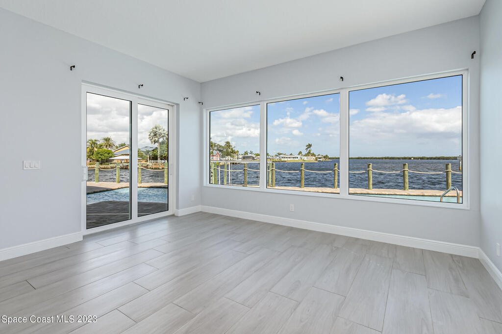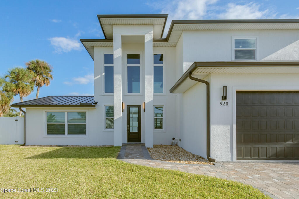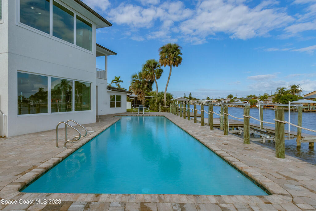 BEST WATERFRONT VIEW ON SYKES CREEK!! Indulge in the epitome of stunning water views and modern design. This 2020 new build offers 4 bedrooms, 3 full baths and one 1/2 bath. The interior elegance includes a coastal kitchen which was tailored to enhance the beauty of the surrounding waterfront. A true testament to both style and practicality! SS appliances, walk in pantry, pot filler, gas range, and beverage cooler! The upstairs offers a large balcony to relax or watch the rocket launches. The view from the upstairs Primary bedroom is nothing short of breathtaking! Wait until you see the Primary bathroom - mesmerizing! Upstairs you will find an en suite also with a full bath that is exquisitely designed. The exterior presents a one of a kind 50ft. poo