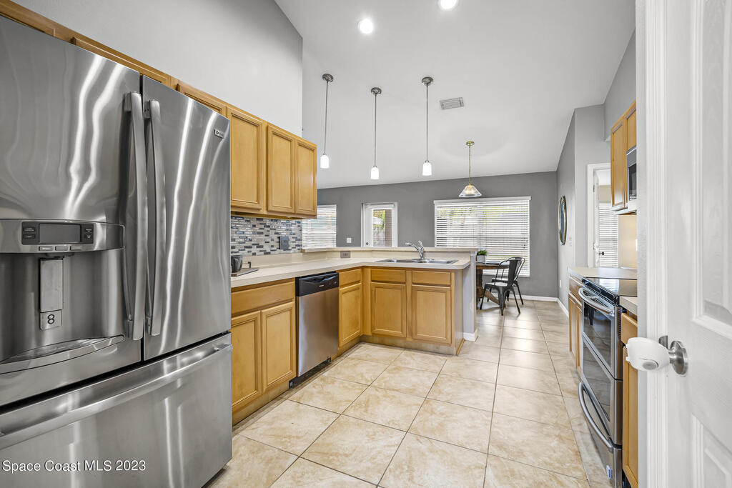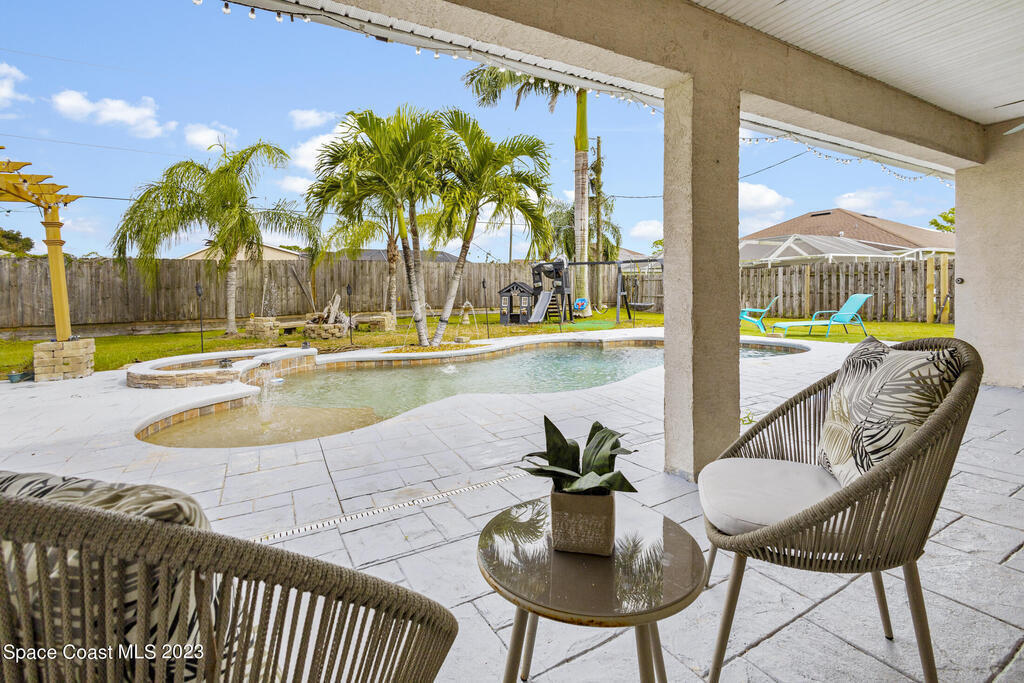 This 2100+sf 4br (plus office!) tropical oasis POOL home is a must see! New roof, new A/C, new flooring! The spacious open floor plan showcases gorgeous views into the amazing backyard wonderland. Fenced backyard with a stunning pool and spa featuring a beach area, fountains, and waterfall. Large patio features pergola with extensive BBQ space and plenty of room for family and friends including a fire pit with seating! Access your playground with ease through any of 3 separate back doors- the main living area, a private exit through the master suite, or the private exit through the guest bedroom! Master suite features two walk in closets, a separate walk in shower, large garden soaker tub and double sink vanity with ample storage space. MUST SEE!