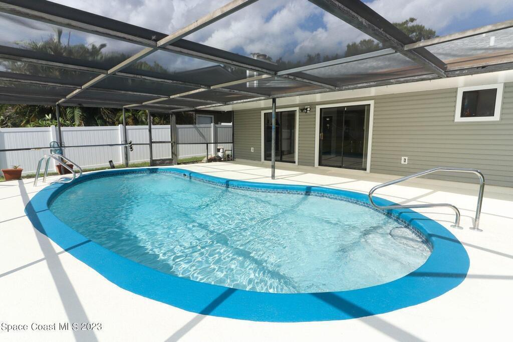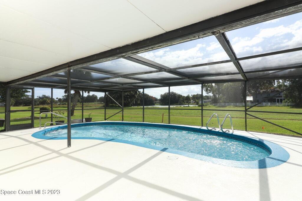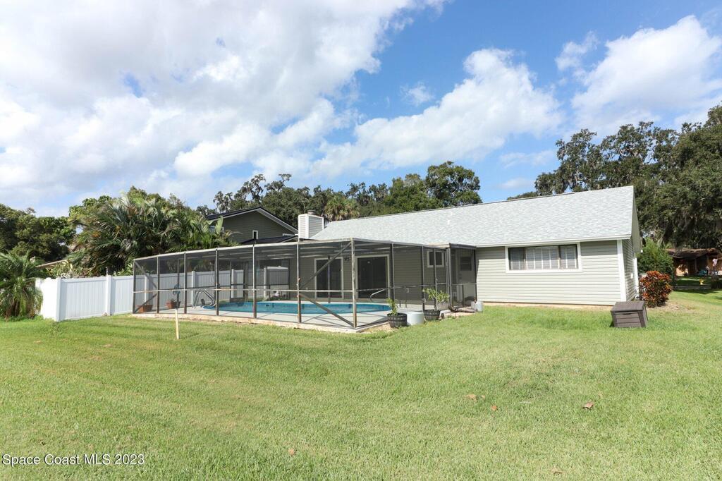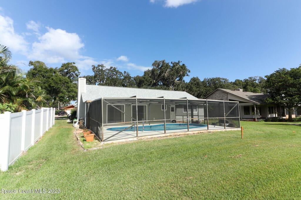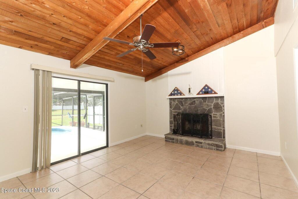 BACK ON MARKET. Buyers' contingency fell through.Welcome home to this spacious POOL home in the quiet neighborhood of Sherwood Villas in Titusville. This home features 3 bedrooms, an office (no closet), and a large bonus room, which can be used as flex space or a 4th bedroom. The kitchen has a stainless steel range and dishwasher. The home also offers an oversized great room with a wood-burning fire place, as well as a separate dining room. The great room boasts a beautiful cedar ceiling. The pool includes a screened enclosure as well as some covered space. So many recent improvements including new roof in 2021, AC - 2019, pool re-surfaced in 2023, new vinyl siding in 2022, hurricane impact garage door and new opener in 2023, gutters in 2022.