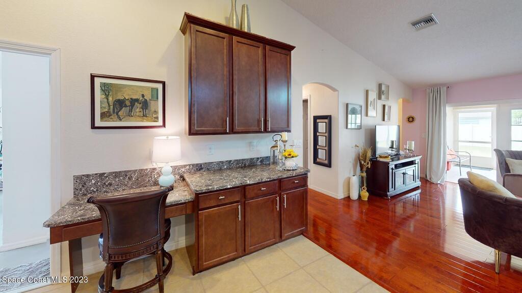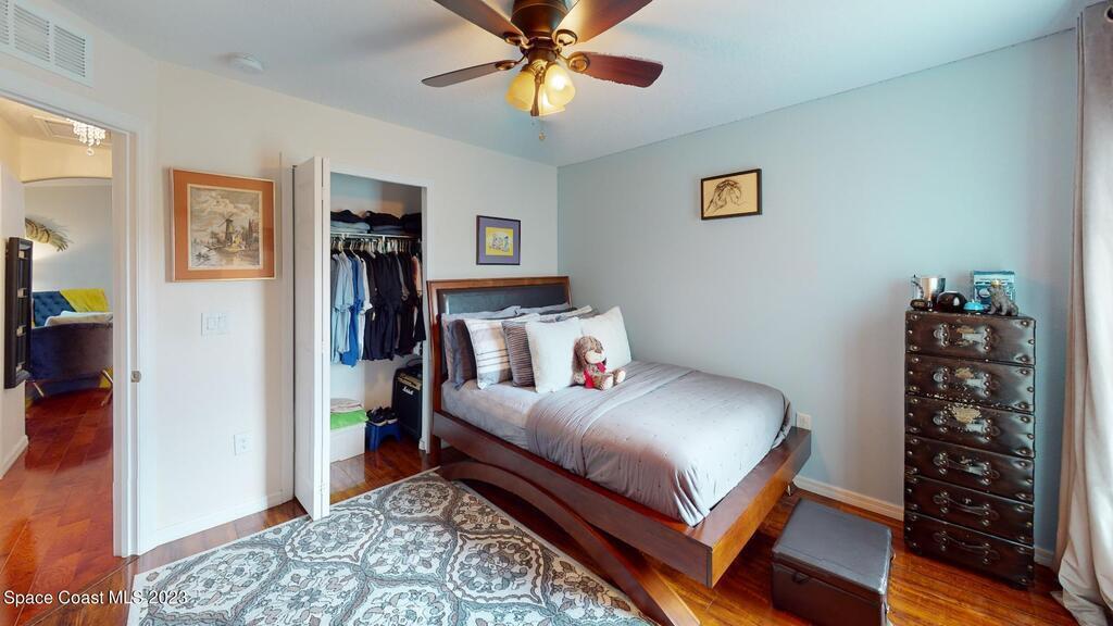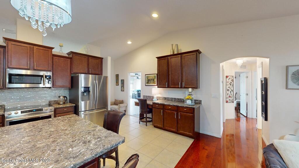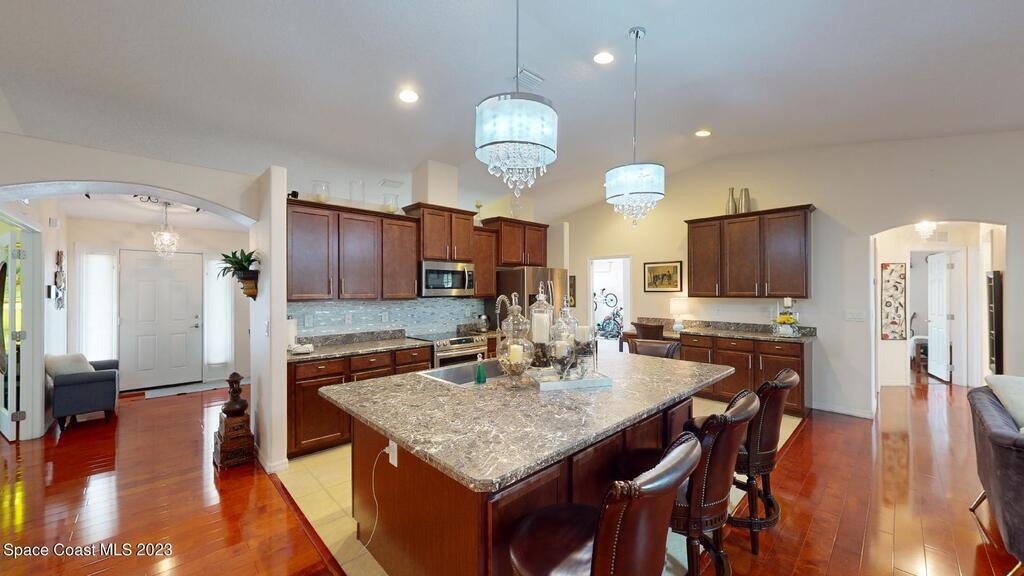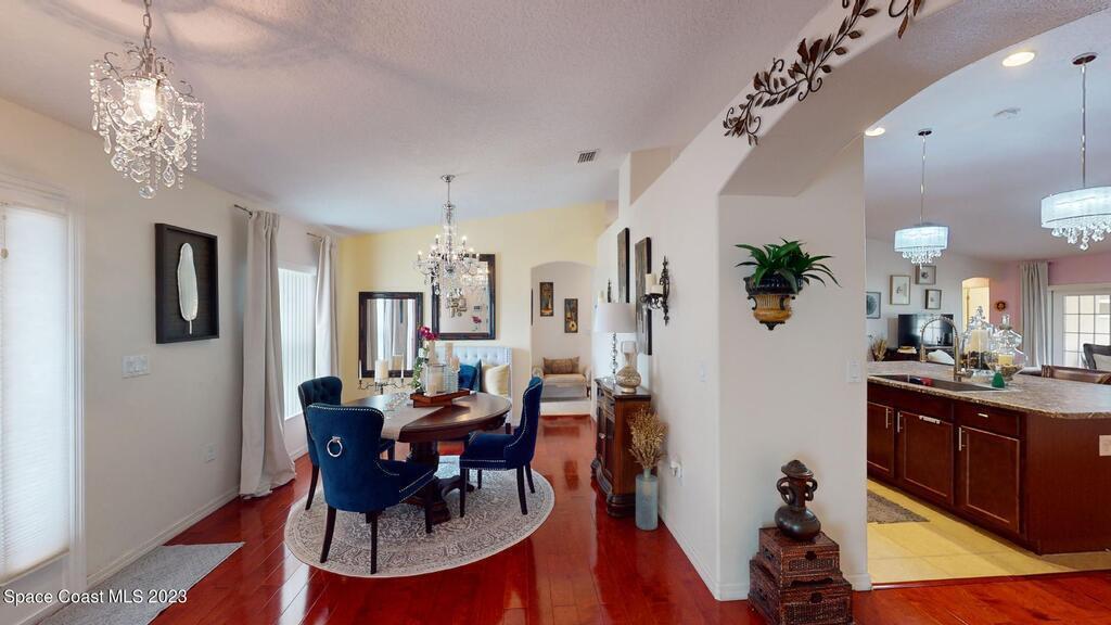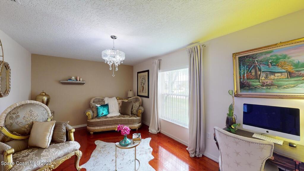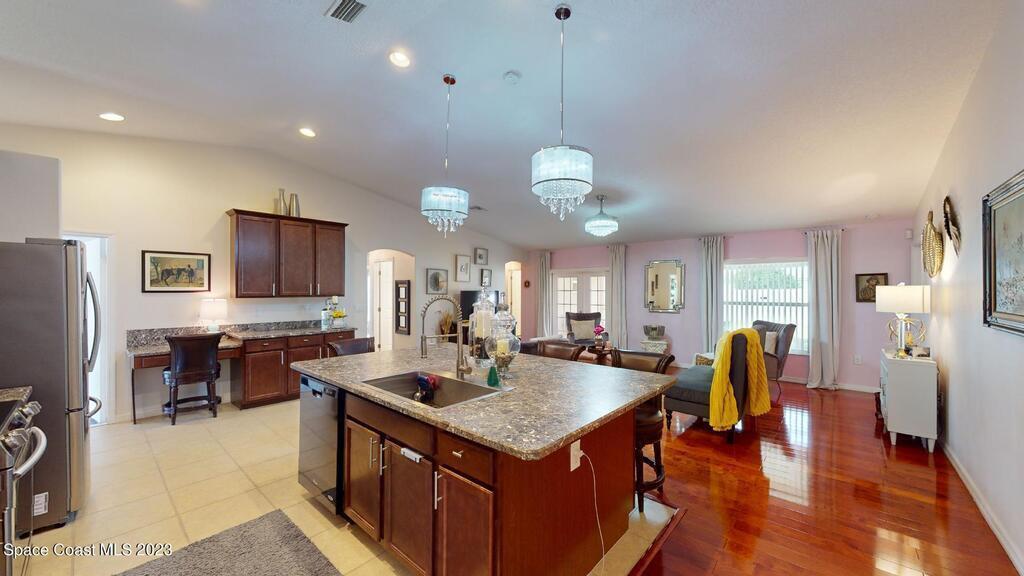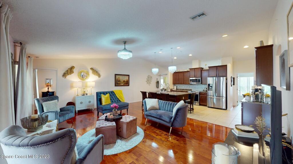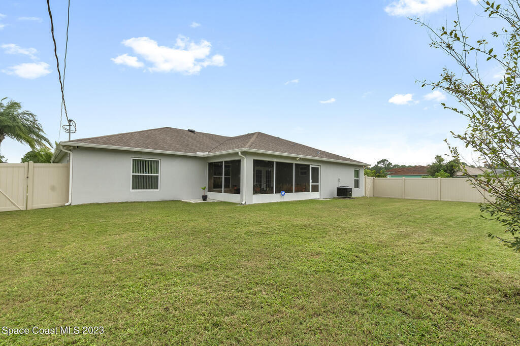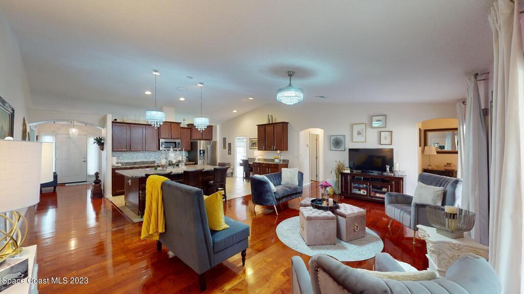 Come see this impeccably maintained, freshly painted, 2016 Avtec home conveniently located in SE Palm Bay, just outside Bayside Lakes with NO HOA! The open concept of this home has a spacious tiled kitchen with an oversized island adjacent to the family room. Main living areas have gorgeous hardwood floors. This 4 bedroom, 3 bath house has an additional bonus room that can be used as an office, playroom, or even a 5th bedroom. Inside laundry room has utility tub and includes the washer and dryer. Family room French doors lead to a large screened-in tiled patio that opens up to fully enclosed backyard with vinyl fence. Reverse osmosis water system, ADT security system, brand new water heater, and impact windows along with additional hurricane shutter panels are bonus features of this home.
