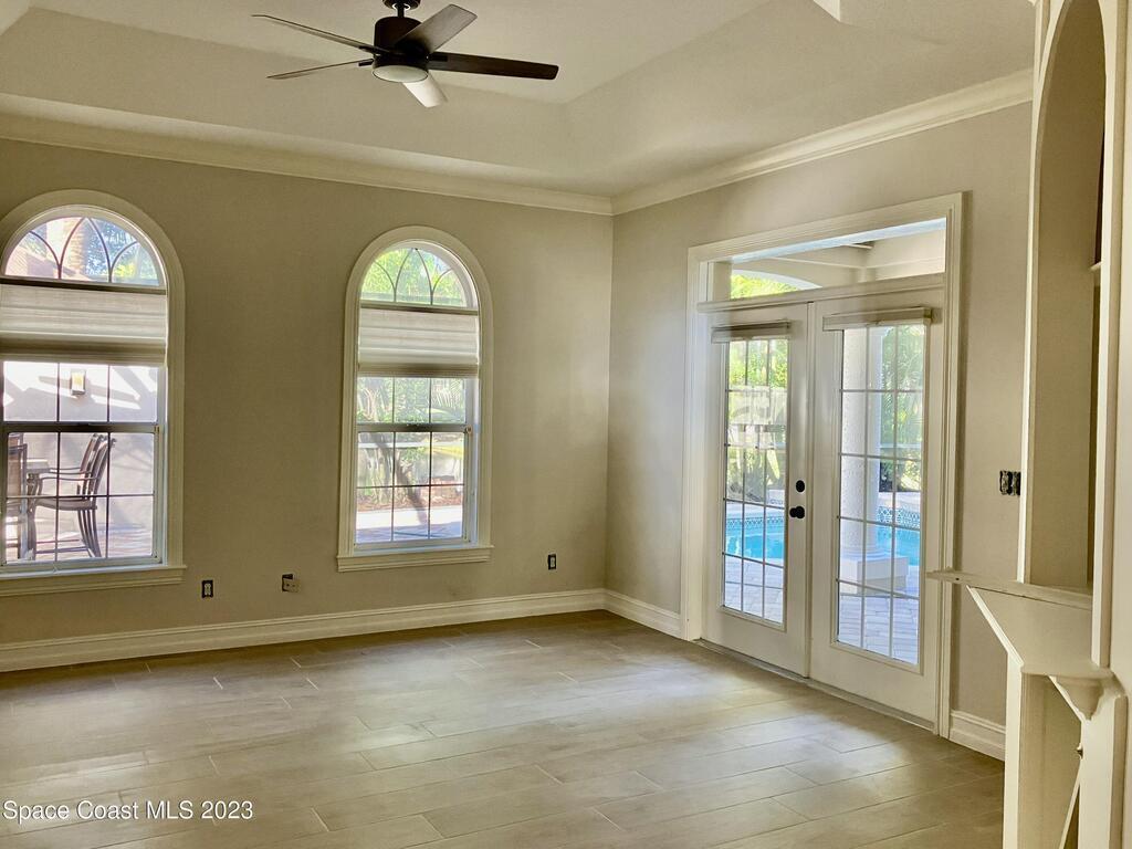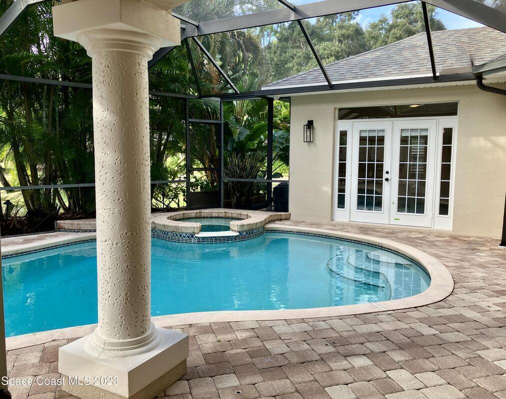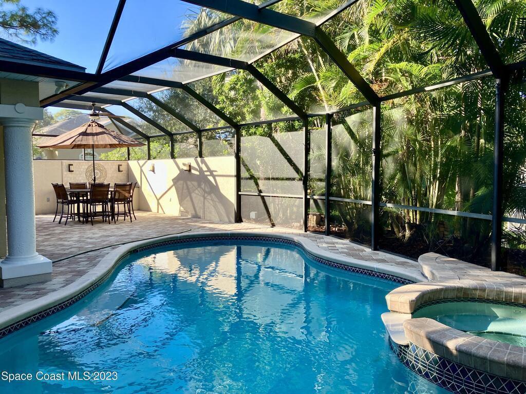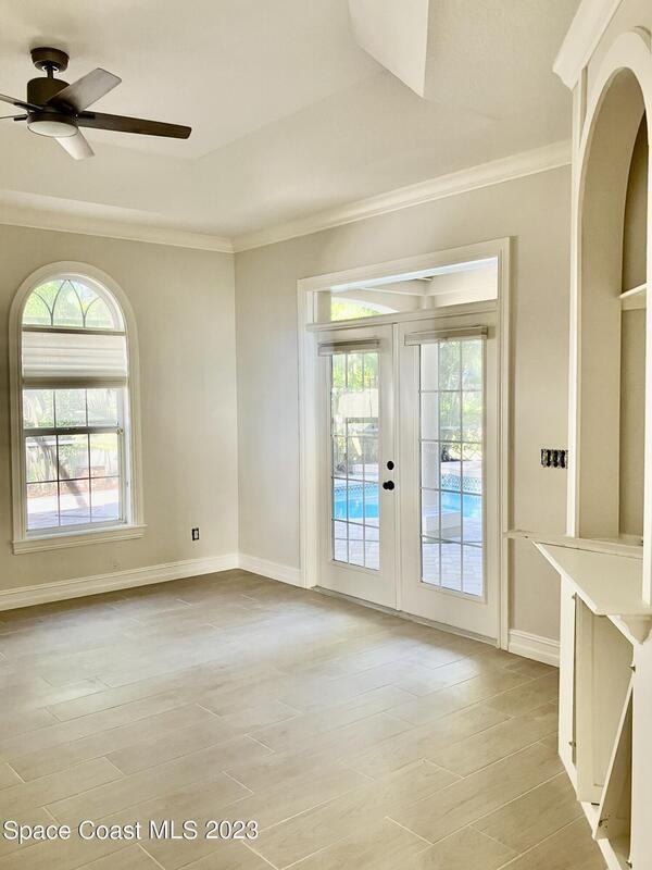 Work from home in the PRIVATE OFFICE of this tastefully updated home in the lovely location of Waterside Dr in South Merritt Island. Office is located at the rear of the home in the OWNERS RETREAT which also includes the bedroom, large walk in closet, full bath & French doors to POOL. Adjacent to the retreat is the room perfect for nursery, child's room, yoga room, etc.The home is designed for entertaining with bright & open living and dining rooms, kitchen with breakfast nook, family room with gas fireplace, and a full bath with access to the POOL. All overlook the spacious lanai, solar heated screened pool, and screened terrace. Large FENCED YARD has paver areas for play. Upstairs features 2 bedrooms which share an under roof screened porch overlooking the pool