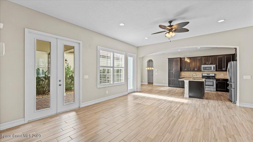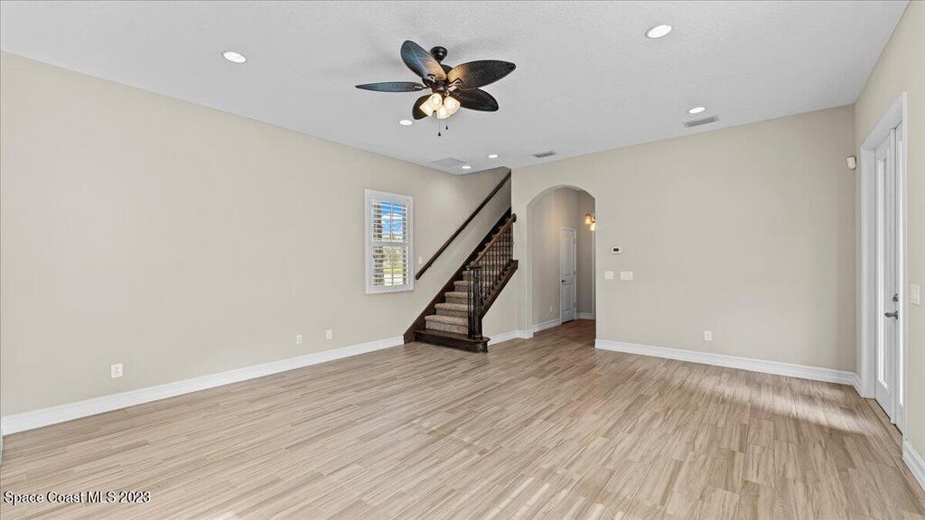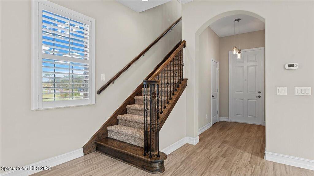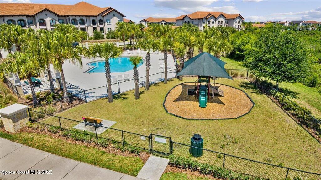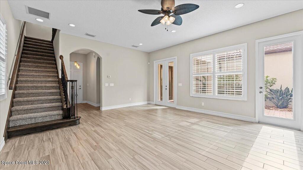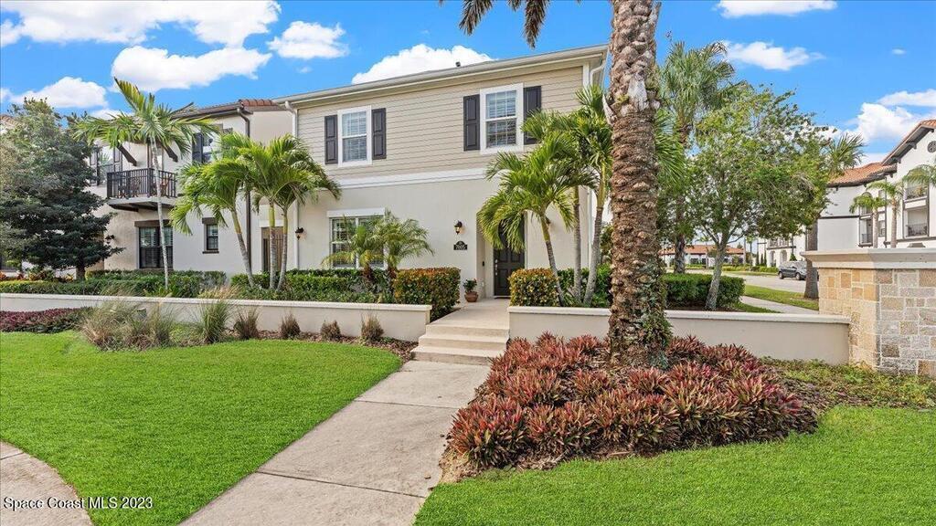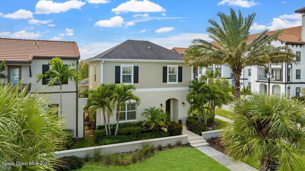 Rocket launch views are awaiting you at this beautiful Merida floor plan located in the highly sought after community of Arrivas Village. The maintained community offers its own pool & dog park while being located in the heart of the top 10 master-planned community of Viera! Restaurants, shopping and golf are within walking distance or a short golf cart ride! This 4 bed, 3.5 bath open concept floor plan offers a spacious kitchen with huge island for entertaining & large great room with lots of windows and french doors which allow light to pour into the home. One bedroom downstairs is perfect for guests, in-laws or an office. The hall bath provides a walk-in shower for those unable to walk upstairs. On the second floor two bedrooms are separated from the master with a jack & jill bath and