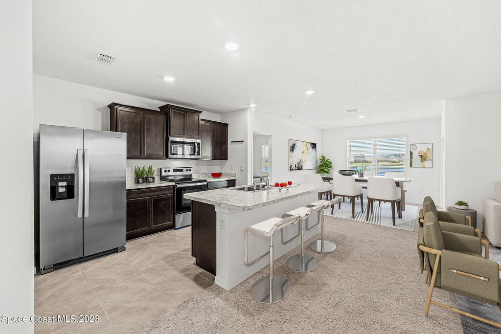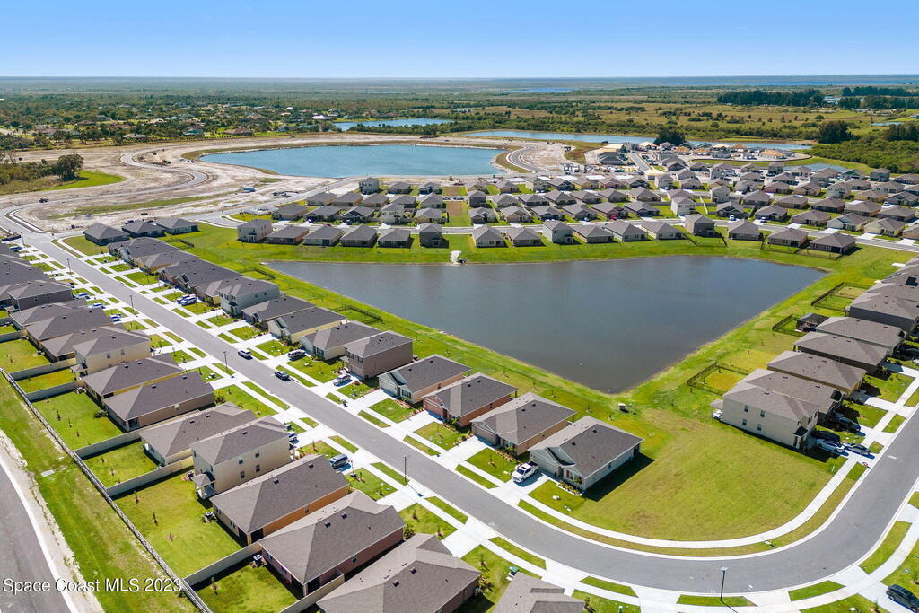 Why on earth would you wait to build when you can buy this BRAND NEW all-American beauty & move in NOW? Nicely nestled on a shimmering lake, the happy home offers window treatments & bright, open spaces. A generous great rm flows into a spacious dining area & a modern island kitchen w/dark cabinetry & sleek SS appliances. The breakfast bar is ideal for party appetizers, morning coffee & after-school snacks. Rest & relax in the primary retreat featuring water views, a walk-in closet, double sinks & a shower. The 2nd tub/shower bath sits between 2 extra bdrms, a comfortable composition for kids, guests, or in-laws. Sliders off the spacious dining area lead to an airy lanai overlooking a grassy backyard & the sparkling lake. Washer & dryer included! Make a splash at the community pool!