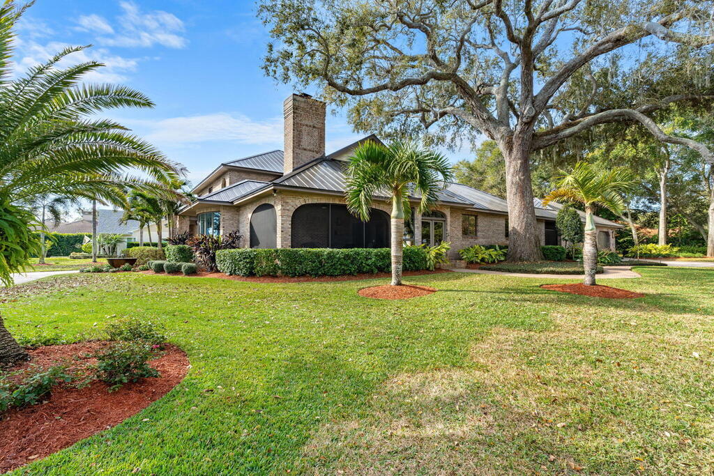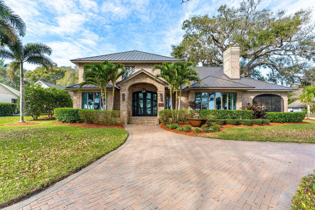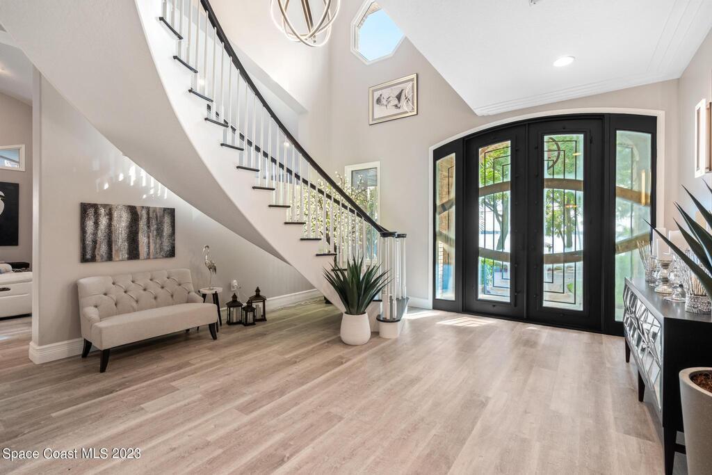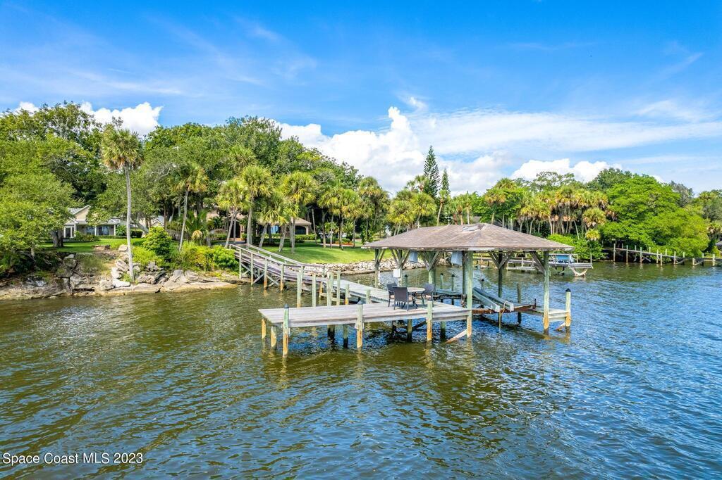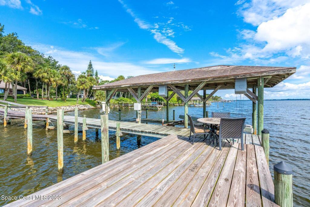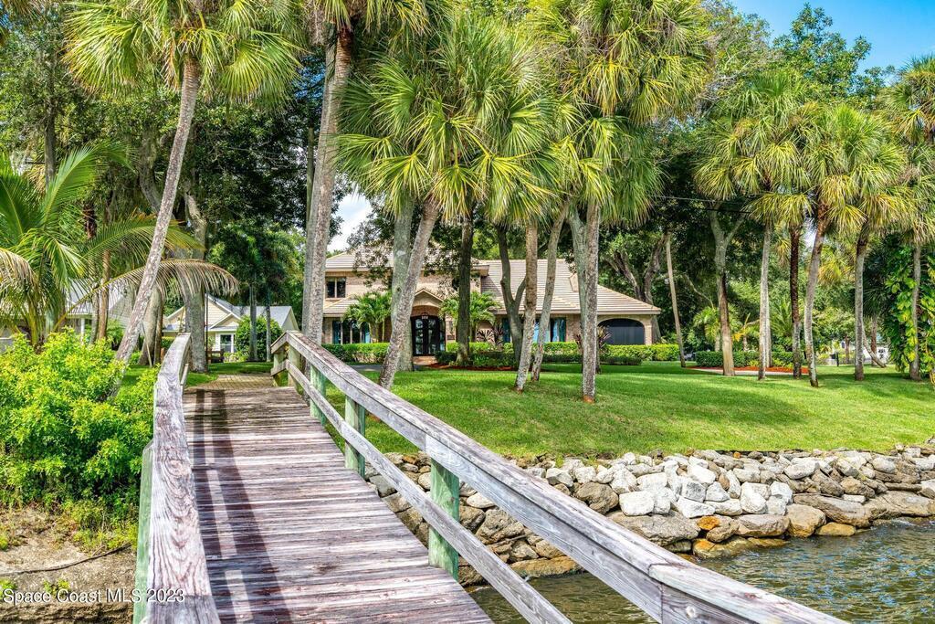 130ft of Indian Riverside frontage, a private boat dock & an elegant estate full of classic beauty! Softly lit ceilings tower over big windows streaming natural light throughout. Solid teak hardwood & LVP floors span open, sophisticated living & dining spaces. Bay windows, a marble fireplace & luxury finishes add custom flair. Showcasing a quartz waterfall-edge island, the kitchen exhibits white glass-accented cabinetry, a butler's pantry, Bosch SS appliances, double wall ovens, a gas stove & wine cooler. The 1st-floor owner's retreat features a sitting area w/riverfront views, floating vanities, a jetted tub & bench shower. A curved staircase leads up to a loft, 2bdrms & full bath. A 2024 metal roof. 2 breezy screened lanais offer tranquil water features, backyard & river views!